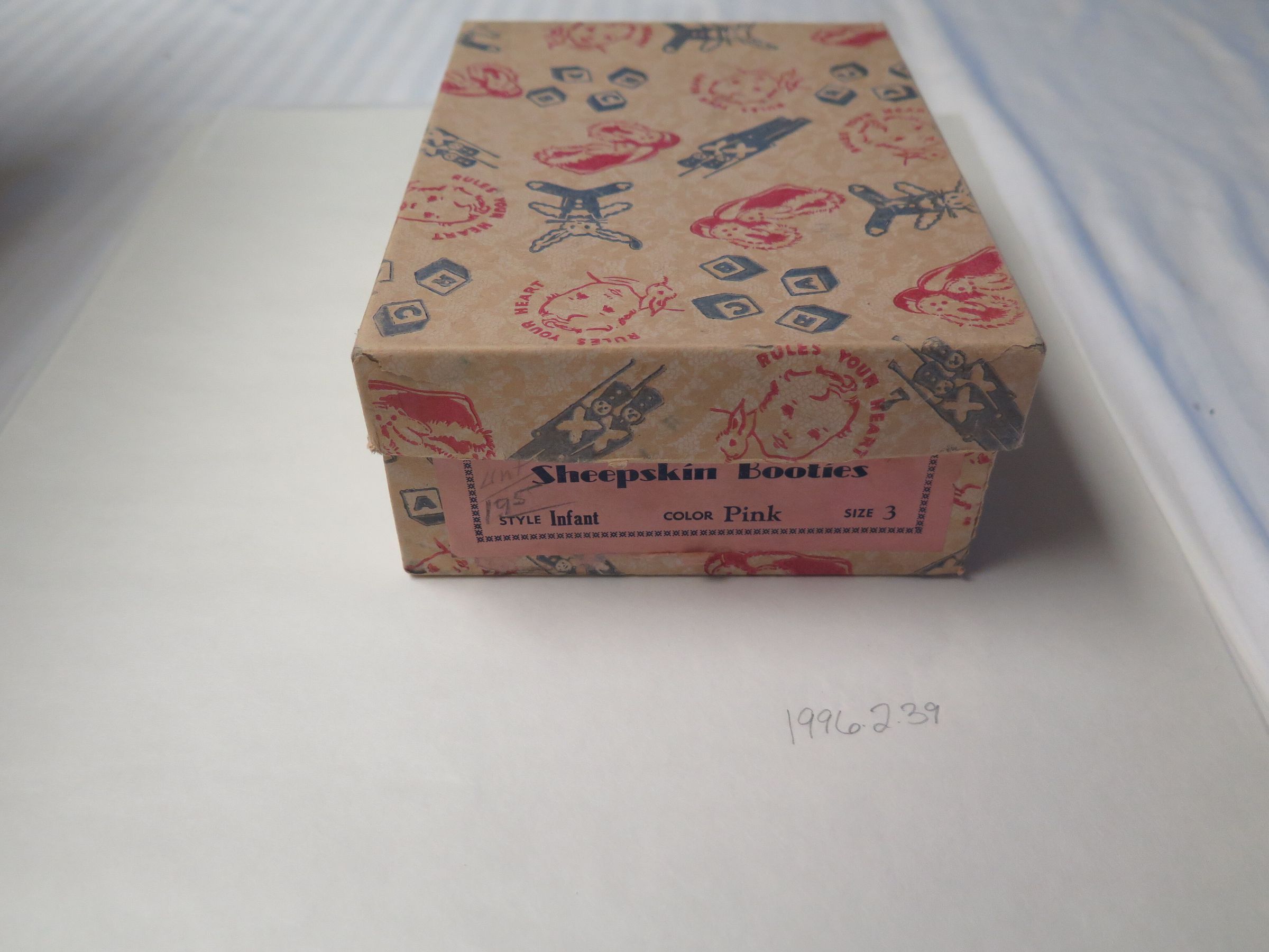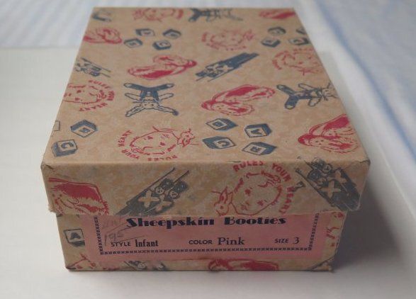 This is a box for infant Sheepskin Booties with the lid. The box is off-white with red and blue children's toys printed all over it. The pink tag on the side of the box gives information about the shoes that were once in the box. In blue text, the tag reads "Sheepskin Booties/ Style Infant, Color Pink, Size 3".