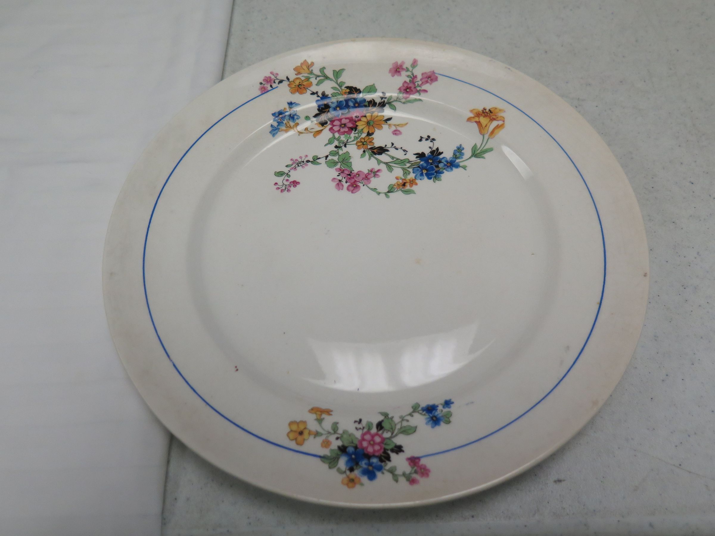 This is a white decorative plate with a blue stripe around the edge and flowers near the middle. The plate measures 1" (h) x 9.25" (dia).