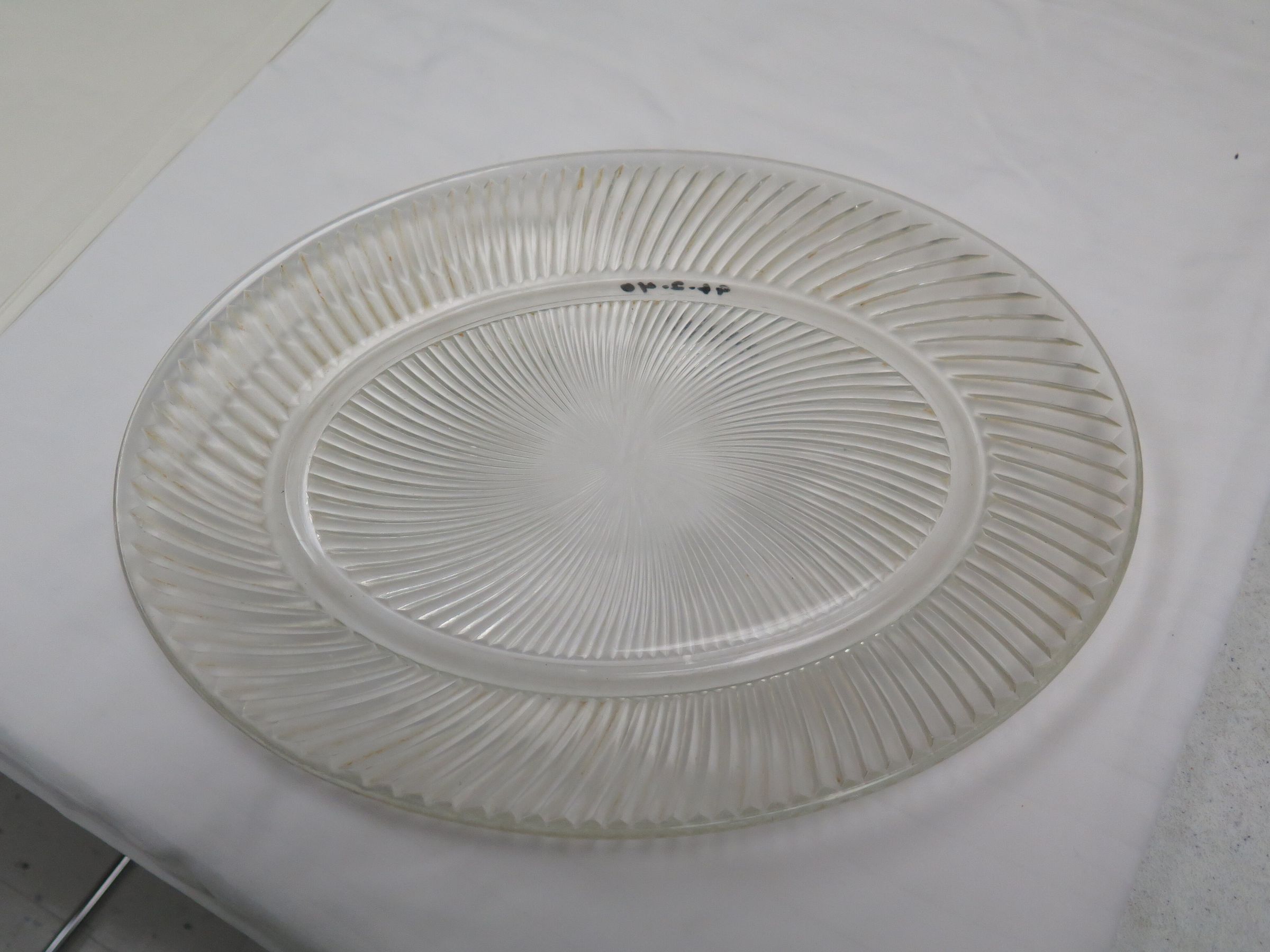 This is a clear glass, ribbed platter. The platter measures 1" (h) x 11.75" (w) x 9" (d).