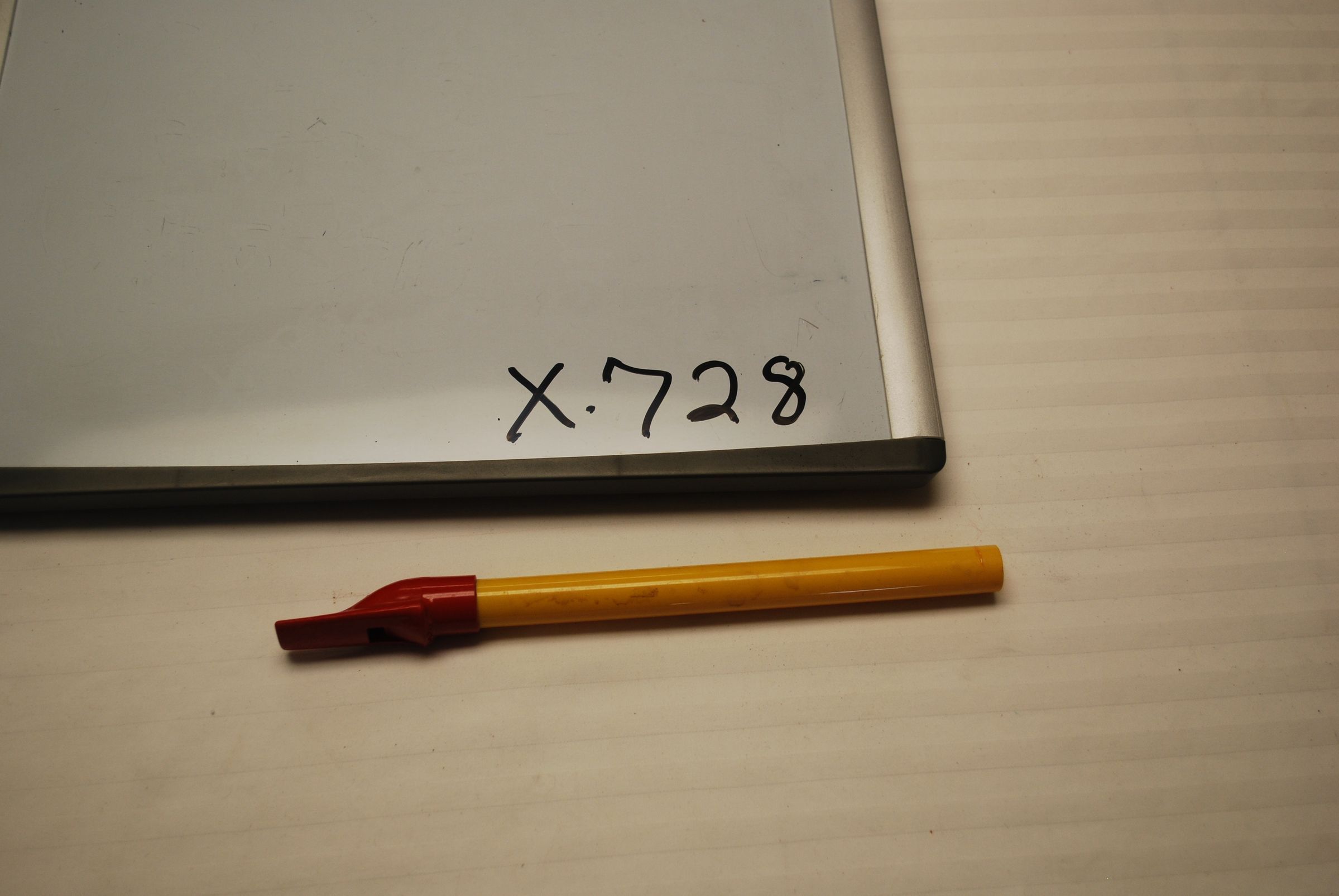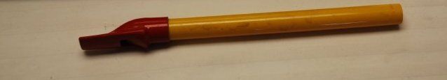This is a set of 4 plastic toys. The set includes a pipe, two flutes, and a whistle. The whistle is yellow. The pipe is red with a white mouth piece. The smaller flute is white with a red mouth piece. The larger flute is yellow with a red mouth piece. The toys each measure 0.5" (h) x 5" (l), except the larger flute which is 0.5" (h) x 9.5" (l).Collection