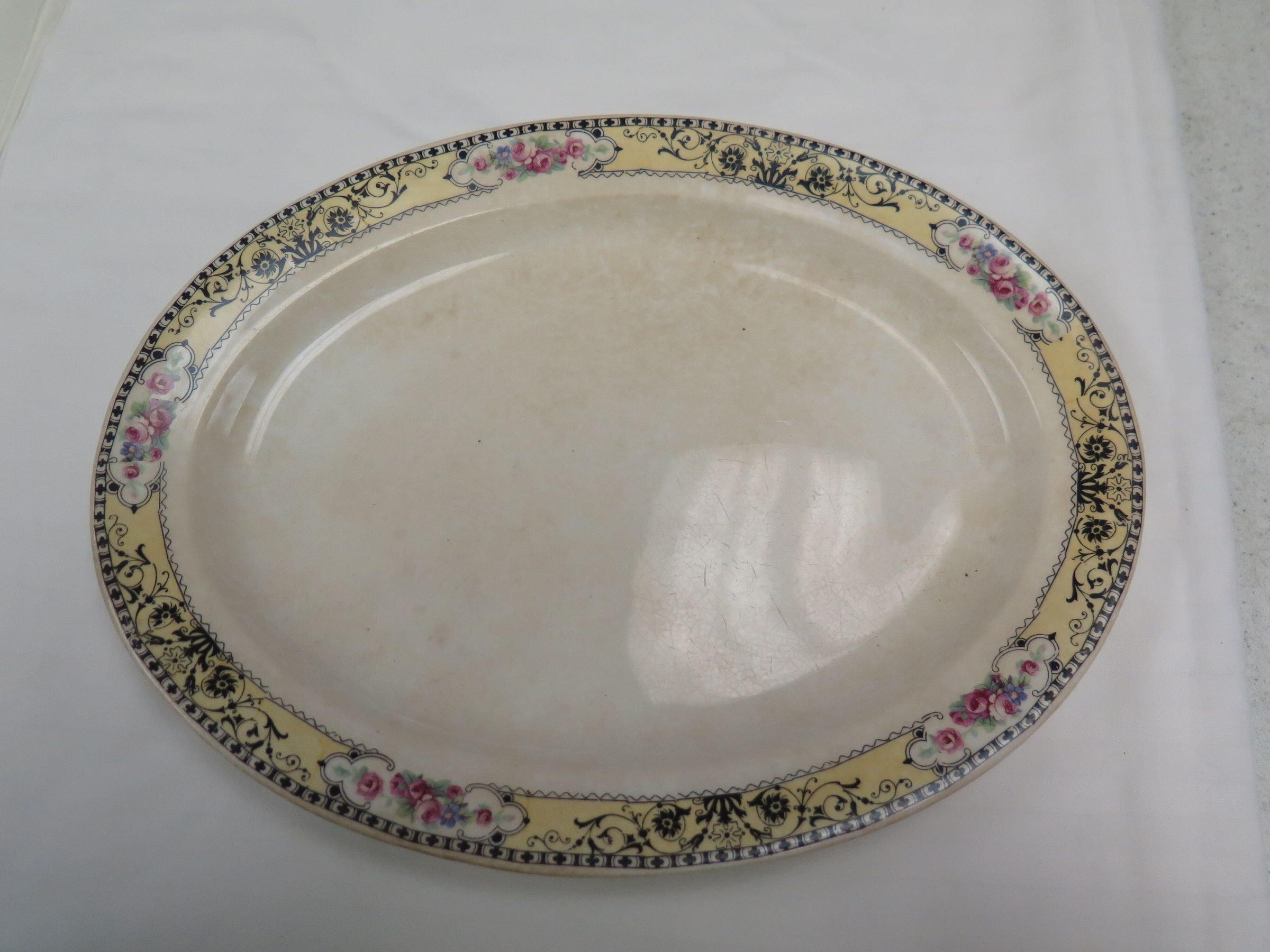 Platter made in St. Charles Iowa. The platter has a yellow and black rim with a floral pattern on it. The platter measures 1" (h) x 10.5" (w) x 8" (d).
