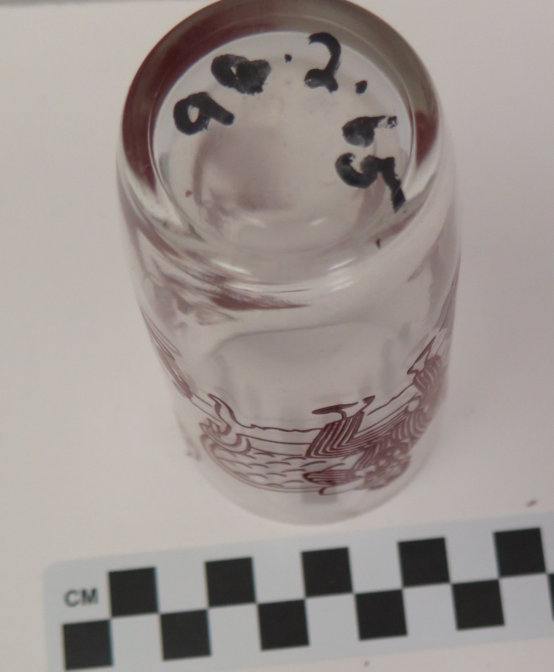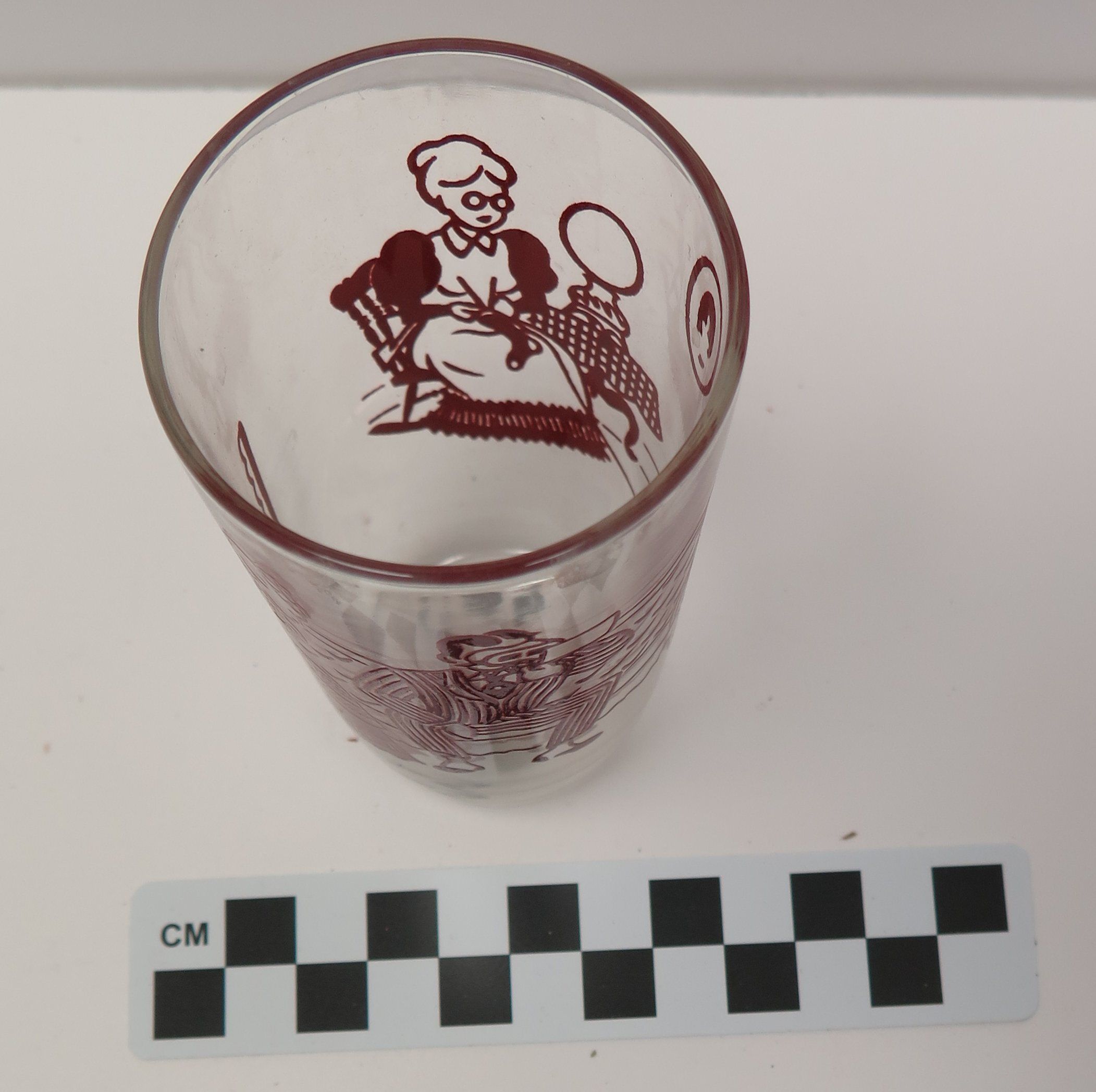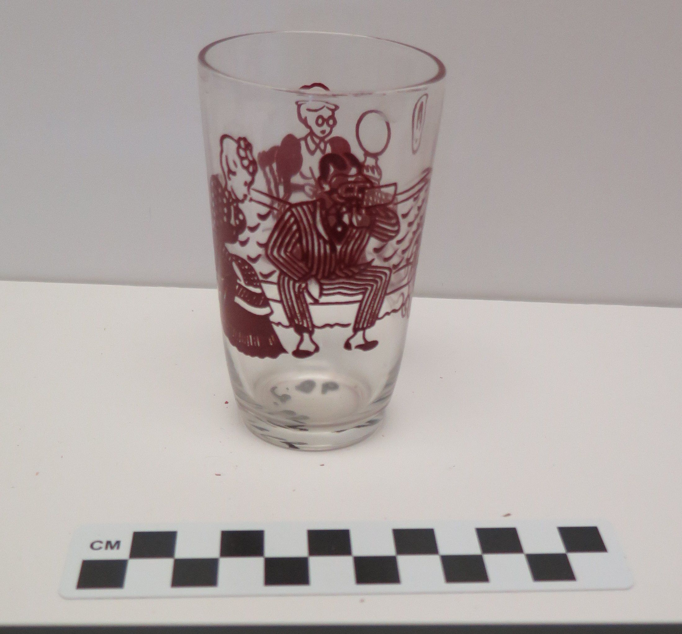 This is a clear glass tumbler with images of people on the sides in red. 3.75"(H) x 2.125"(Dia)