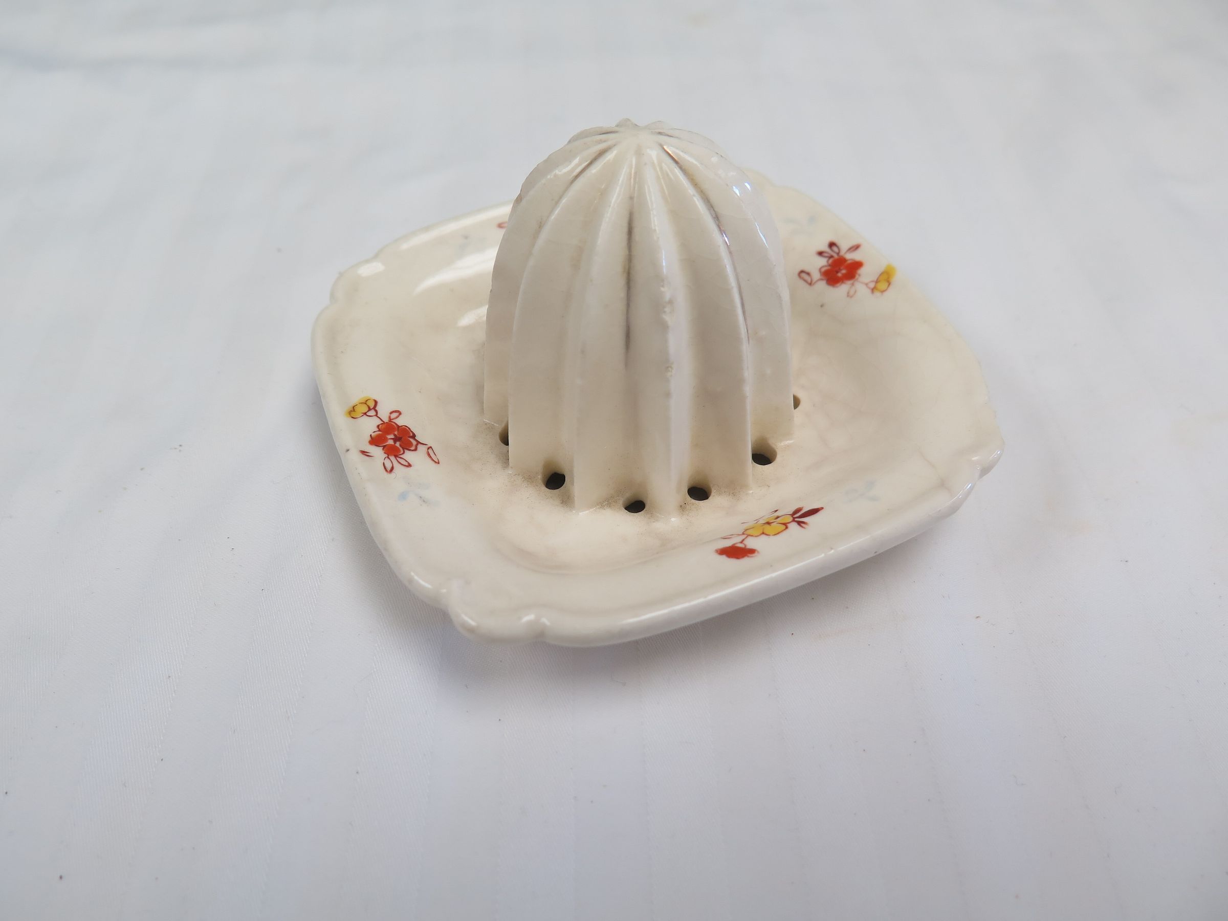 This is a white ceramic hand juicer or reamer. There are yellow and orange flowers painted on each of the 4 sides of the base of the juicer. The juicer measures 2.5" (h) x 3.5" (w) x 3.5" (l).
