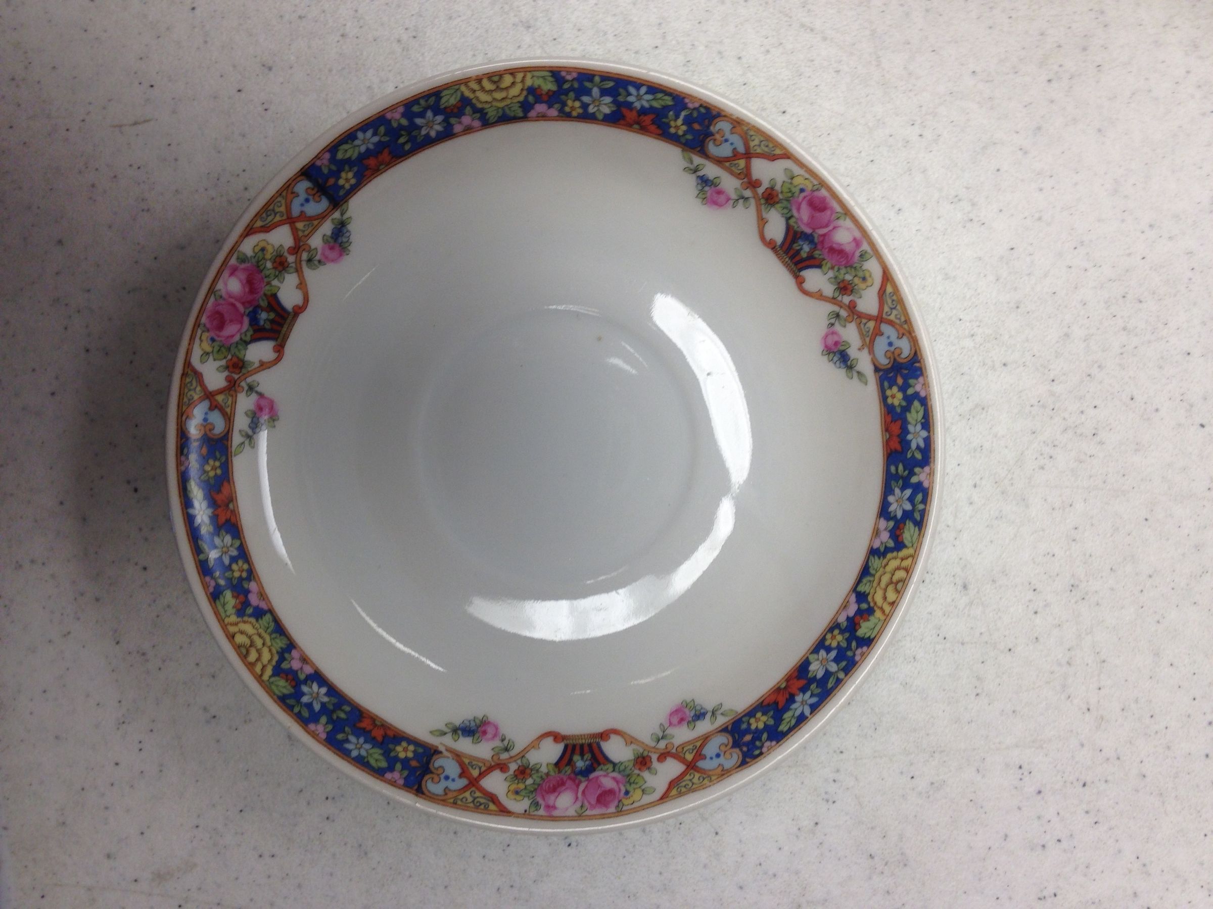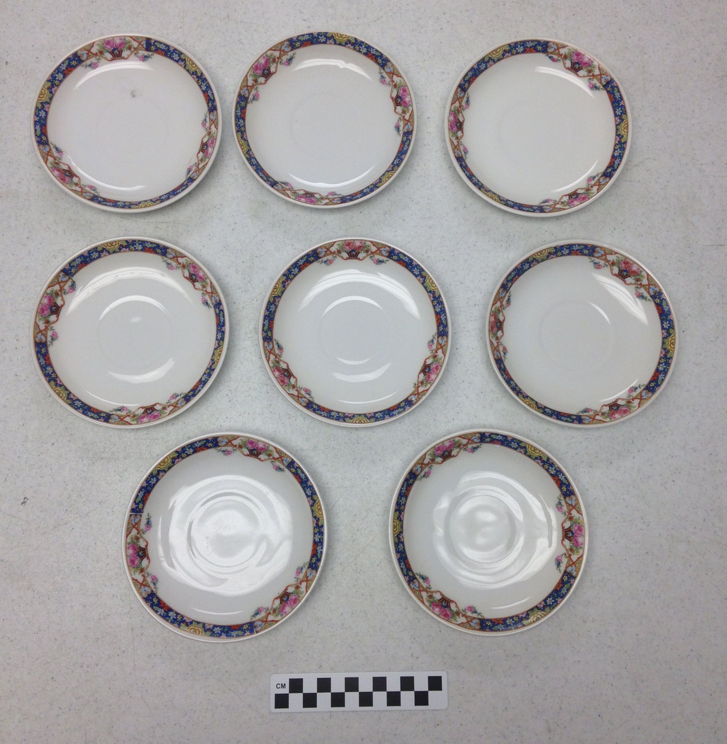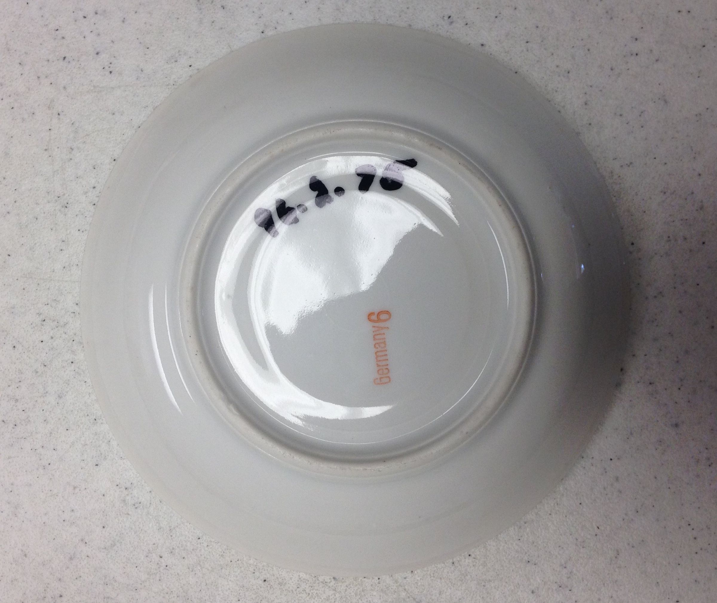 This is a set of 8 saucers from Germany. The saucers are white with a blue and floral pattern around the edges. The back of each plate has orange text that reads, "Germany 6". The saucers are slightly deeper than an average saucer. Each saucer measures 0.75" (h) x 5.75" (dia).