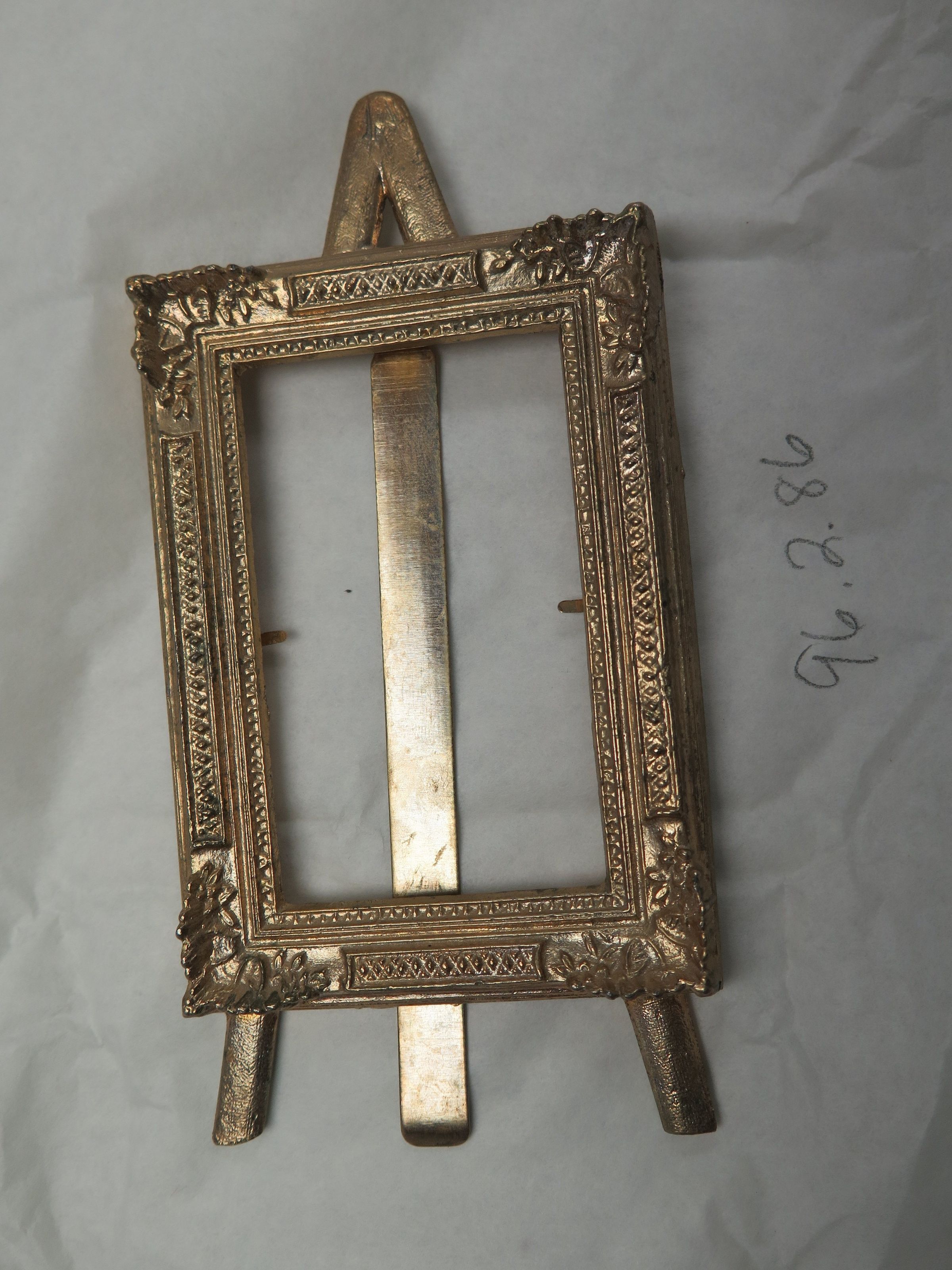 This is a gold plated picture frame with a bar at the back to prop it up without hanging it on a wall. The frame measures 6" (h) x 3" (w).