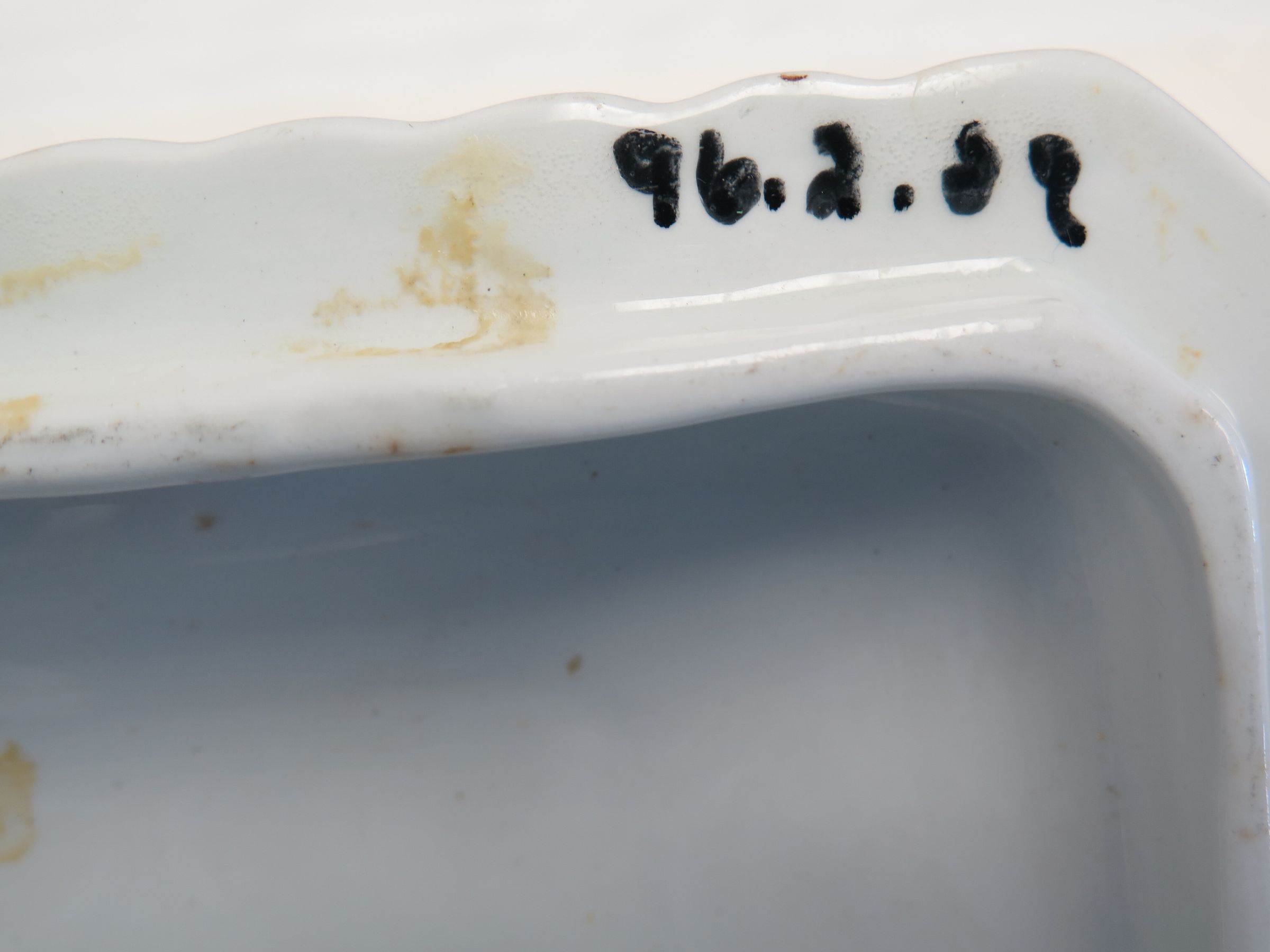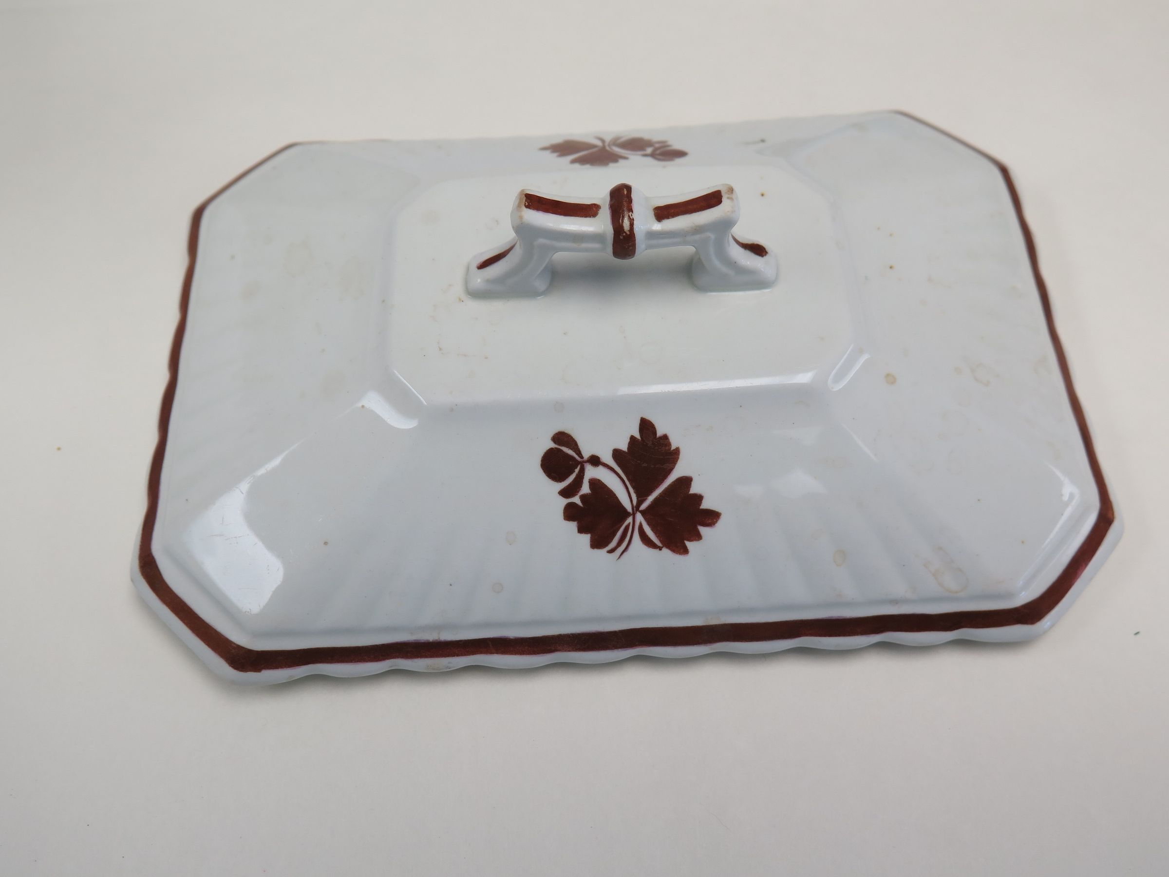 This is a white ceramic lid to a dish. The lid has brown metalic leaves painted on it, a brown stripe around the edge, and a handle on the top. The lid measures 3" (h) x 8" (w) x 5.5" (l).Collection