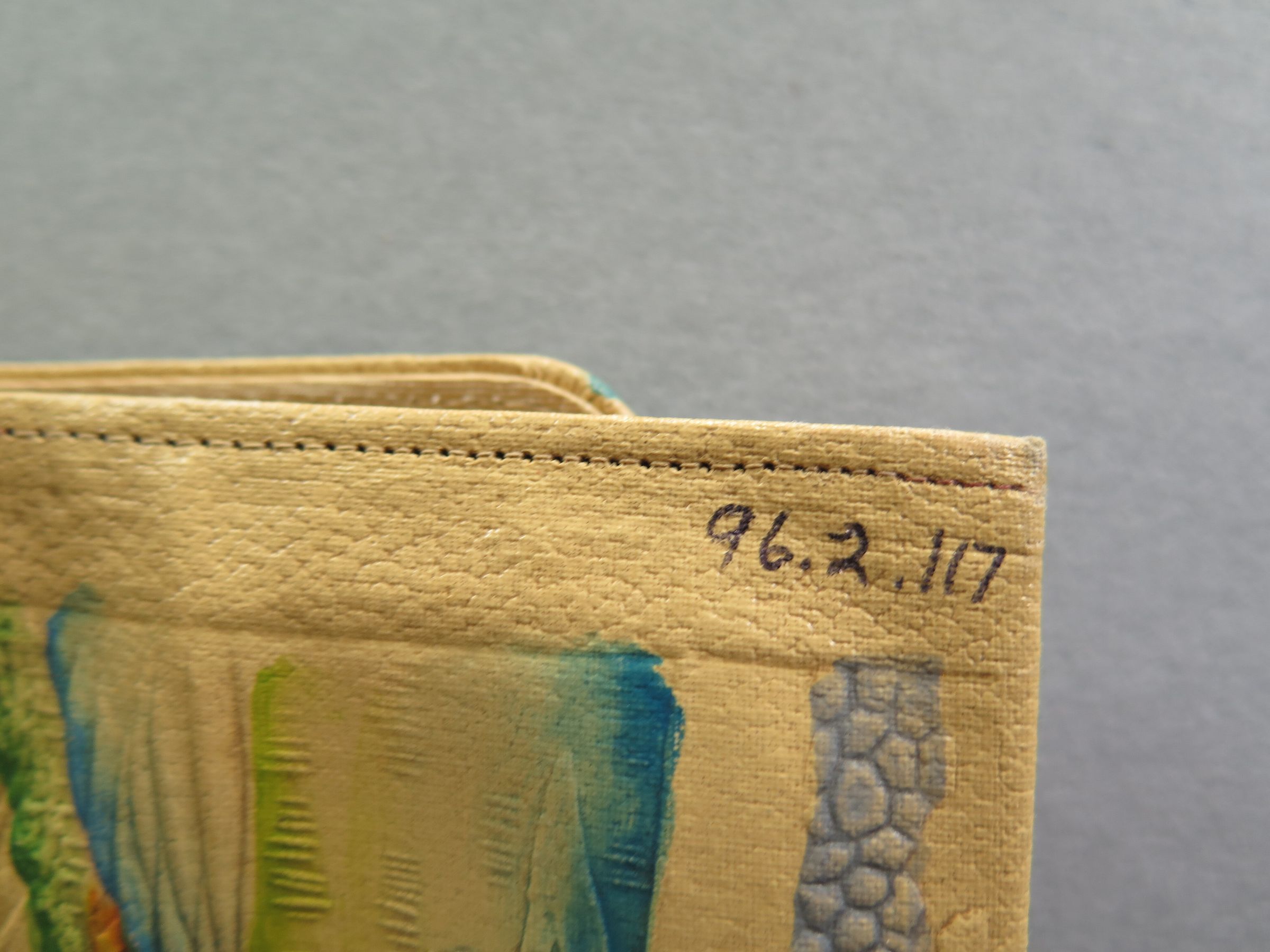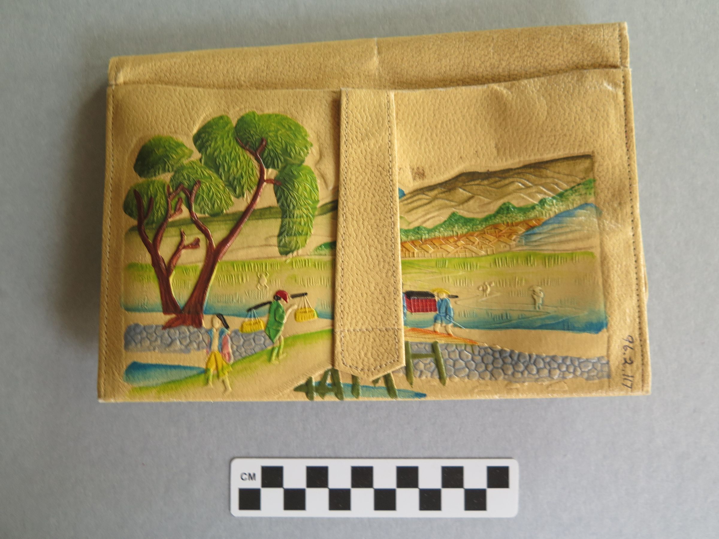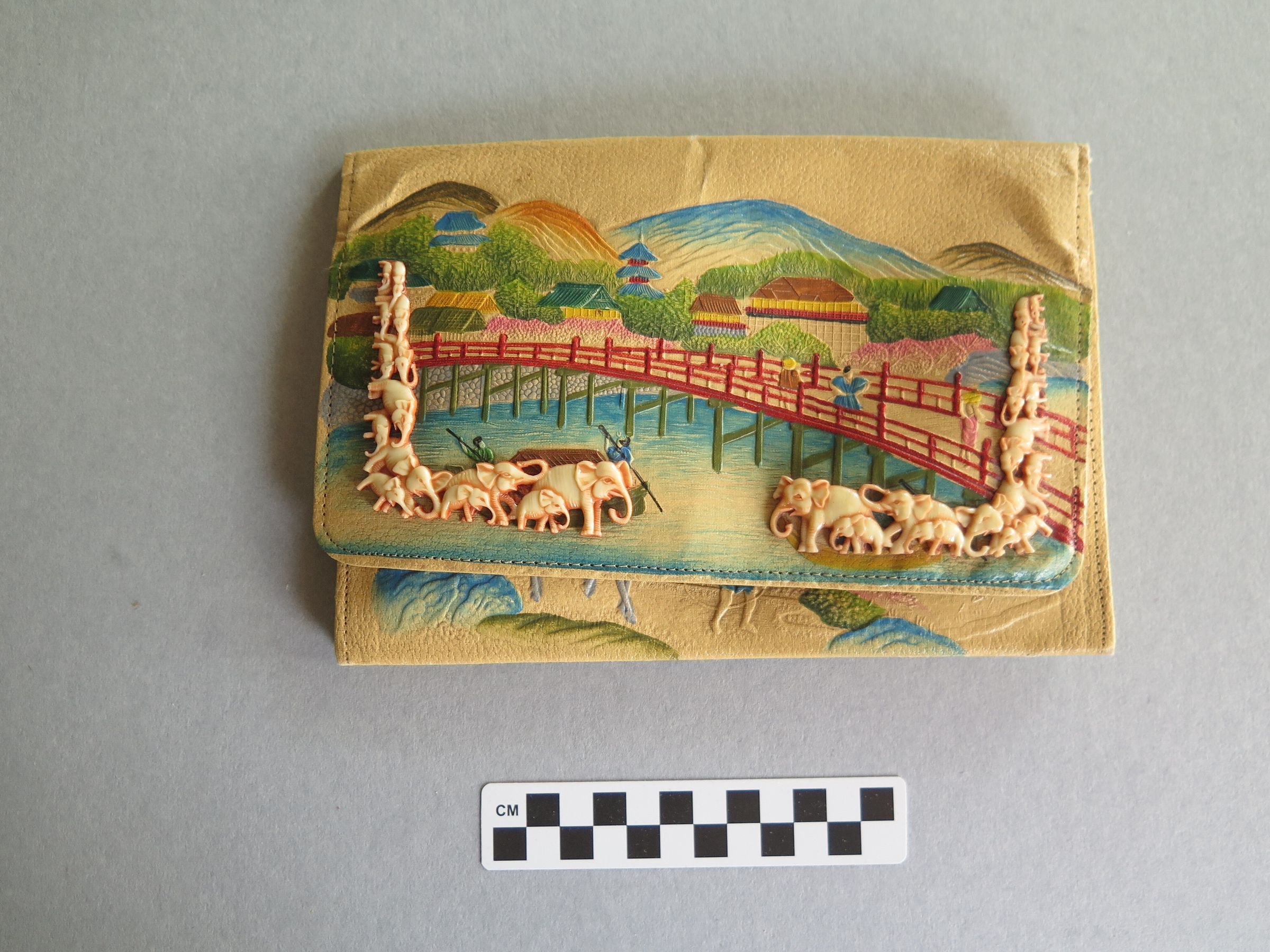 Purse designed with an Asian theme. Pictures a river, a bridge, a few houses and mountains in the background. There a few people on boats in the river and walking along the bridge. There are elephants sewn on to the front of the purse. The back of the purse pictures a farming village with a large tree in the corner. There are people walking the road with bales on their shoulders. When open the purse has many pockets and appears to be more of a clutch or wallet. Purse measures 6.25" (w) x 9.5" (l).