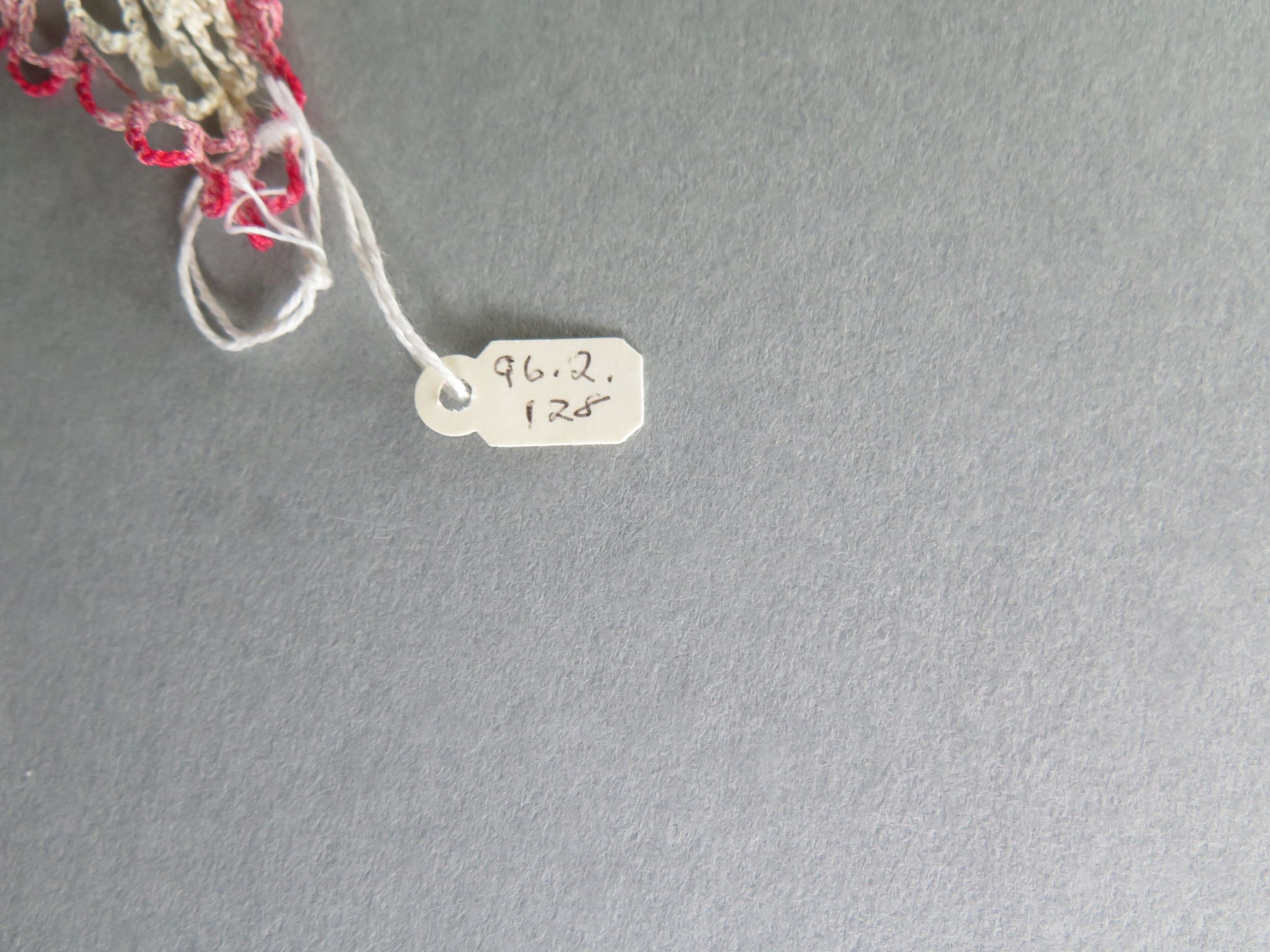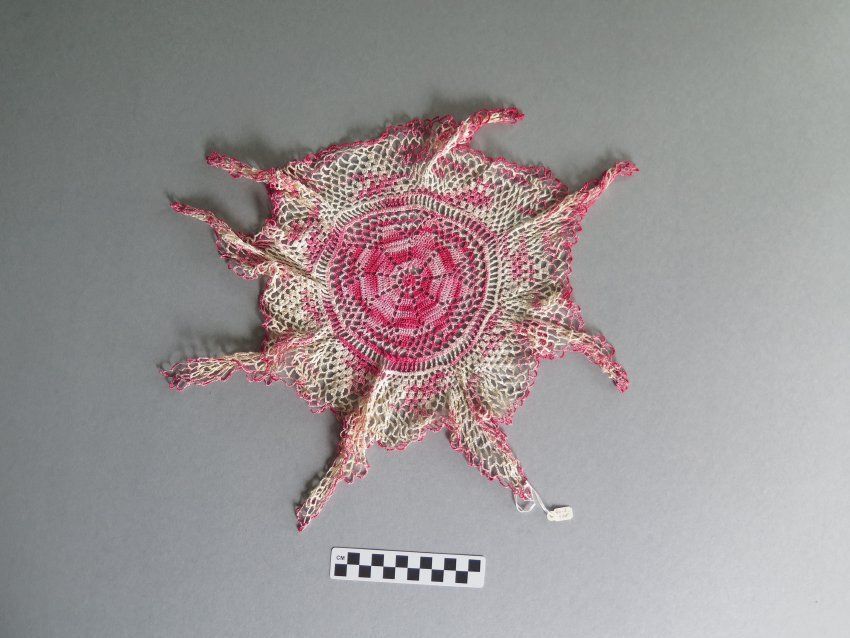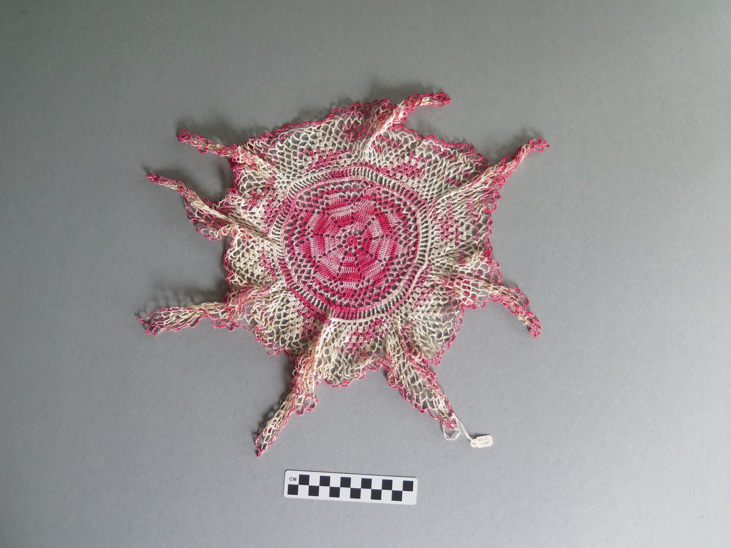 White and pink circular doily in a star or sun like shape. There are 8 longer pieces coming out of the center circular shape. The doily measures 14" diam.