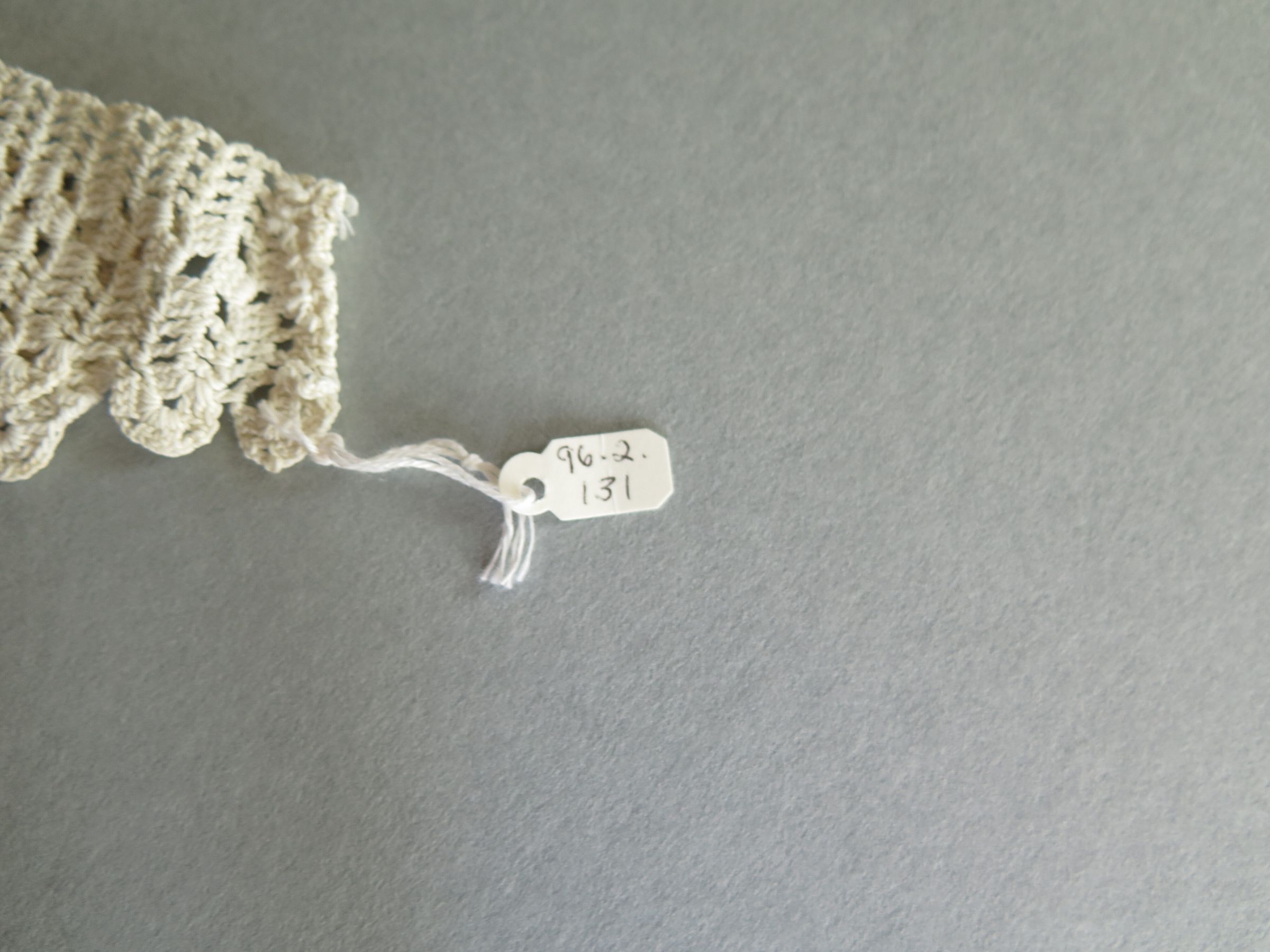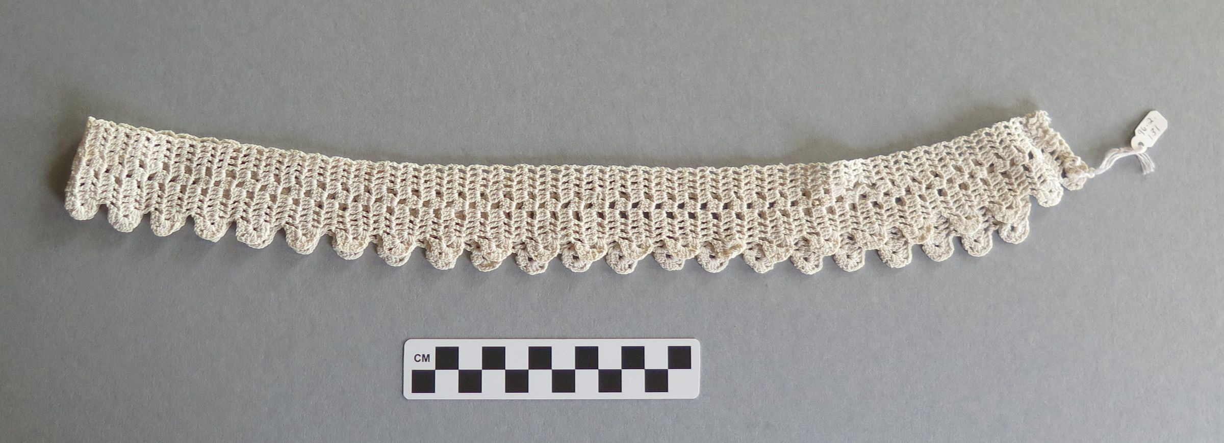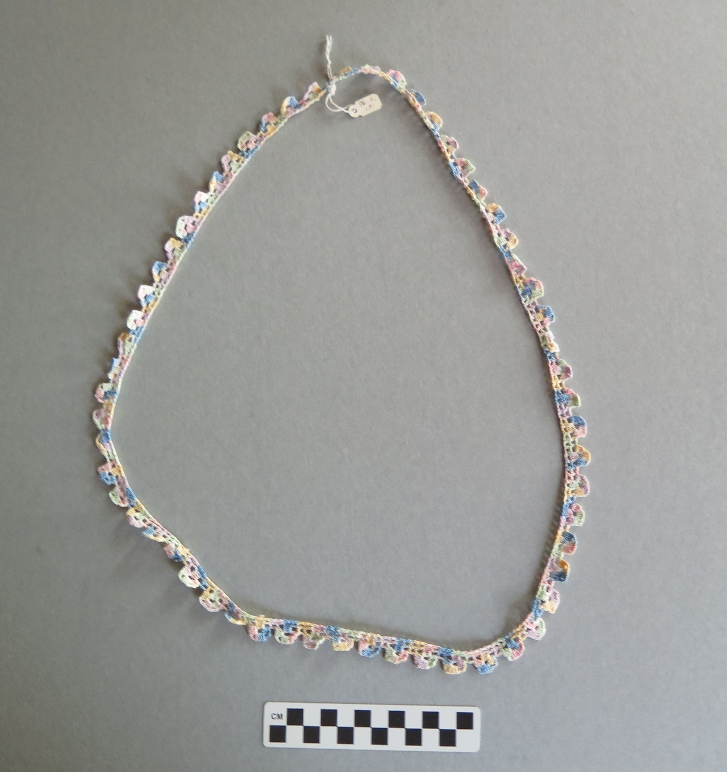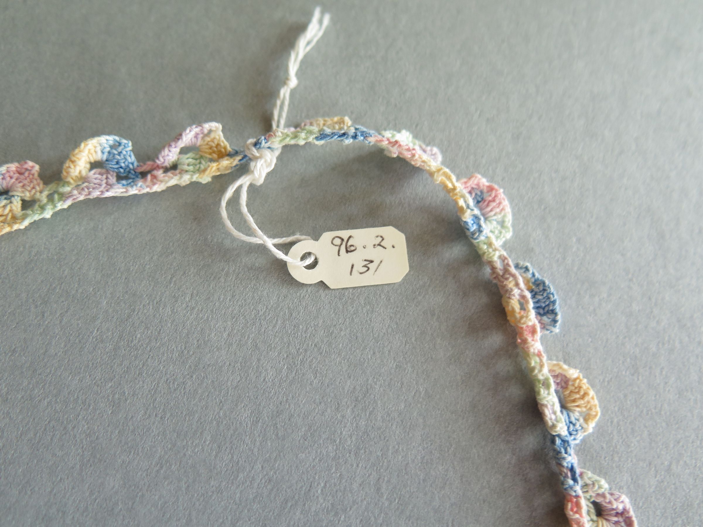 Two pieces of crocher. One is cream and the other is variegated. The cream crochet piece measures 2" (w) x 17.5" (l). The veriegated crochet piece measures 20" (l).