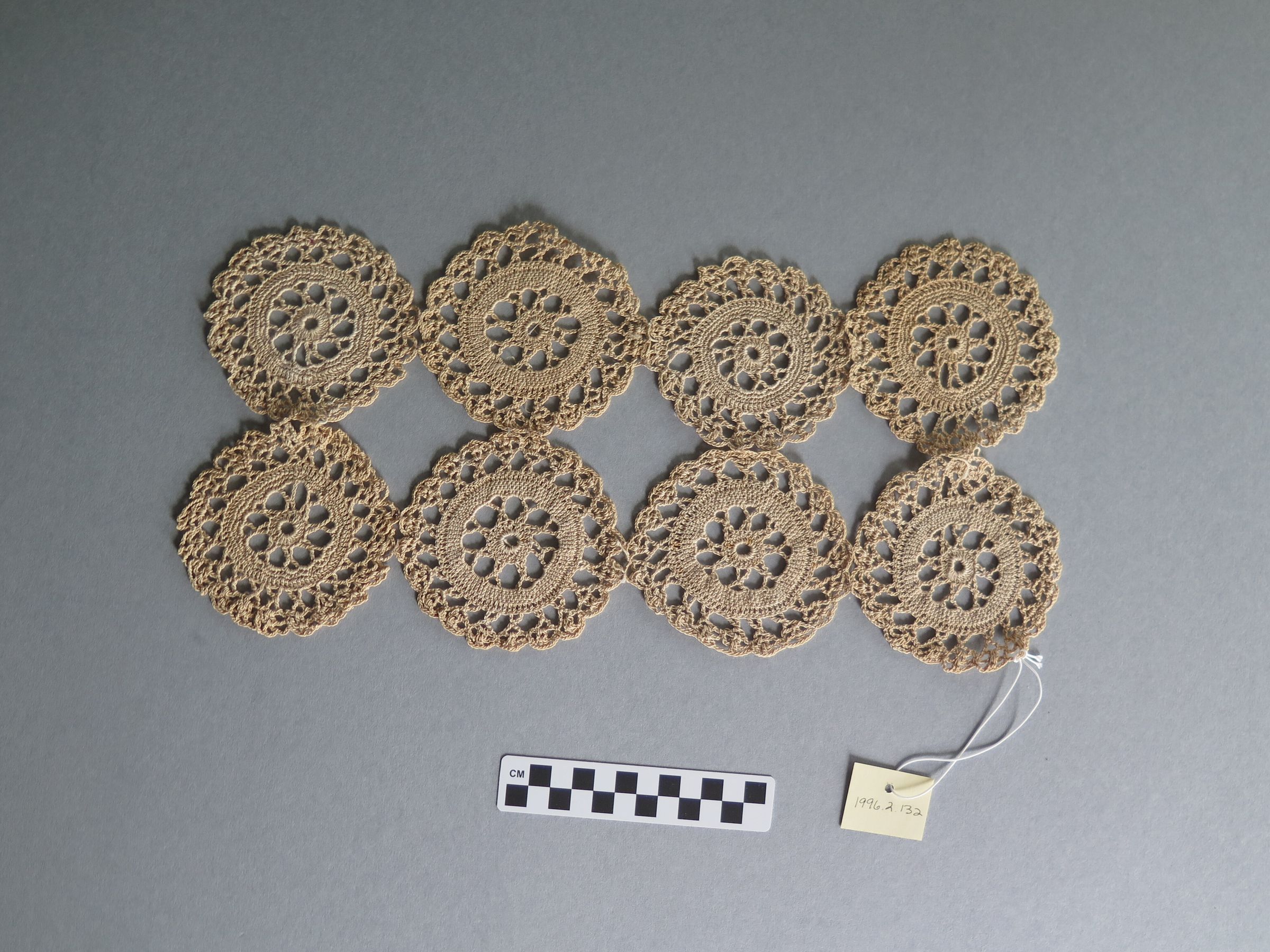 Eight circular tan doilies that are sewn together in a line of two with four doilies in each line. The doily measures 8" (w) x 15.5" (l).