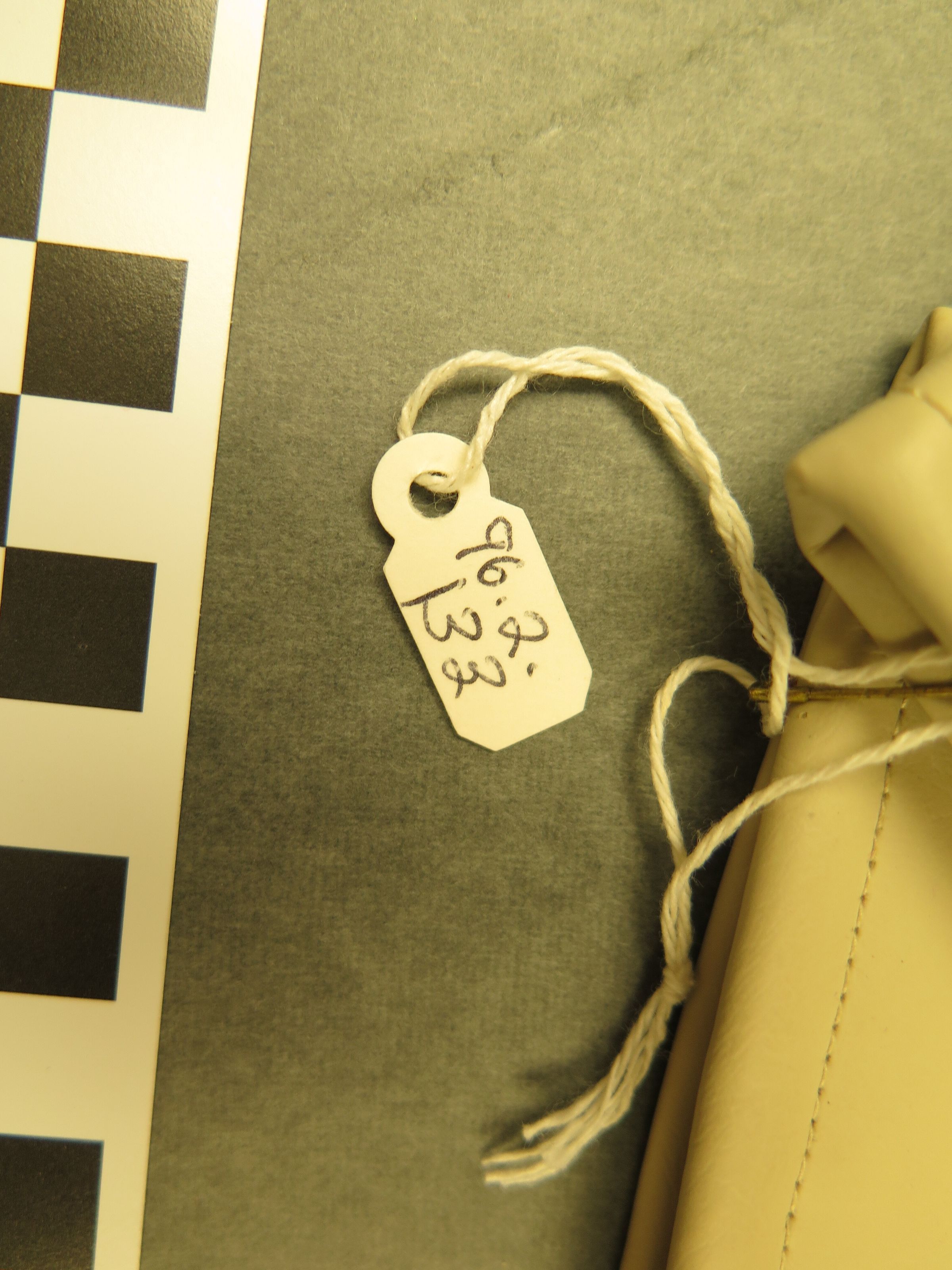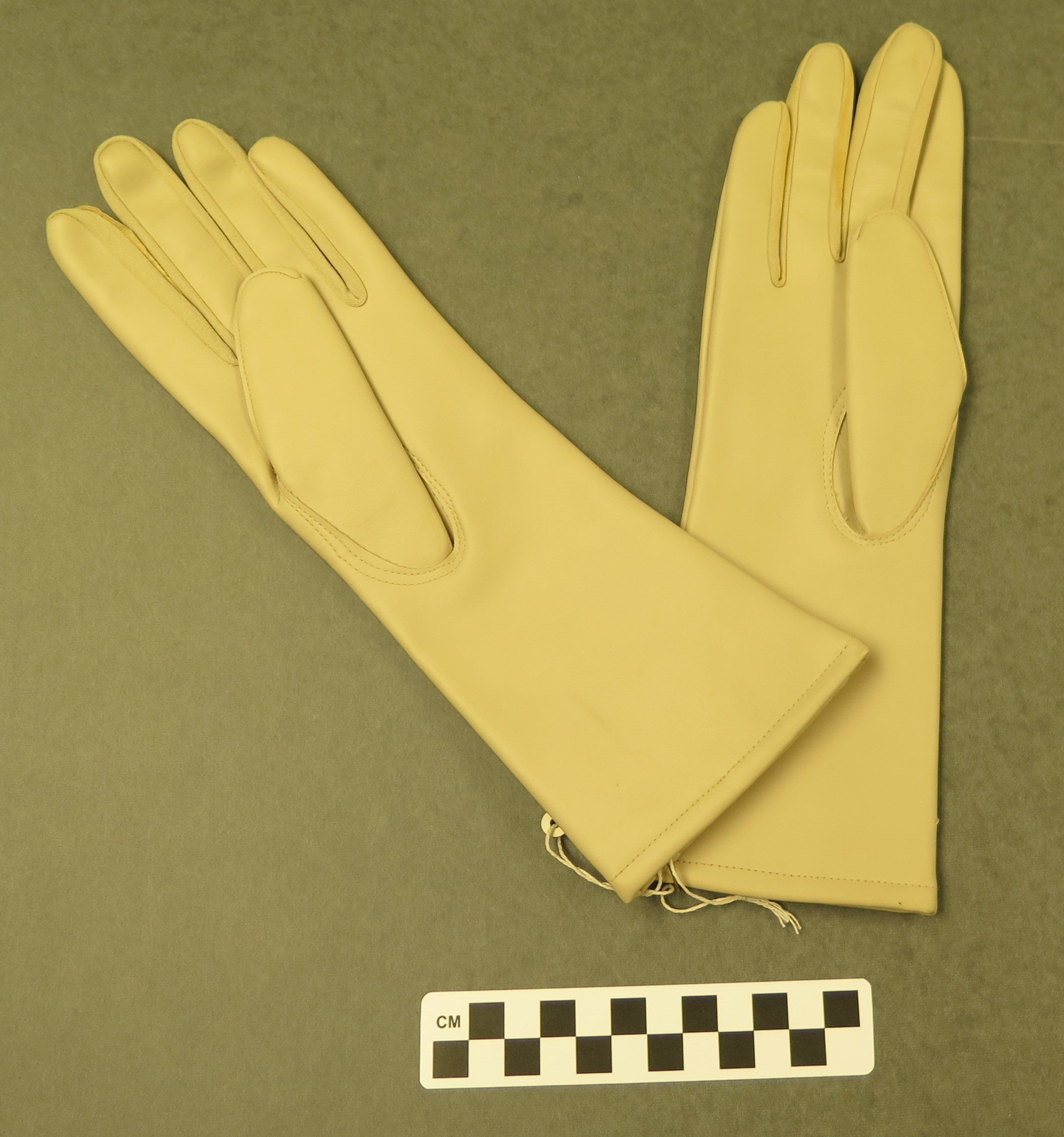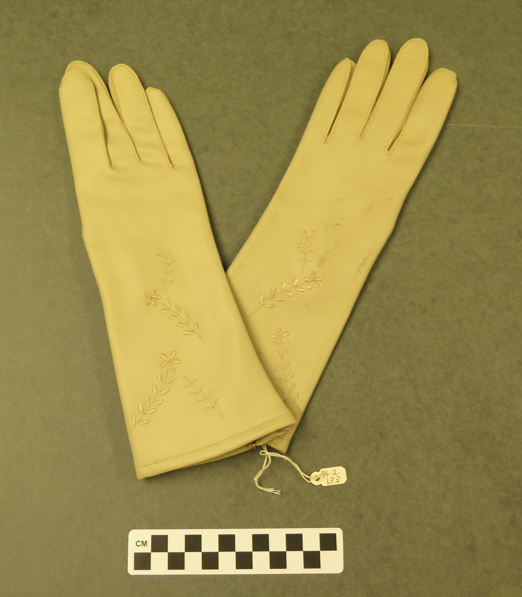 This is a pair of tan faux leather gloves. The back of the gloves has embroidery flower design. The tag inside the gloves has text that reads, "Four Scettes is 100% nylon/ 100% rayon lining/ vinyl body/ Size Large/ Made in Japan". Gloves measure 3" (w) x 12" (l).Collection