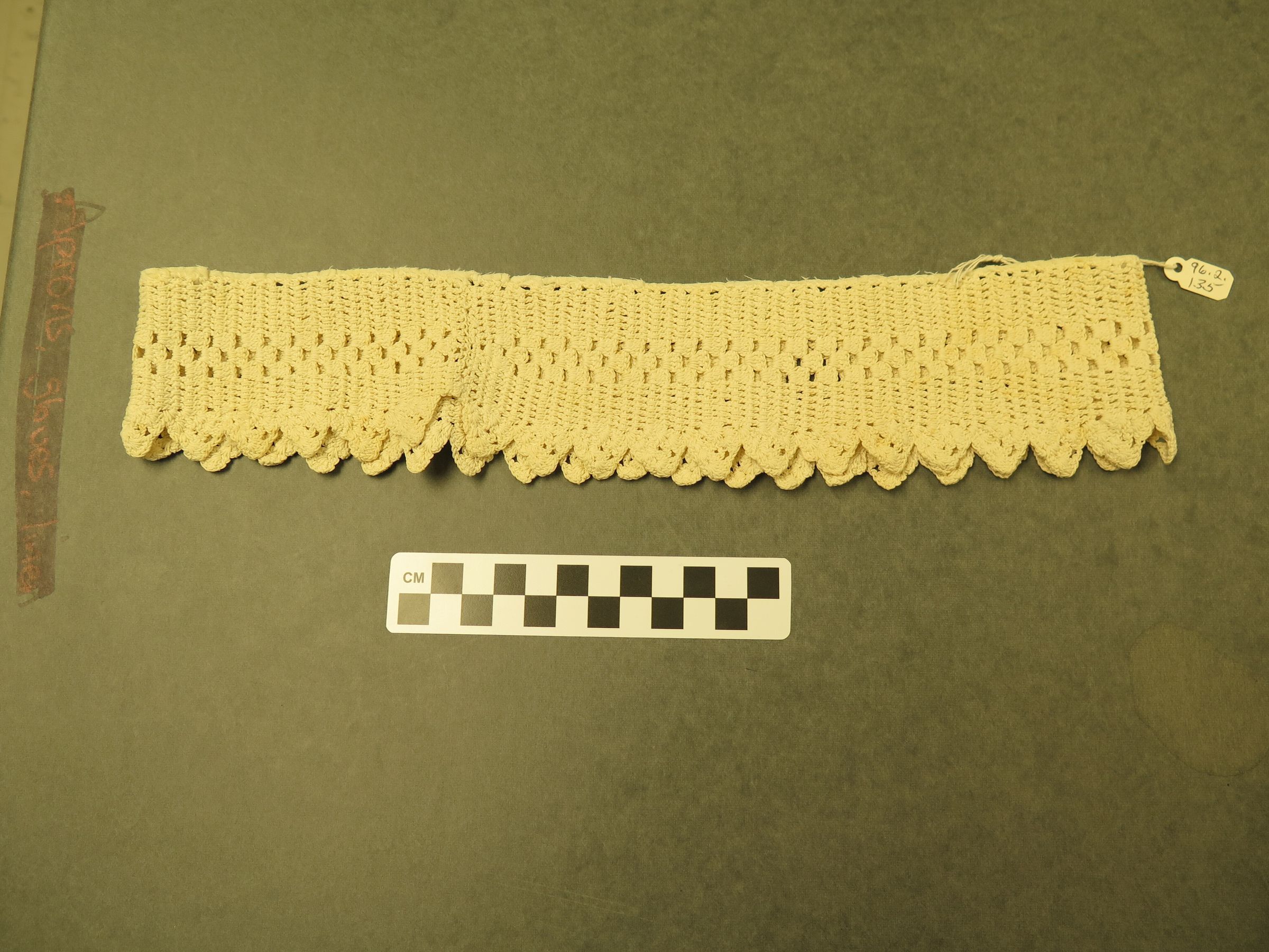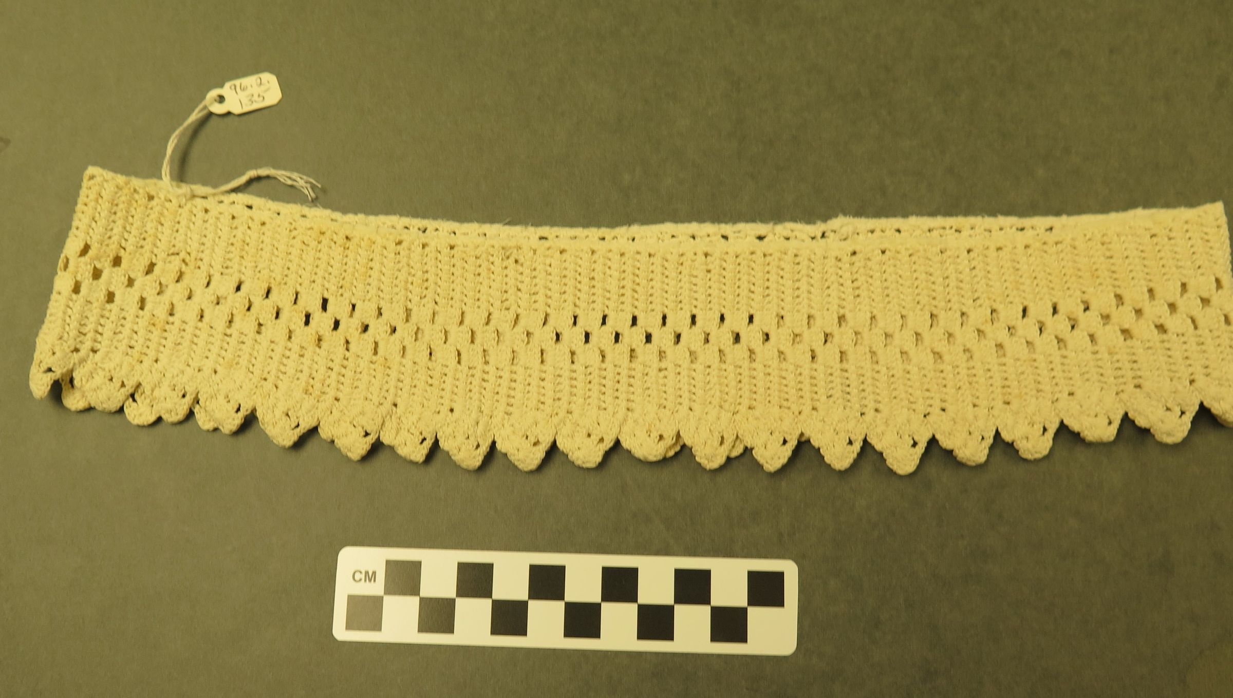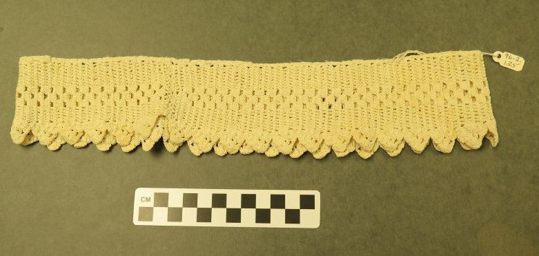 This is a white crocheted piece of edging in a loop. The crochet was a scalloped edge on the bottom. The crochet measures 13.5" (diam).Collection