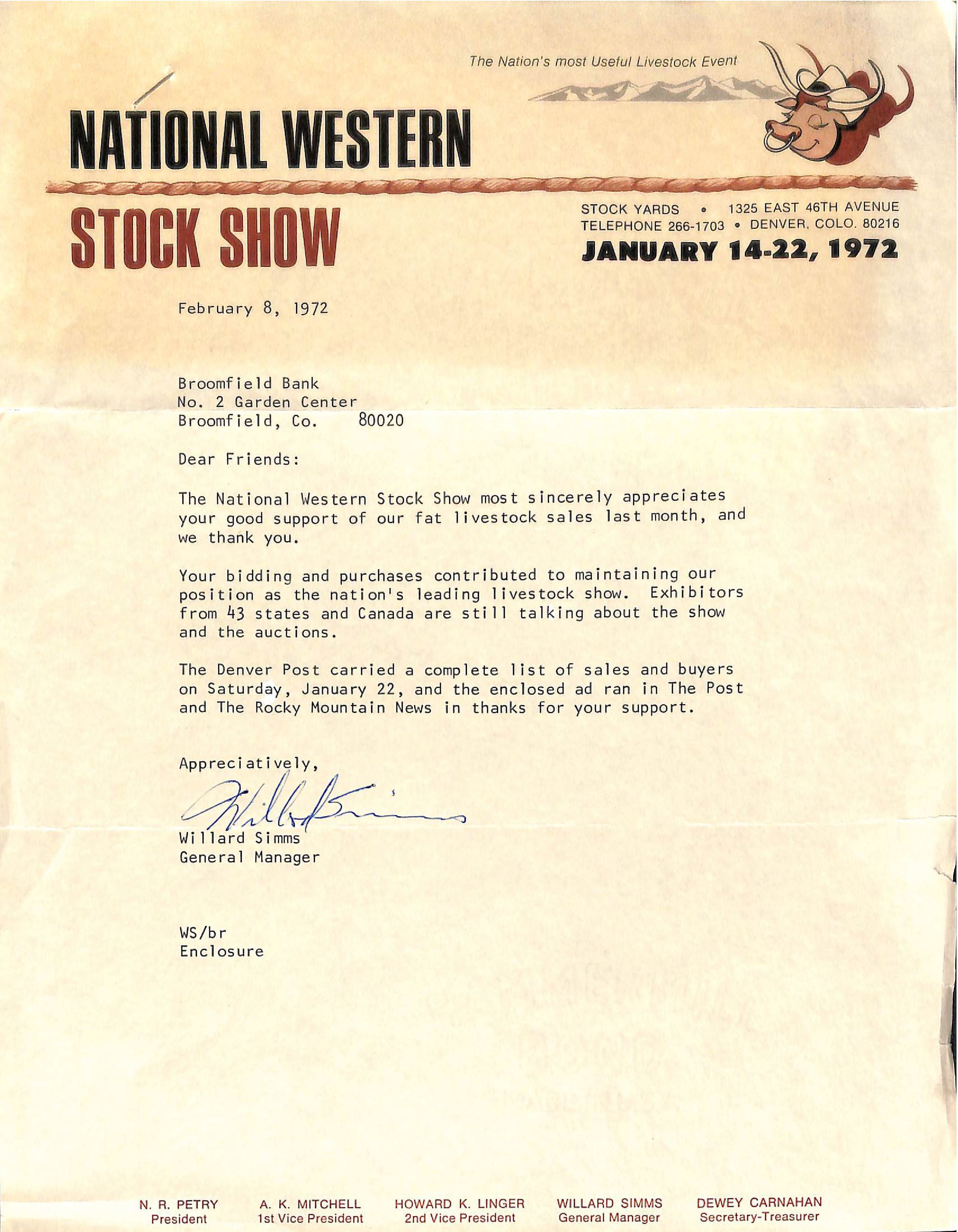 Item is a letter to the Broomfield Bank from Willard Simms, the General Manager of the January 14-22, 1972 National Western Stock Show. The letter is printed on a single sheet of paper with the National Western Stock Show's name, symbol (a bull with a cowboy hat), location, phone number, and dates along the top. The letter was written on February 8th in order to thank Broomfield Bank for supporting livestock sales during the auctions. Stapled to the letter is a newspaper clipping with an advertisement for the Stock Show, which was featured in The Post and The Rocky Mountain News thanks to funding from the Broomfield Bank.Collection