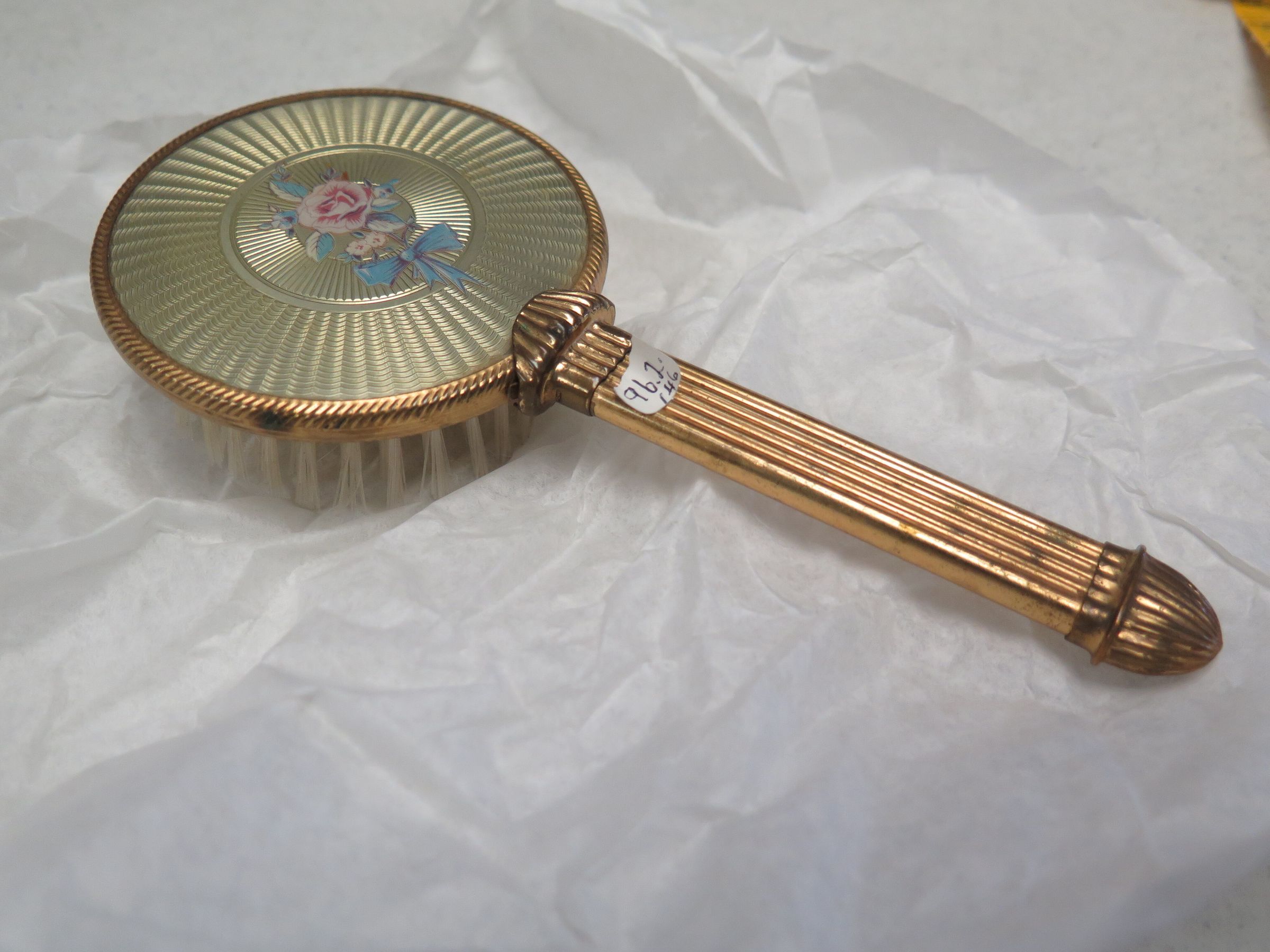 This is a brush with nylon bristles, a gold-colored handle, and a floral design on the back. The brush measures 1.5" (h) x 3.5" (w) x 7.5" (l).Collection