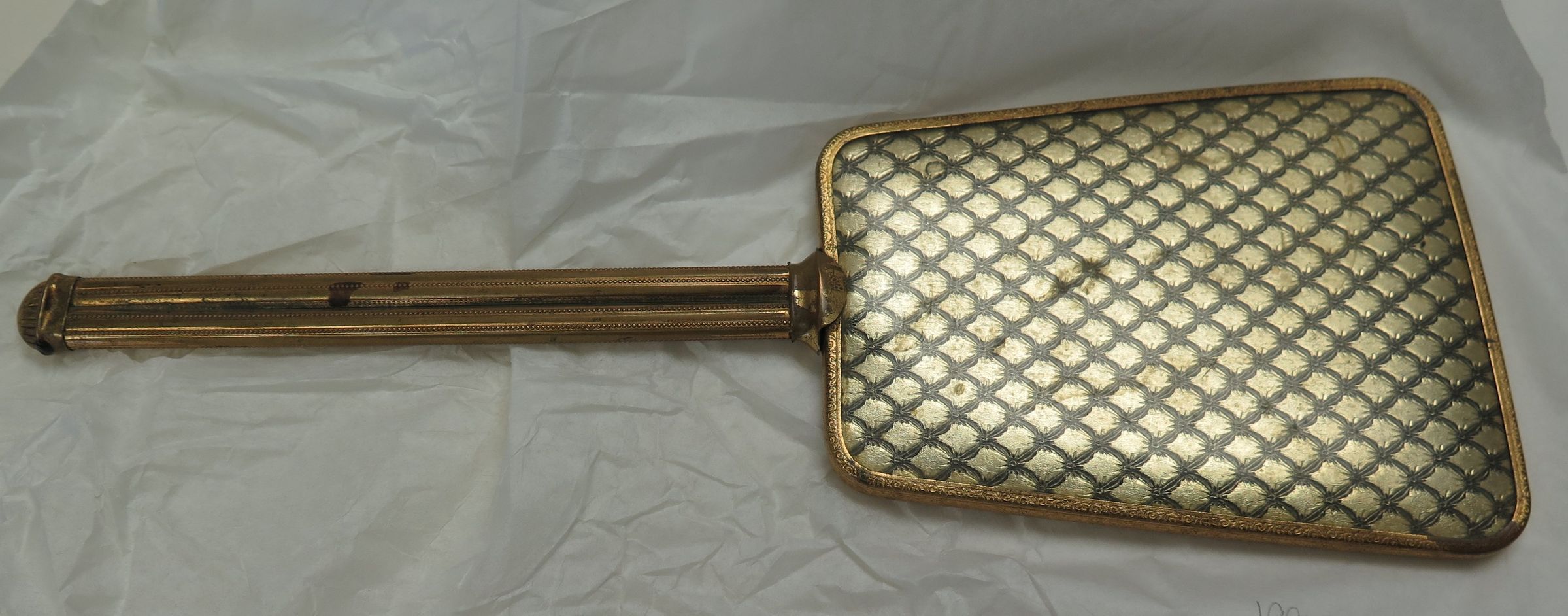 This is a rectangular hand mirror. The handle and frame are made of metal and are gold in color. The back of the frame has a scale-like pattern in gold and black paint. The mirror measures 4.5" (w) x 12.5" (l).