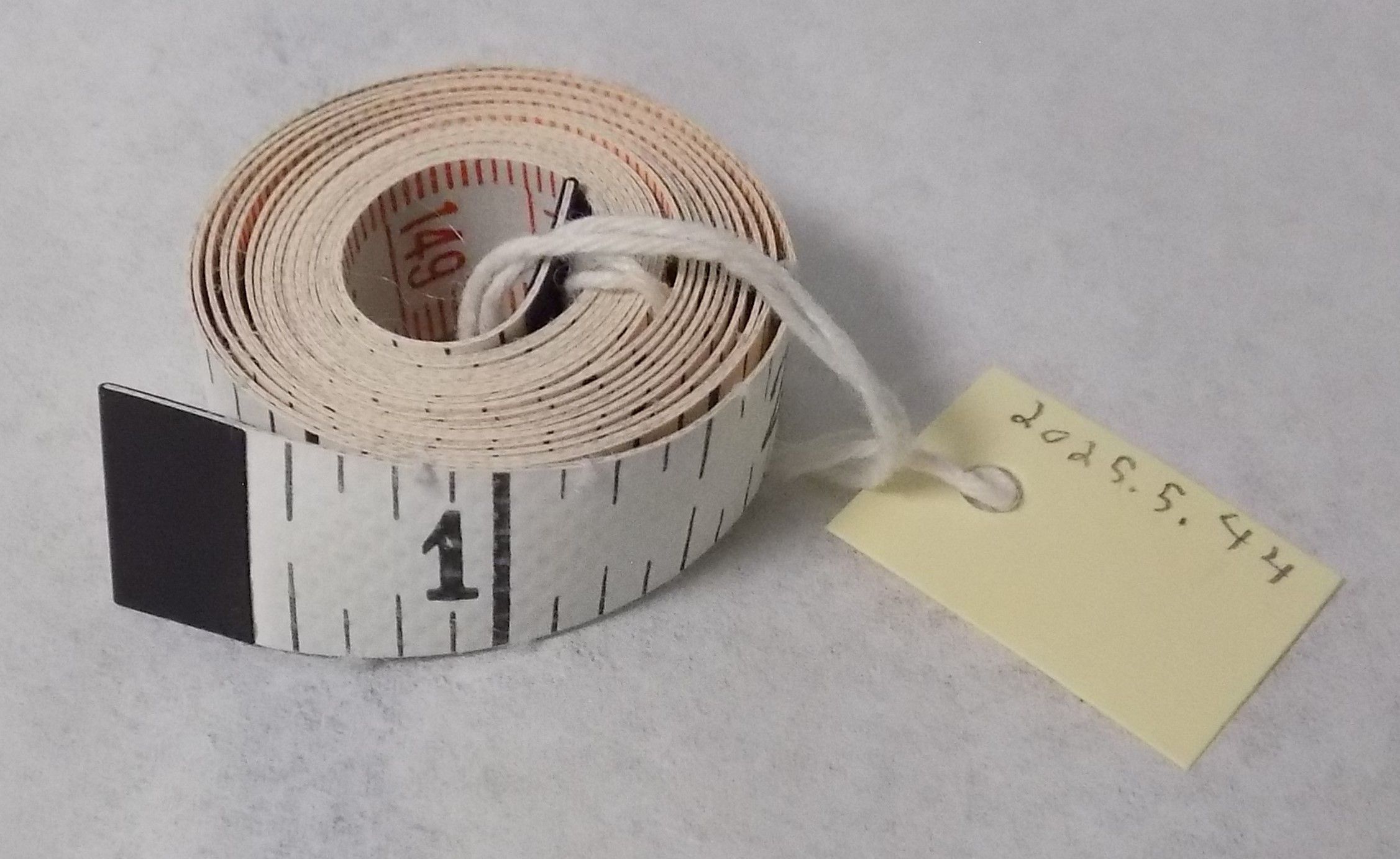Item is a roll of measuring tape that measures in inches on one side and centimeters on the other. The side with inches is in black ink, while the other is in red. The measuring tape was manufactured in Taiwan. The tape goes all the way up to 152 centimeters and 60 inches, with black tabs marking both the starting and ending points of the roll of tape. Item was likely from the early 1900s.