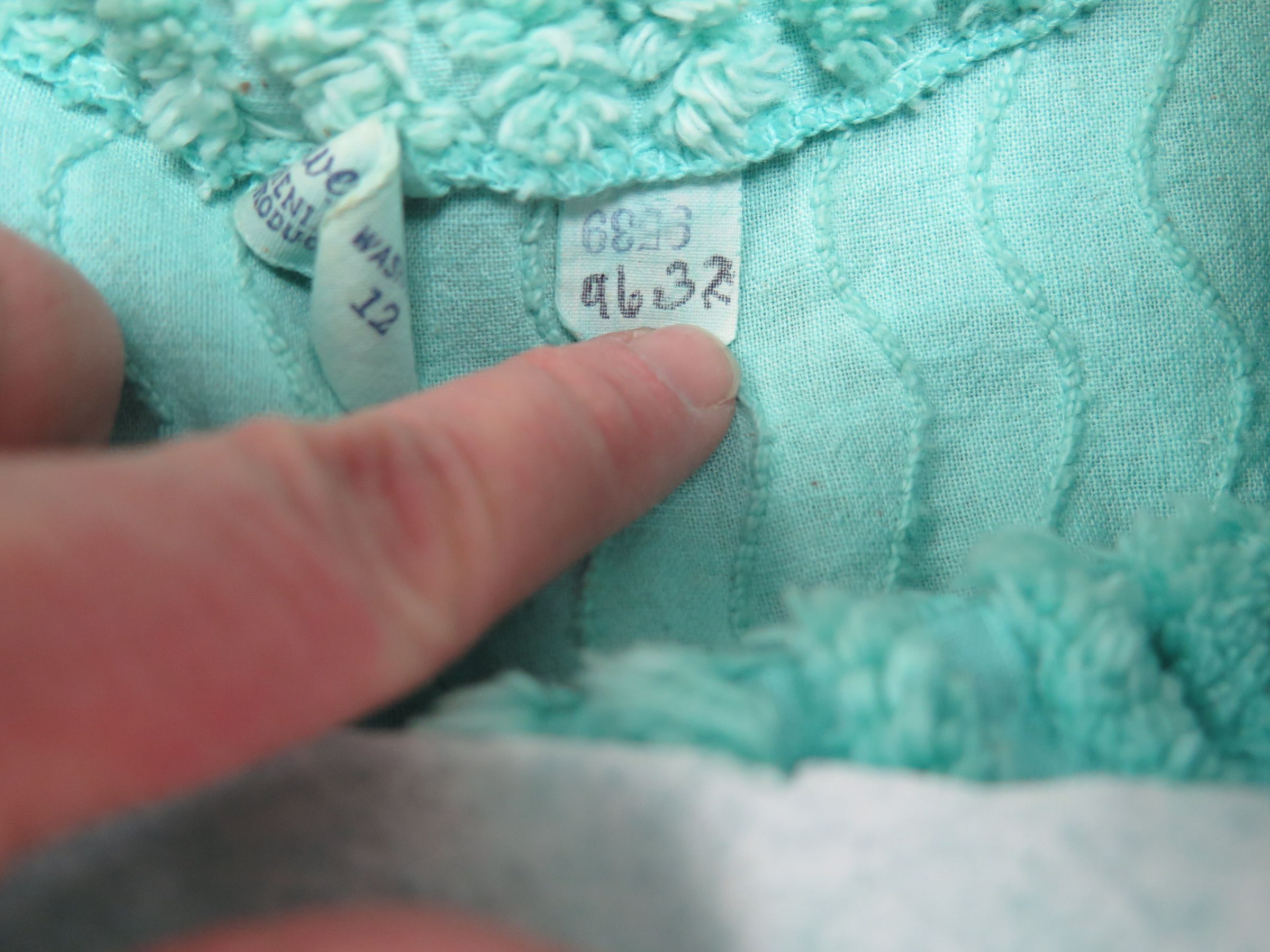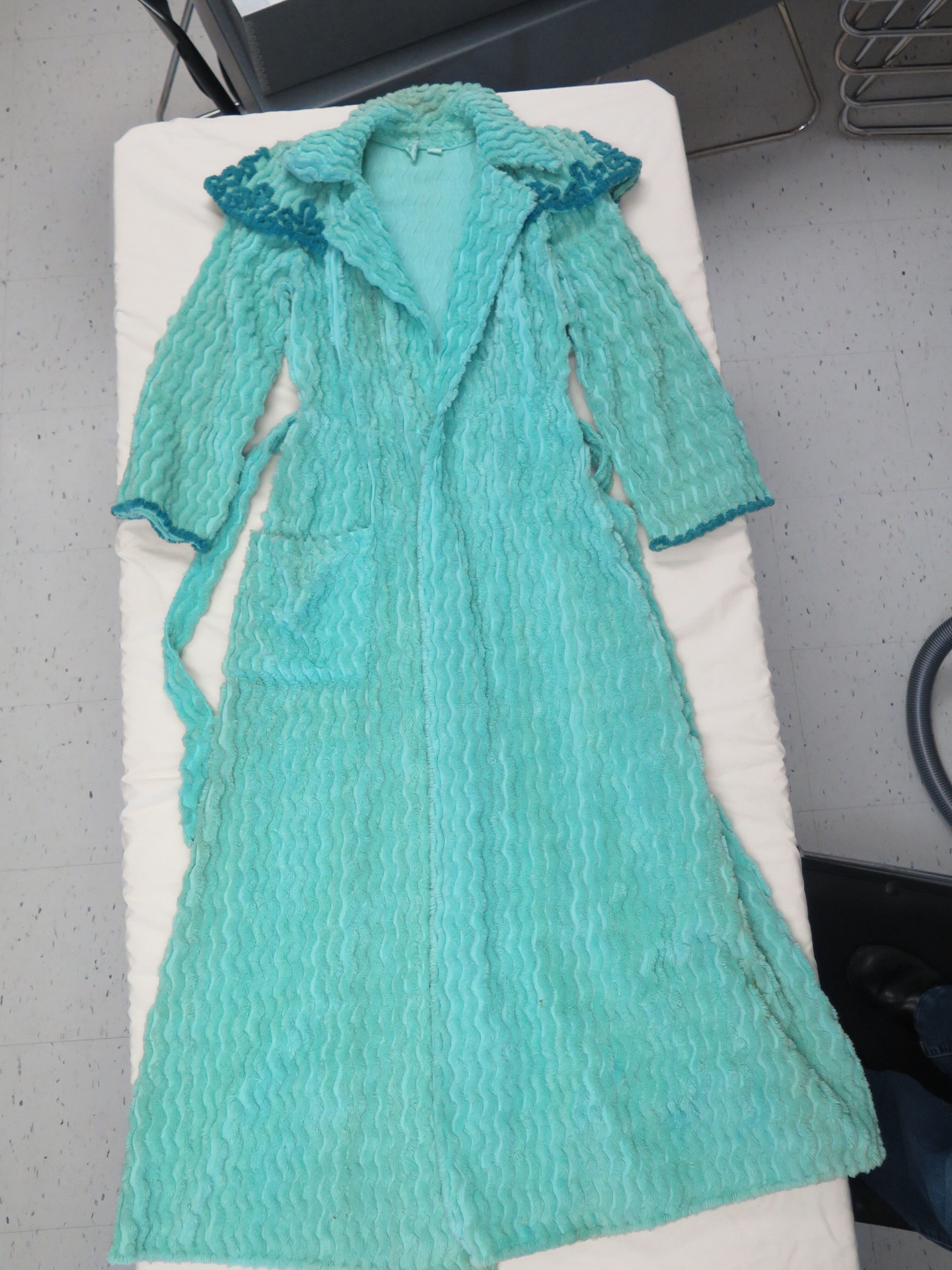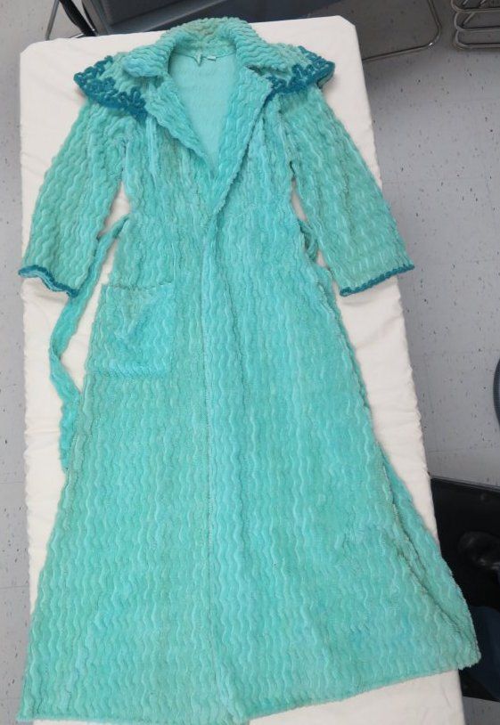 Ladies robe made with a chenille yarn in an aqua color. Collar and sleeves edged in a darker blue color chenille. Robe ties around the waist with a belt of the same material as the robe and has a pocket near the hips on the left side. Robe measures 17" (w) x 52" (l).