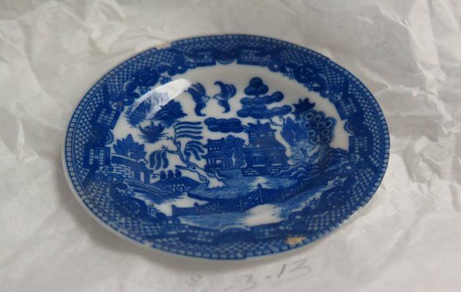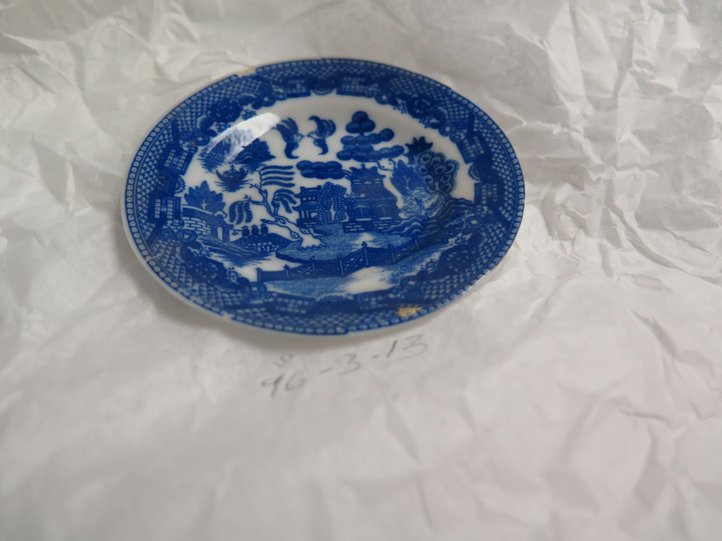This is a set of two children's plates. Both plates are blue and white with the Willow pattern on them. They each measure 4" in diameter. There is a stamp on the bottom of the plates in blue ink that reads, "Made/ in/ Japan".