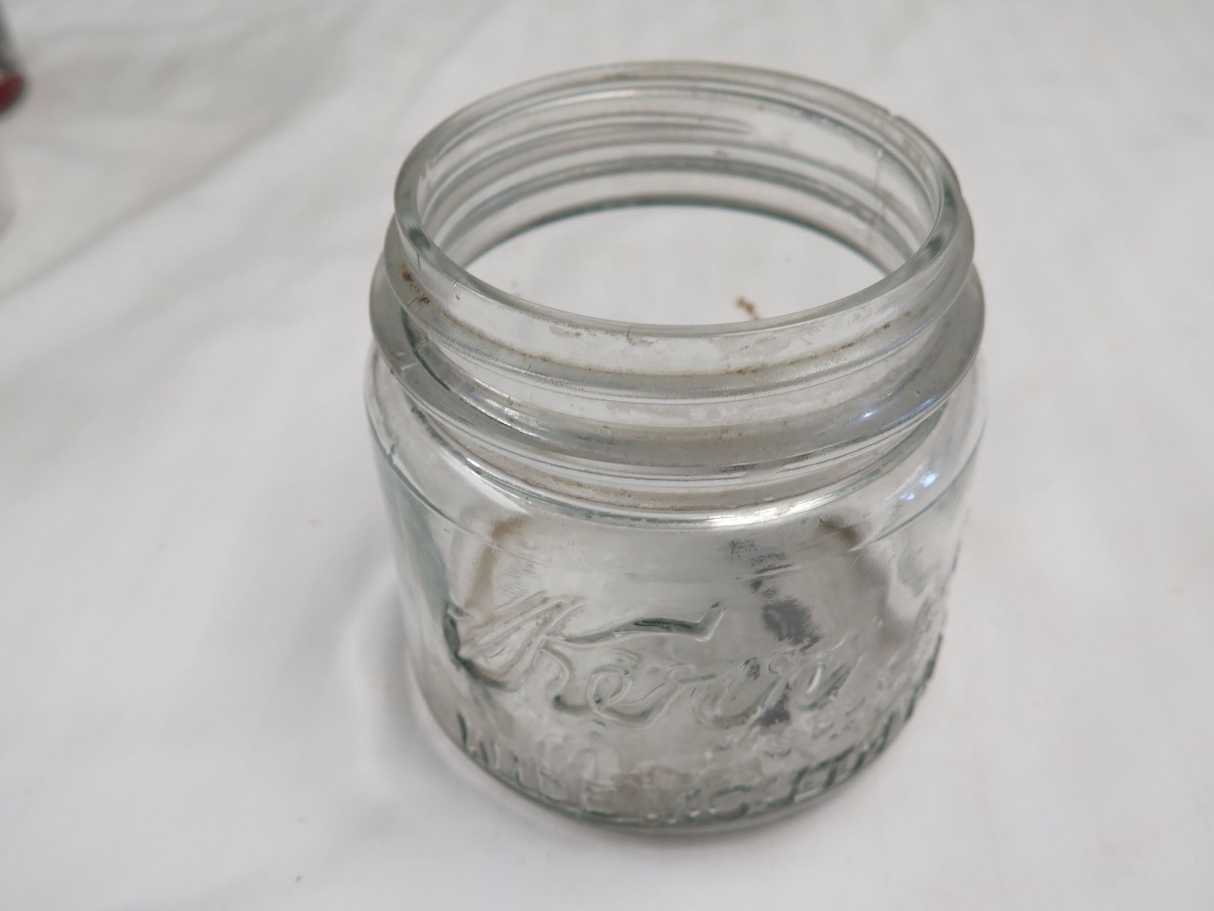 This is a clear glass wide mouth Kerr brand canning jar without a lid. The jar has a round base and a round opening on the top that is the same diameter as the base. The jar measures 4" (h) x 3.75" (dia).