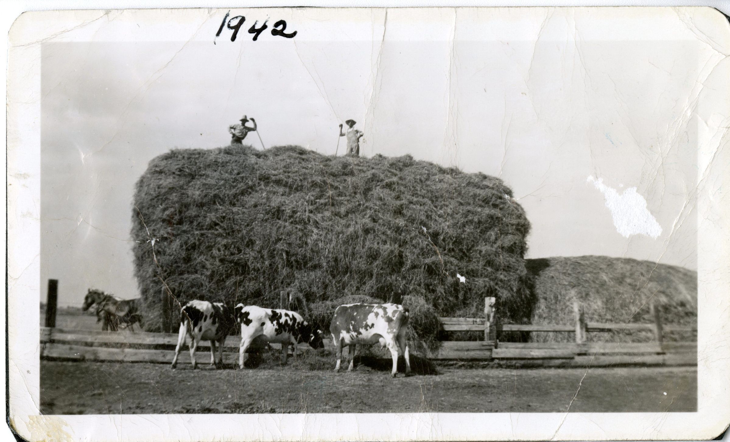 Two men with rakes stand on a large stack of alfalfa at the Brunner Farmhouse. Three cows and two horses graze below. Lester C. Brunner