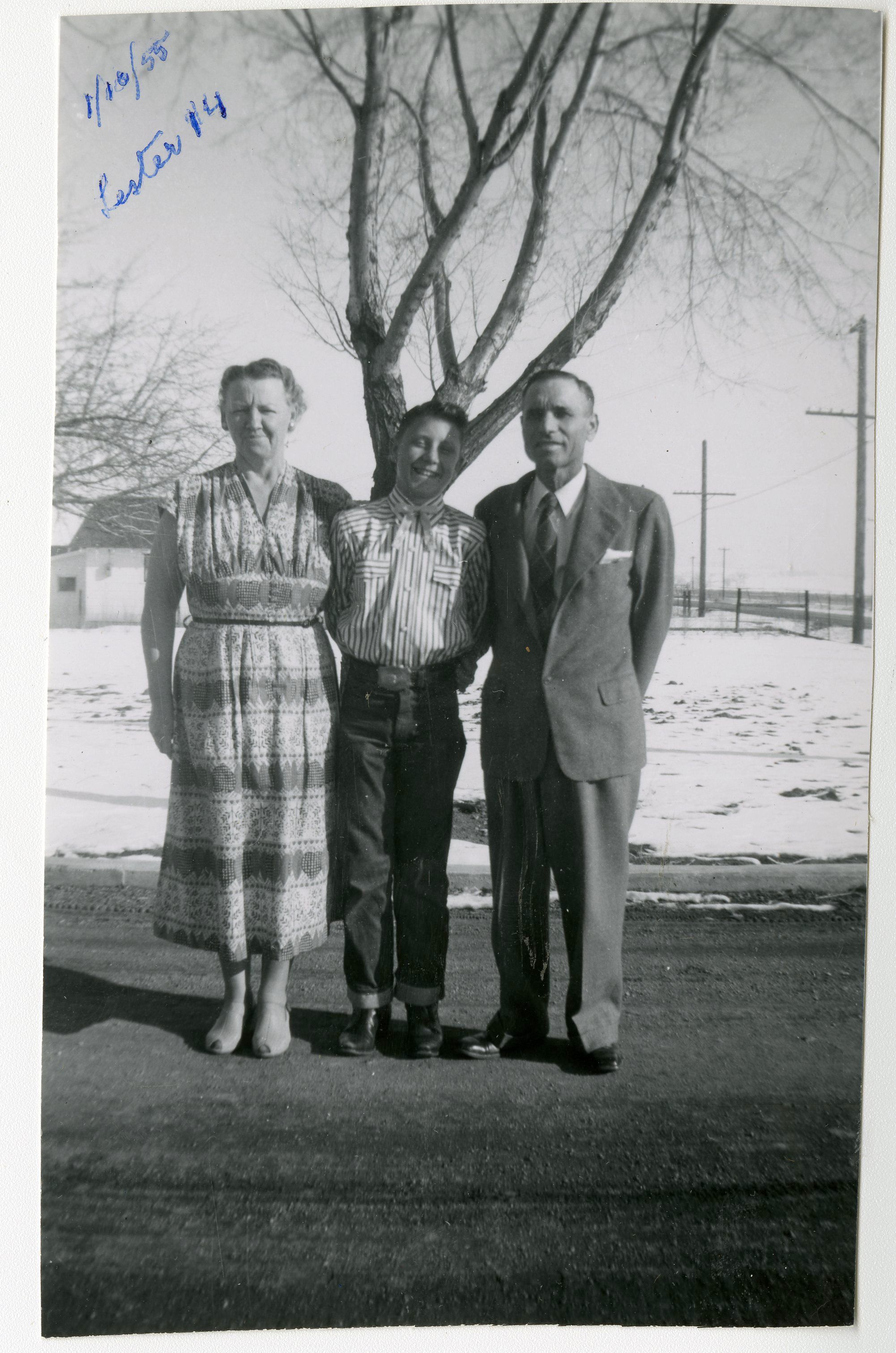 Black and white photograph of three members of the Brunner family. From left to right the members are Lib Brunner, Lester K. Brunner, and Lester C. Brunner. Photograph taken on Jan 13, 1955 when Lester K was 14 years old.