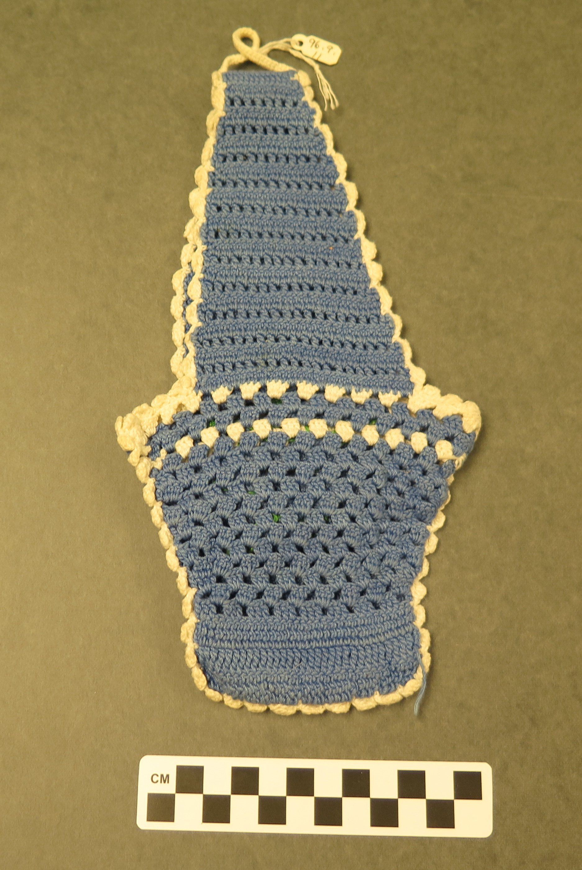 This is a blue crocheted hanging bag that looks like a pot. On the front is a white flower with green leaves. Both sides are open so that things can be placed in and removed. There is white trim around the edges. The crochet measures 5" (w) x 10" (l).