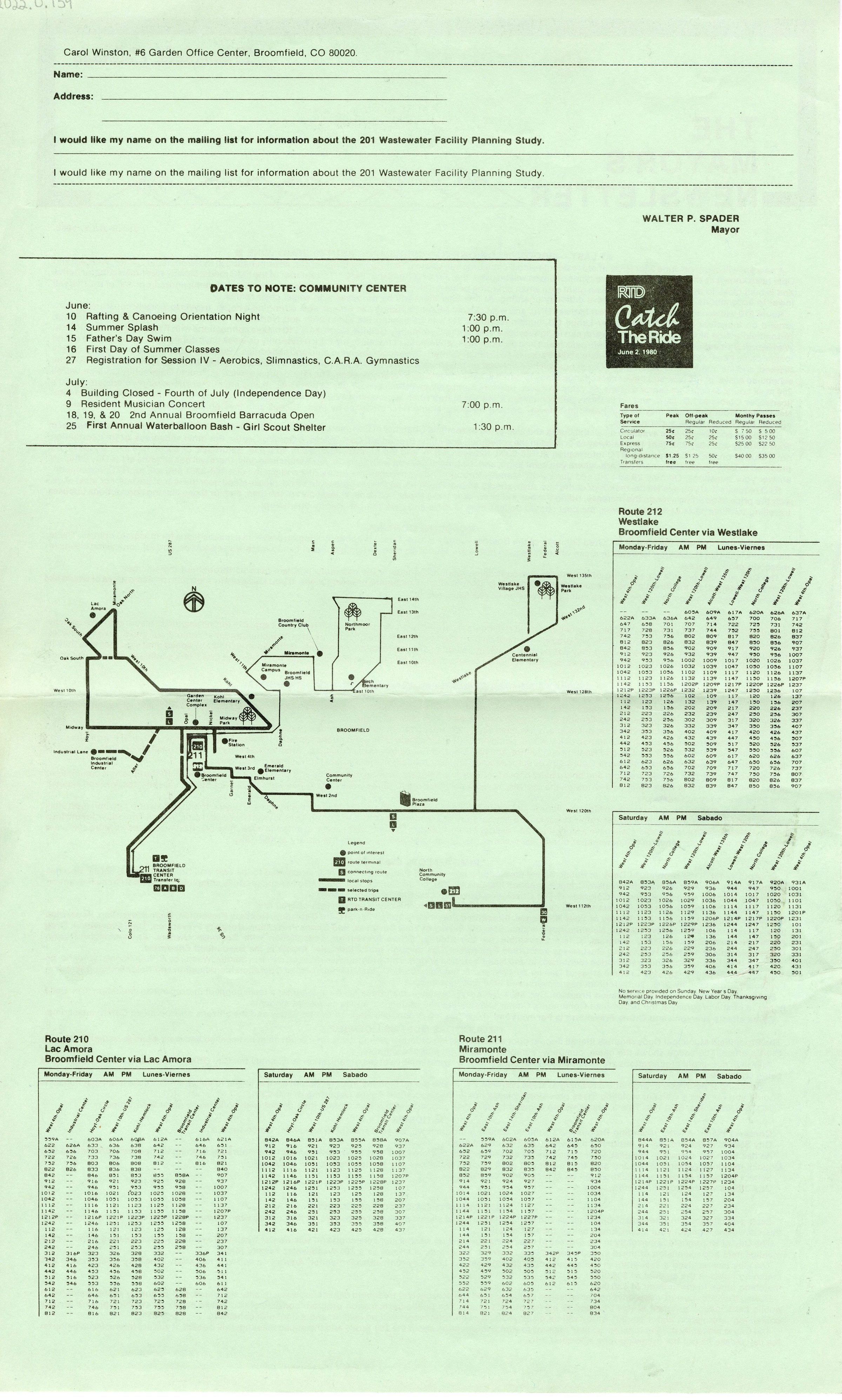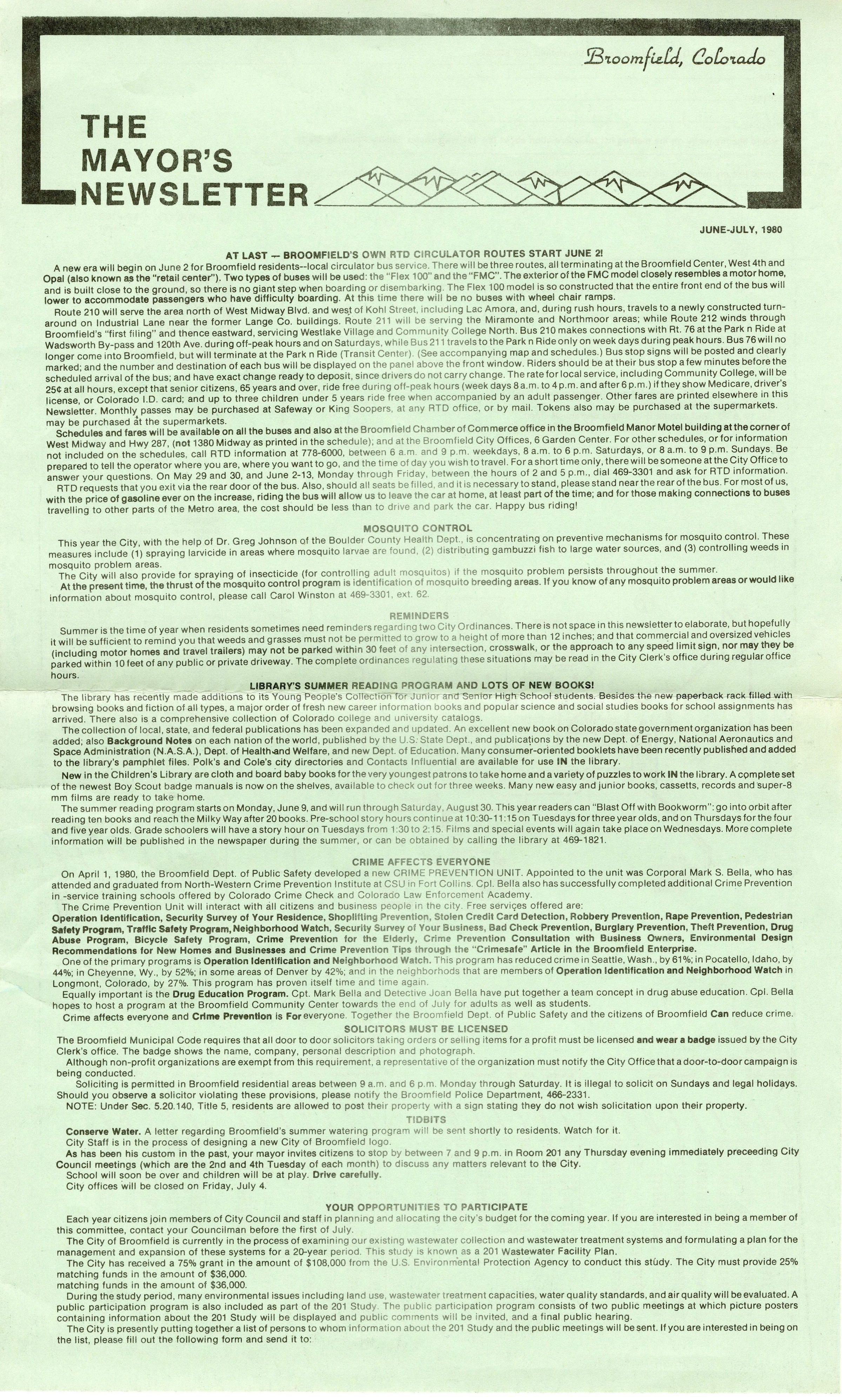 "The Mayor's Newsletter" June-July 1980. Two-sided, single-page newsletter printed on legal-sized mint-green paper. Topics include: beginning of RTD bus route circulations, mosquito control, parking reminders, library summer reading program, crime watch, solicitor licenses, water conservation, budget participation. Reverse side includes RTD schedule with map and dates to note for the Community Center.Collection