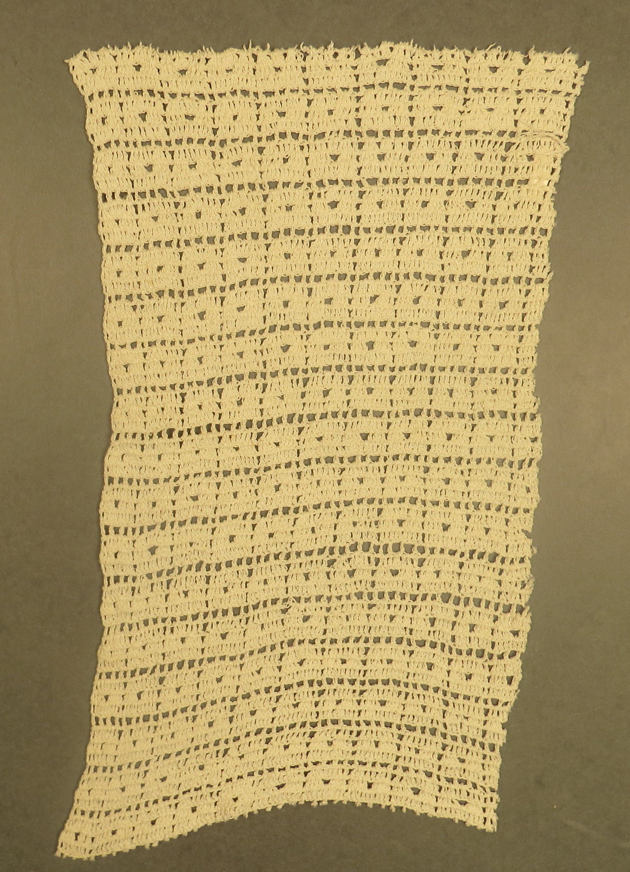 Rectangluar, white doily. Doily measures 10" (w) x 20" (l). Note: This was recommended for disposal by Megan Huelman in October 2013 (TTempleman 06/30/2017).