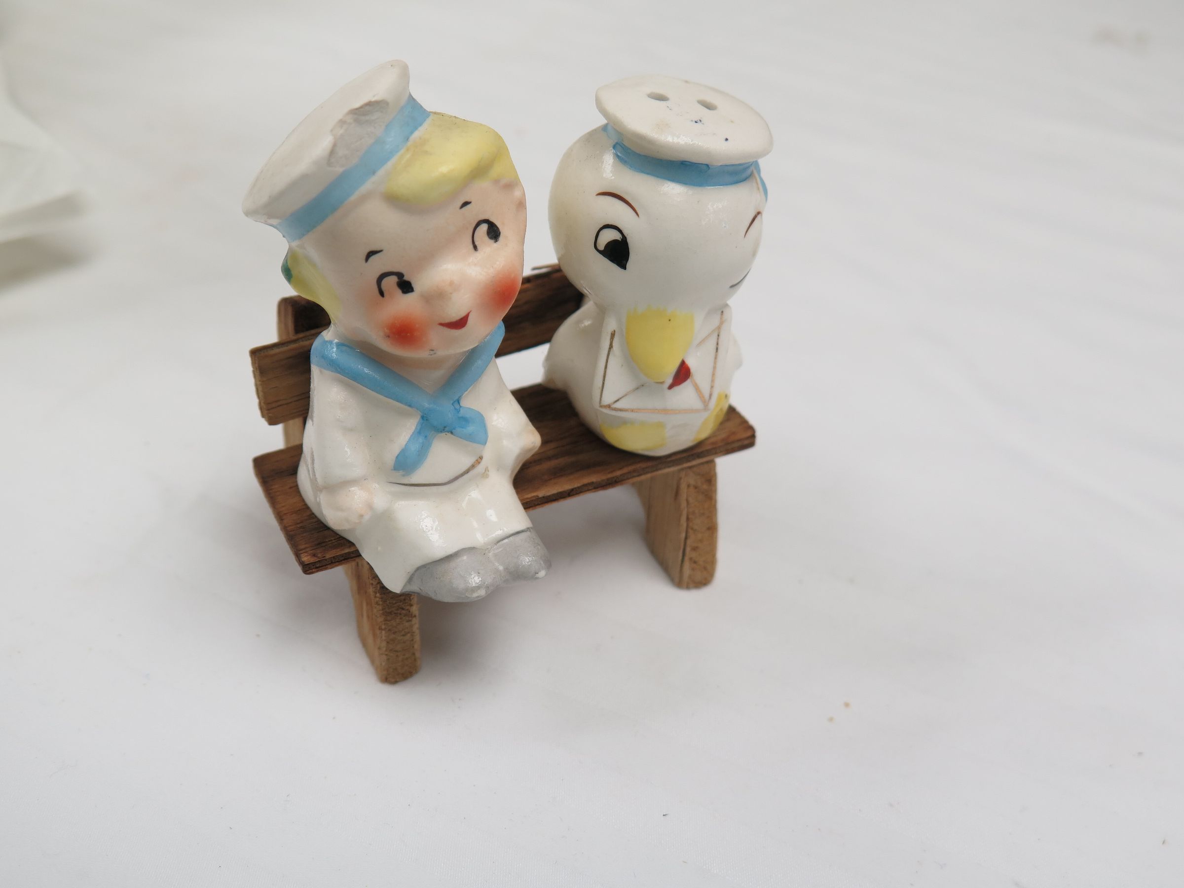 This is a salt and pepper shaker set shaped like a boy and a duck sitting on a bench together. The set measures 3.5" (h) x 3" (w) x 3.25" (d).