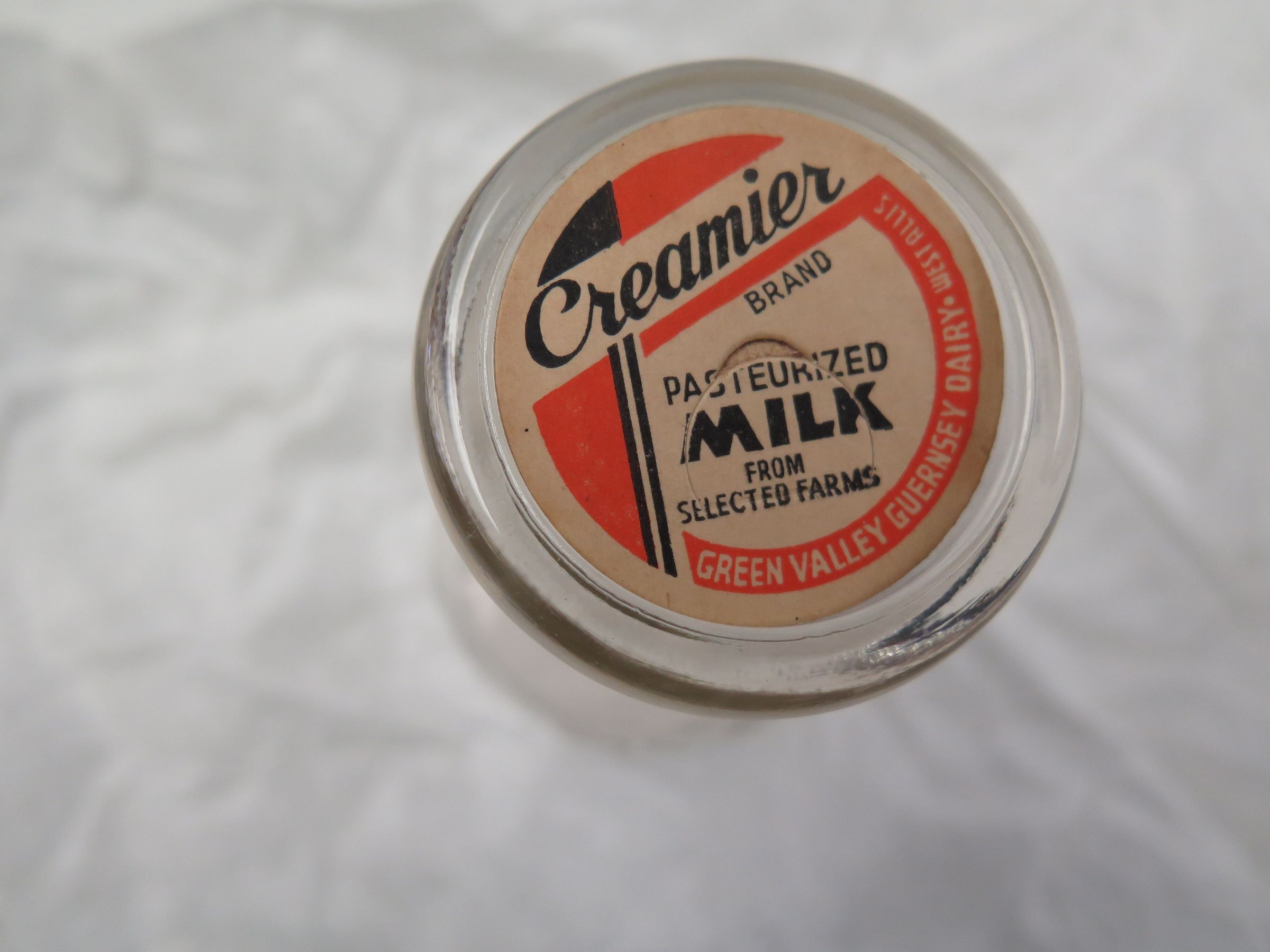 This is a 1 pint, clear glass milk bottle. The milk bottle has a lid that is white, black, and red and has text that reads, "Creamier/ Milk". The milk was Creamier brand Green Valley. The milk bottle measures 7.25" (h) x 2.75" (dia). This is a milk bottle. They used to be deposited at every house every morning, ad were very small. This bottle is one pint, which is 1/8 of a normal gallon.