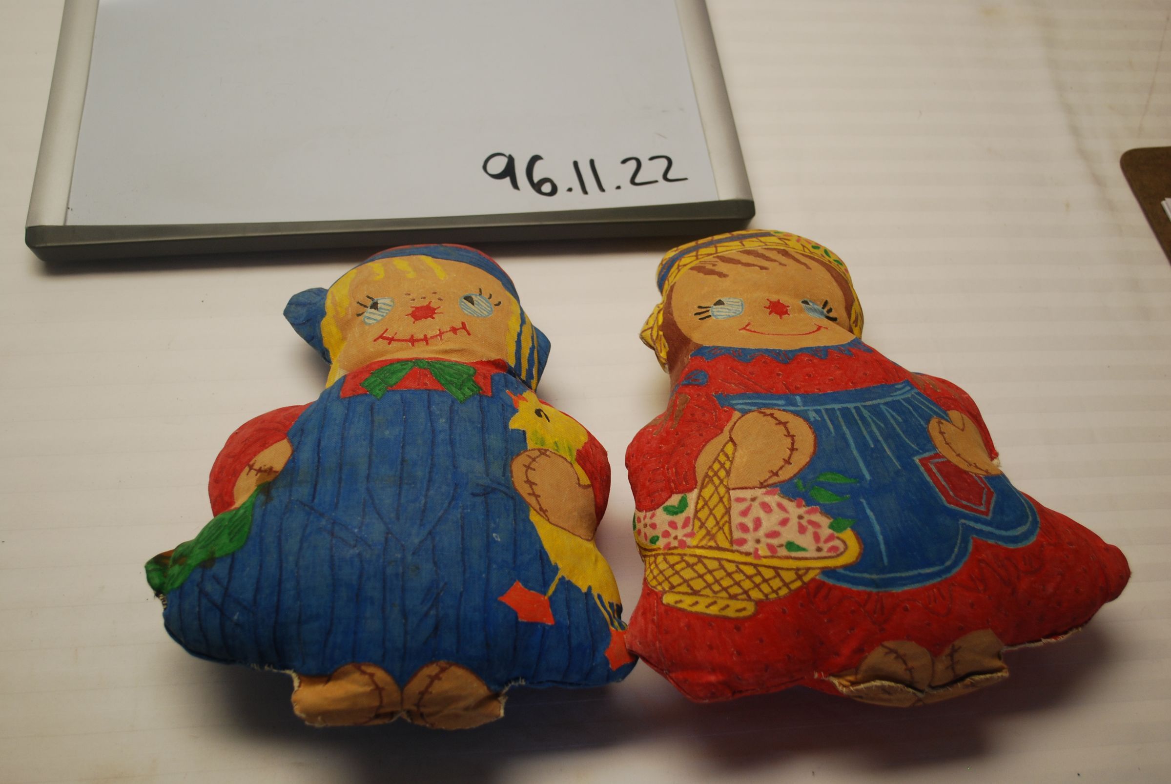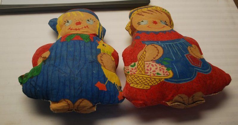 This is a set of two cloth dolls or pillows. The set includes one male and one female child, probably Raggedy Ann and Andy. Andy is wearing blue overalls and Ann is wearing a red dress with a blue apron. Andy measures 10" (h) x 8.25"(w) x 2.5" (d). Ann measures 9.5" (h) x 7.5" (w) x 2.5" (d).Collection