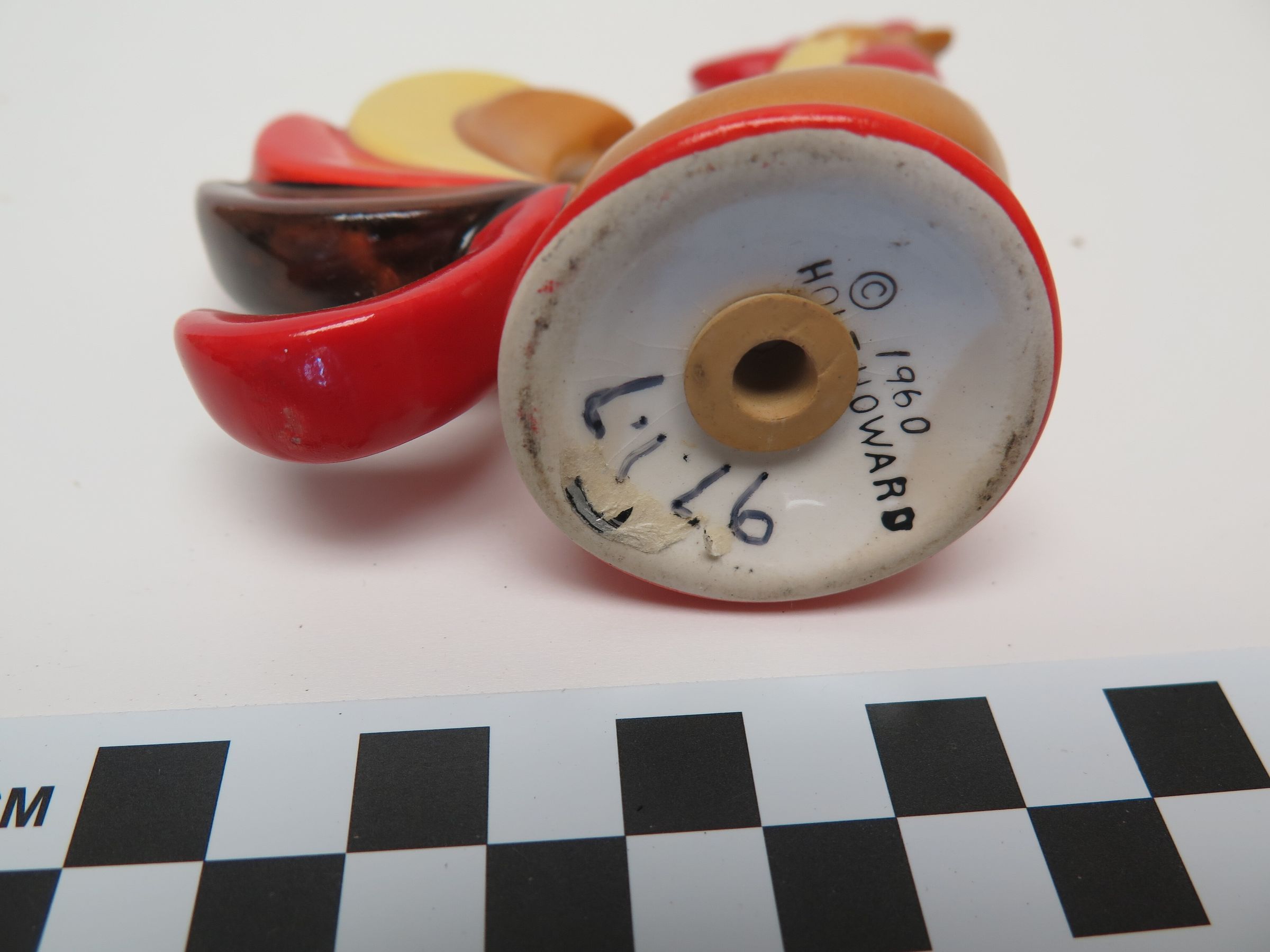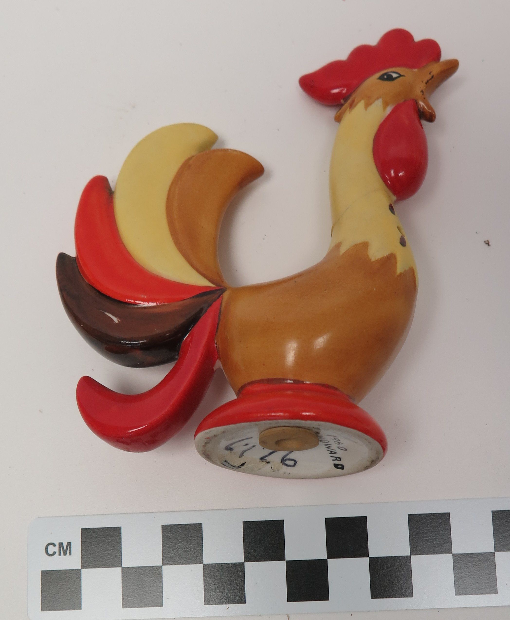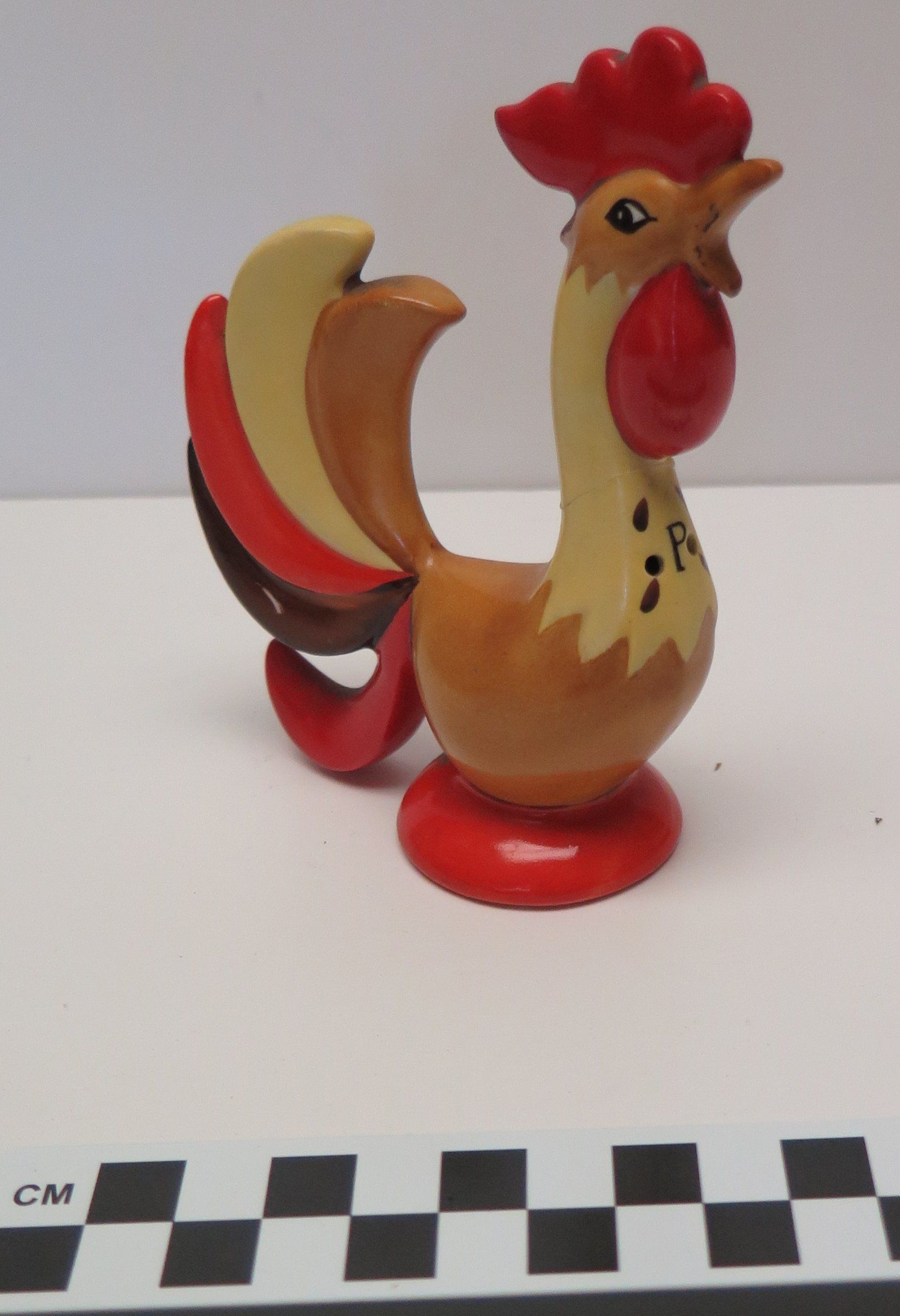 This is a painted ceramic pepper shaker in the shape of a stylized rooster. It has a crack running completely through the neck area. 4 1/2"(H) x 3 3/8"(W) x 1 5/8"(D).