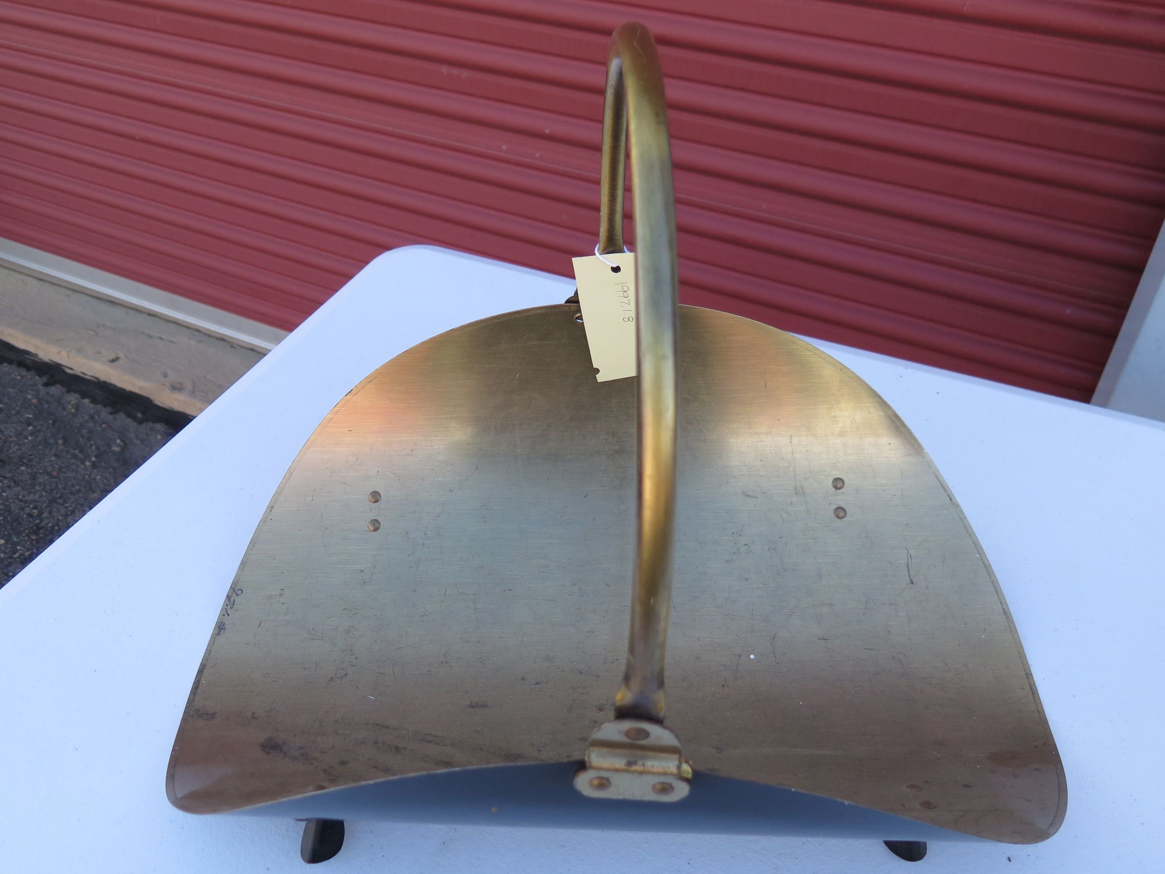 This firewood holder is 14.5"(h) x 12"(w) x 19.75 (depth). It is made from metal and has been painted gold.