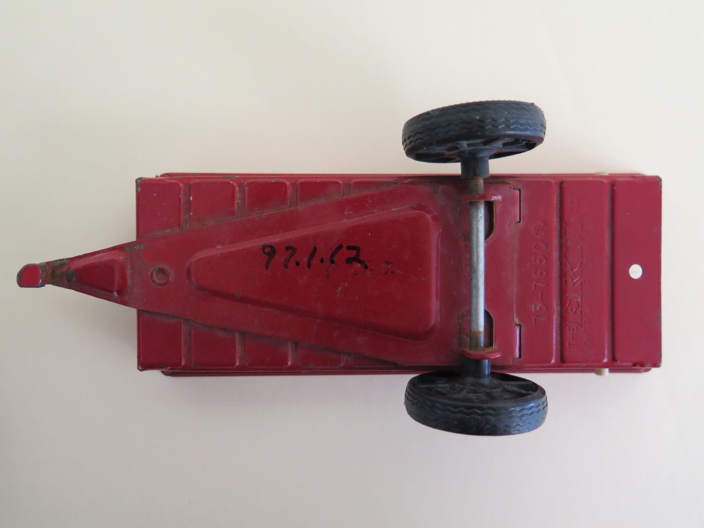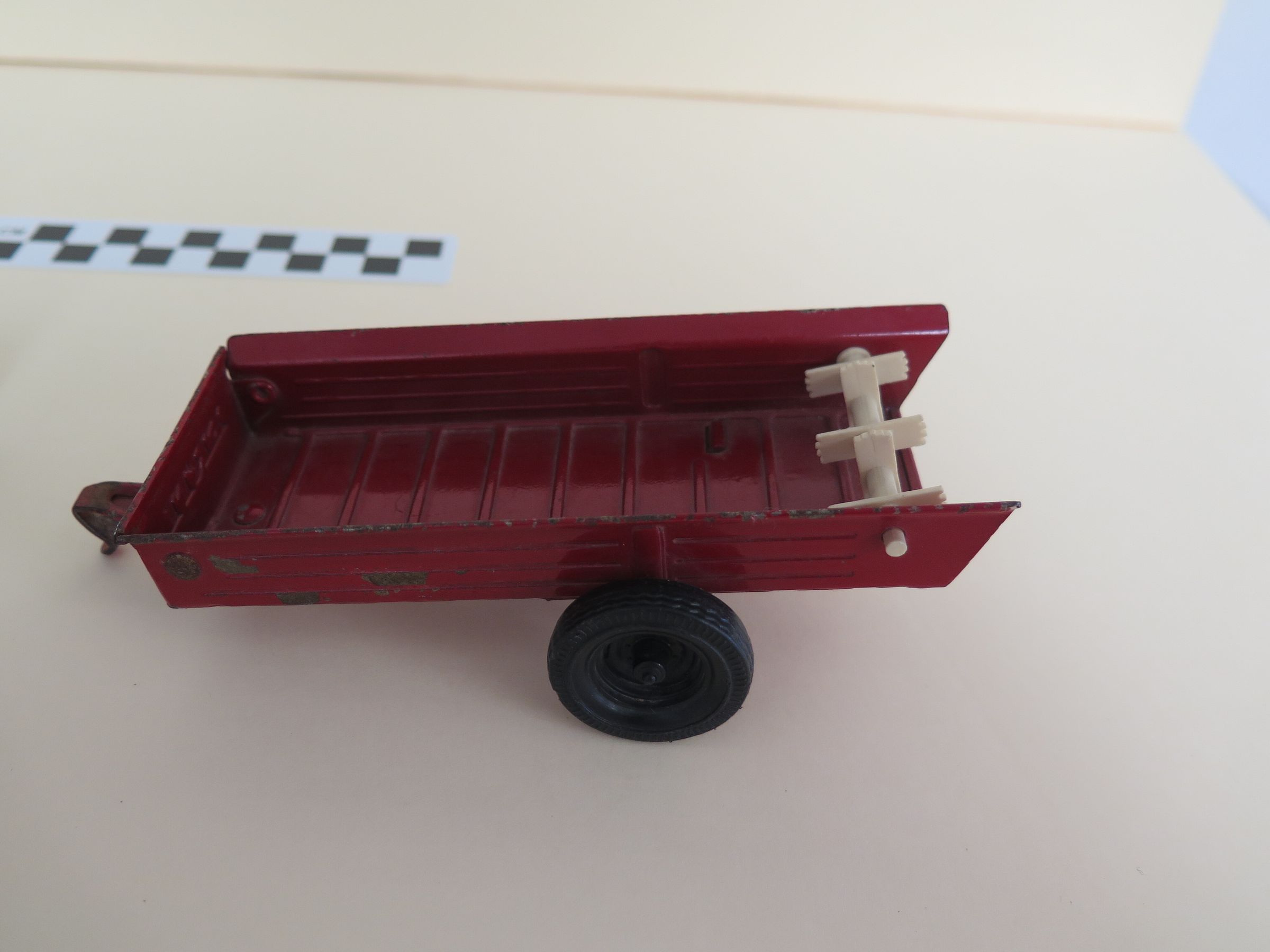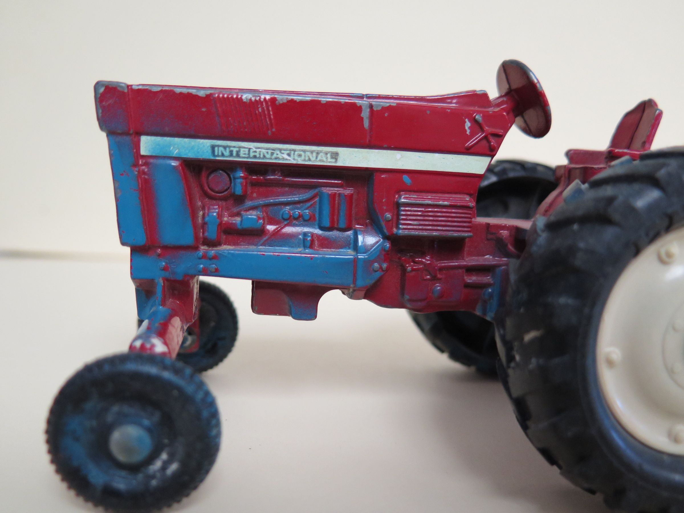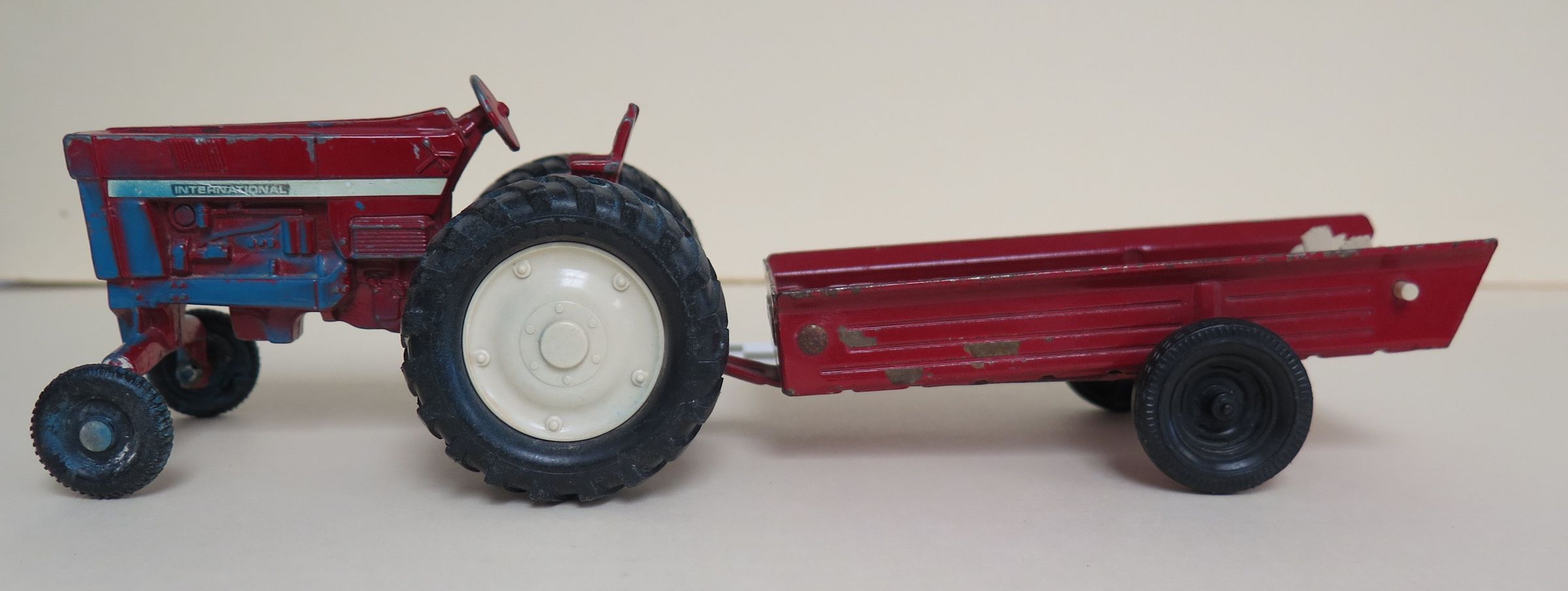 This is a red metal Etrl die cast tractor and manure spreader. The toys were made by Farmall International. The tractor is a 1/16 model of #544. The tractor has black wheels and blue/grey paint under the chipped red paint. The manure spreader has white plastic pieces at the back of the inside of the metal cart. The wheels on the cart are black. The toys measures 3" (h) x 2" (w) x 11.5" (l) when they are linked together.Collection