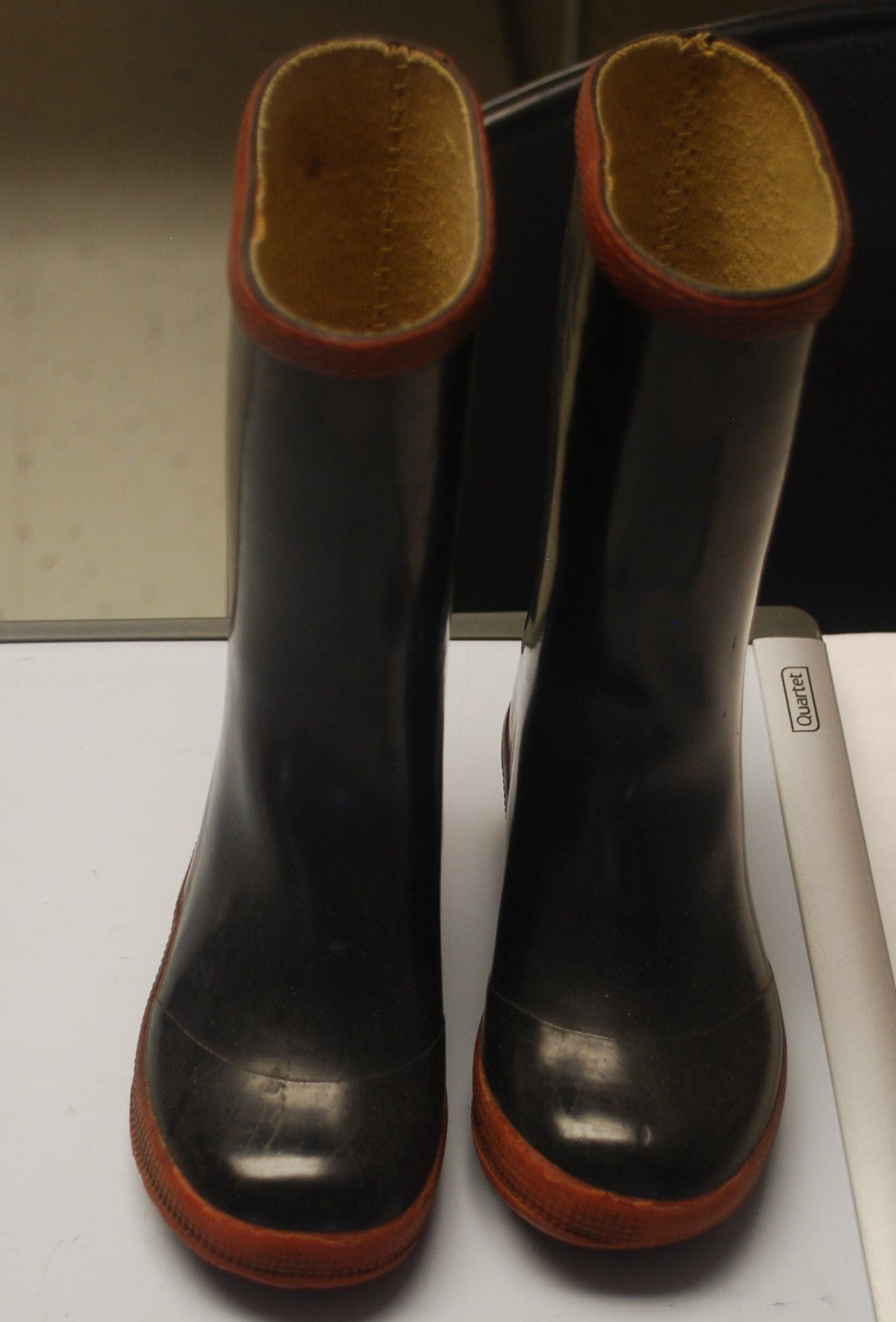 This is a pair of children's rubber rain boots. They are black boots with red trim around the bottom and top. Each boot measures 7" (h) x 2.5"(w) x 5.5" (l).