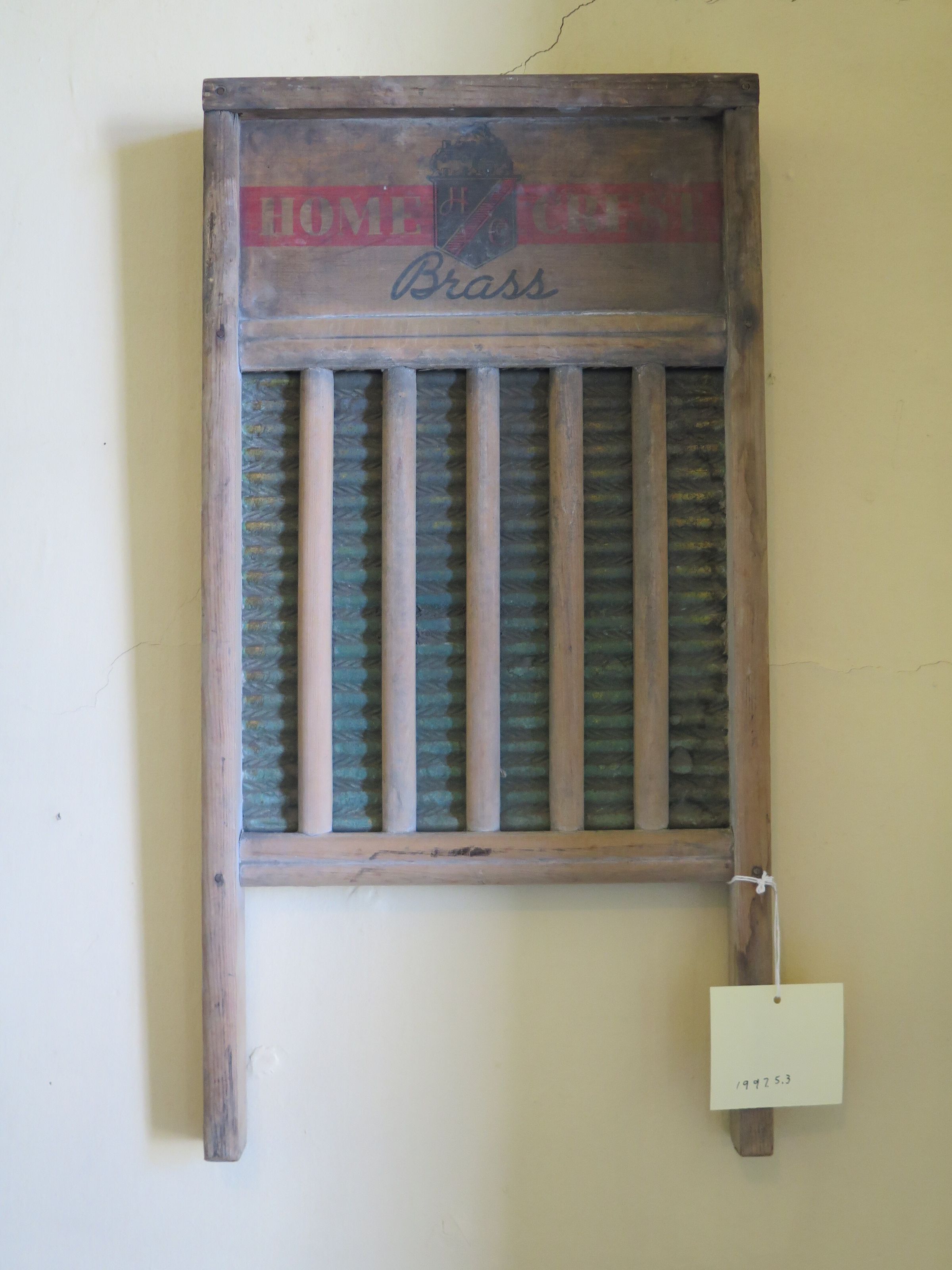 This a Home Crest brand brass medium washboard with a wood frame. The washboard measures 23.5" (h) x 12.5" (w) x 1.25" (d).