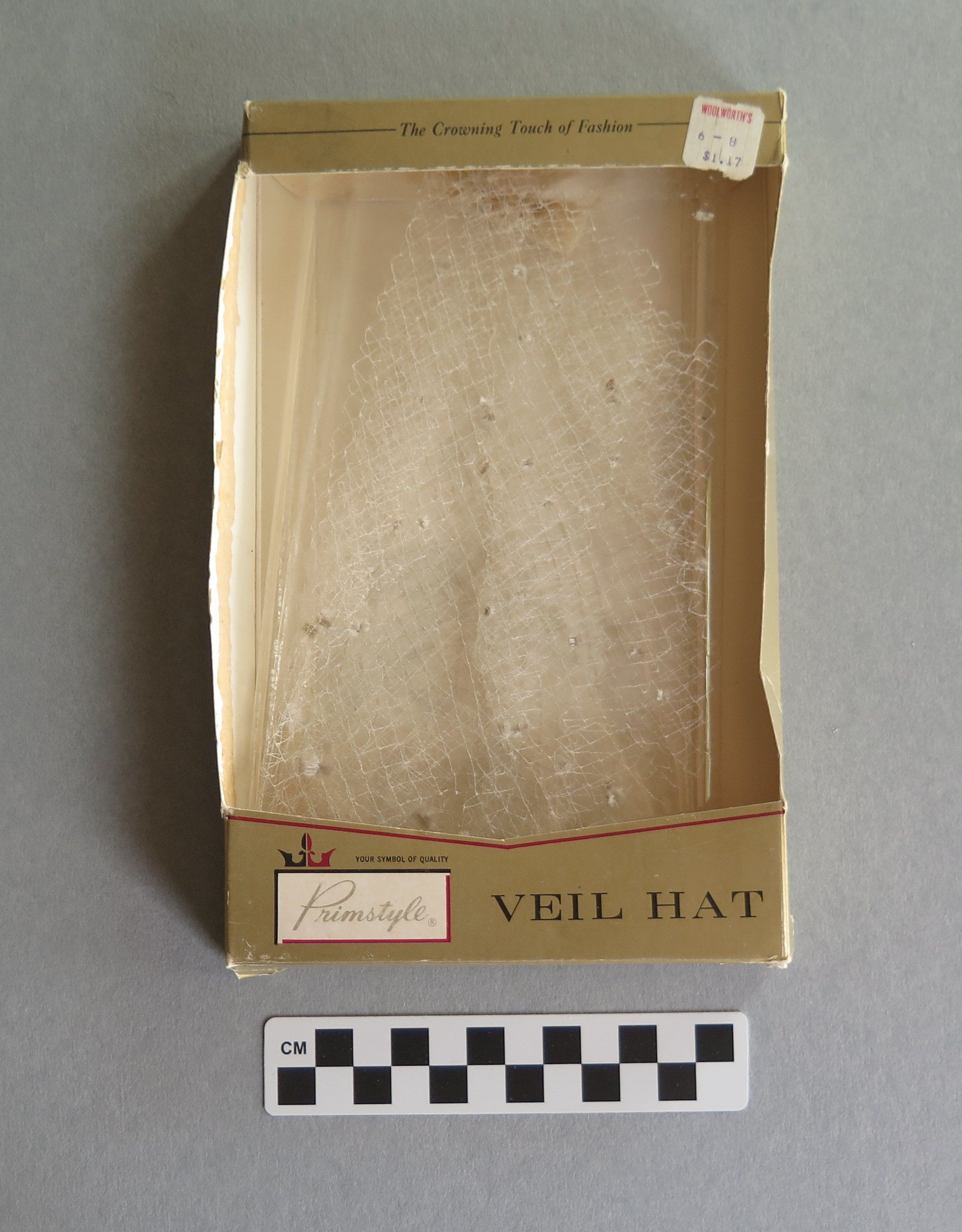 White veil hat in gold box. The box reads "Primstyle Veil Hat." The price tag on the front reads "1.17." The box measures 9" (h) x 1" (w) x 5" (l).