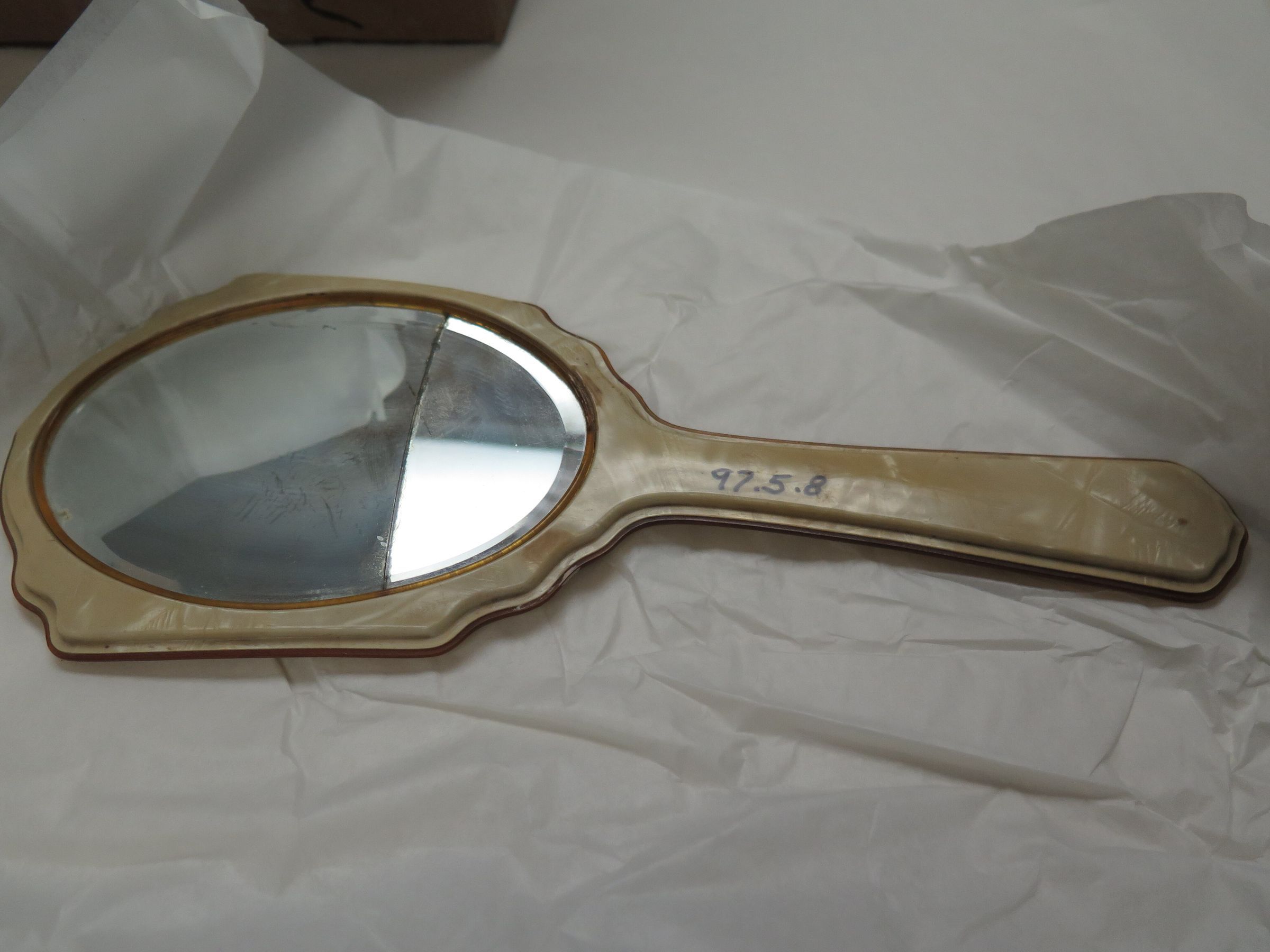 This is a round hand mirror with a pearlized celluloid frame. The mirror is cracked. The mirror measures 5.25" (w) x 12.75" (l).
