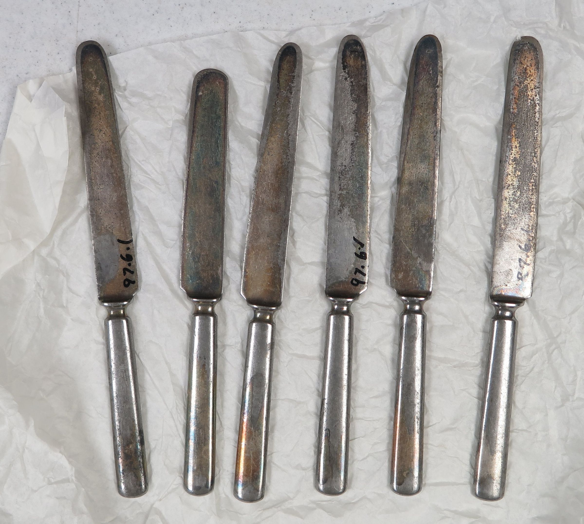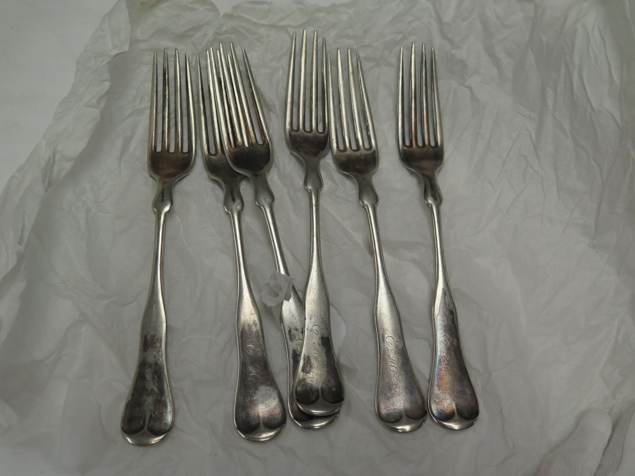 This is a set of metal flatware containing 6 forks and 6 knives. The forks have a name etched into the handle, but it is too worn to see. It states with "E." Each fork measures 1.5" (w) x 7.5" (l).