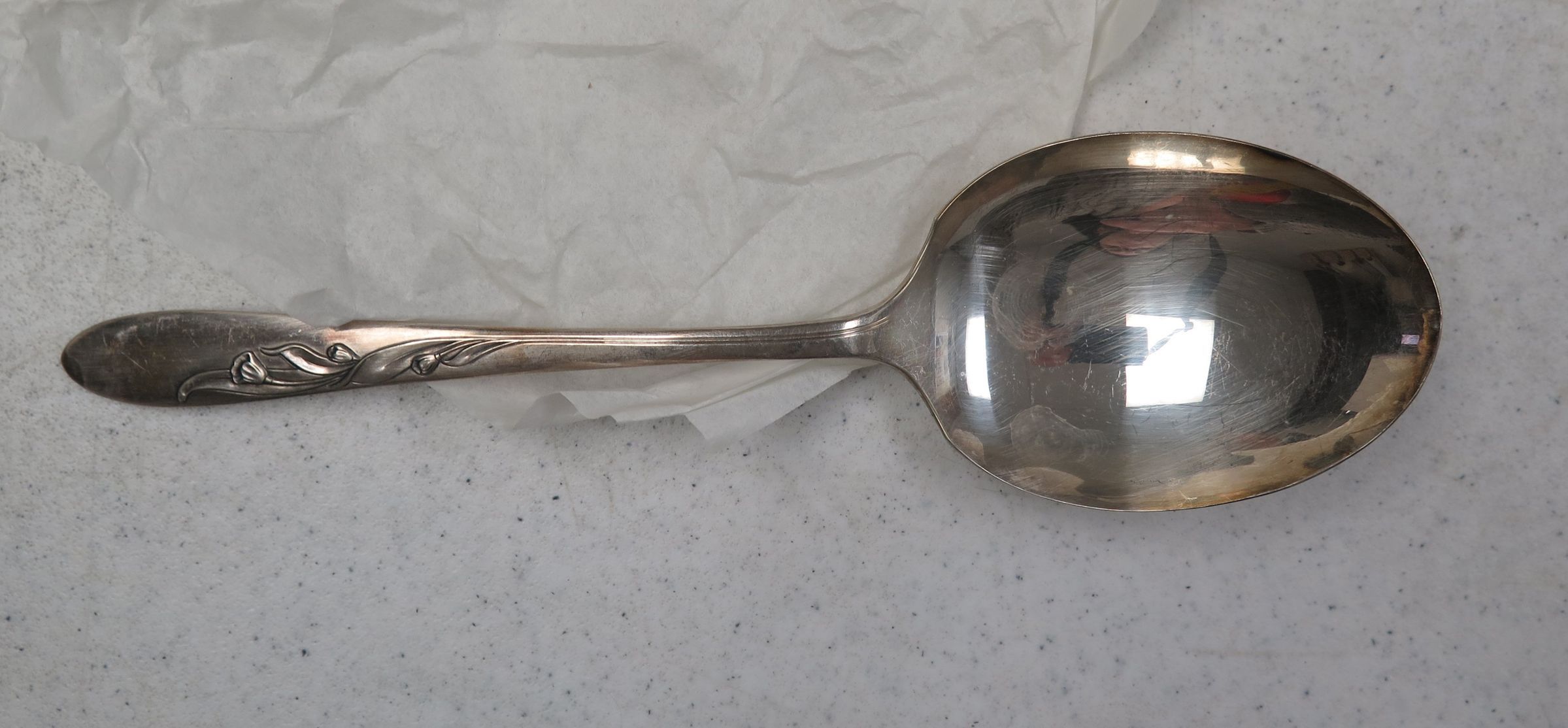 This is a silver colored serving spoon with a decorative carving on the handle. The spoon measures 2.5" (w) x 8.5" (l).