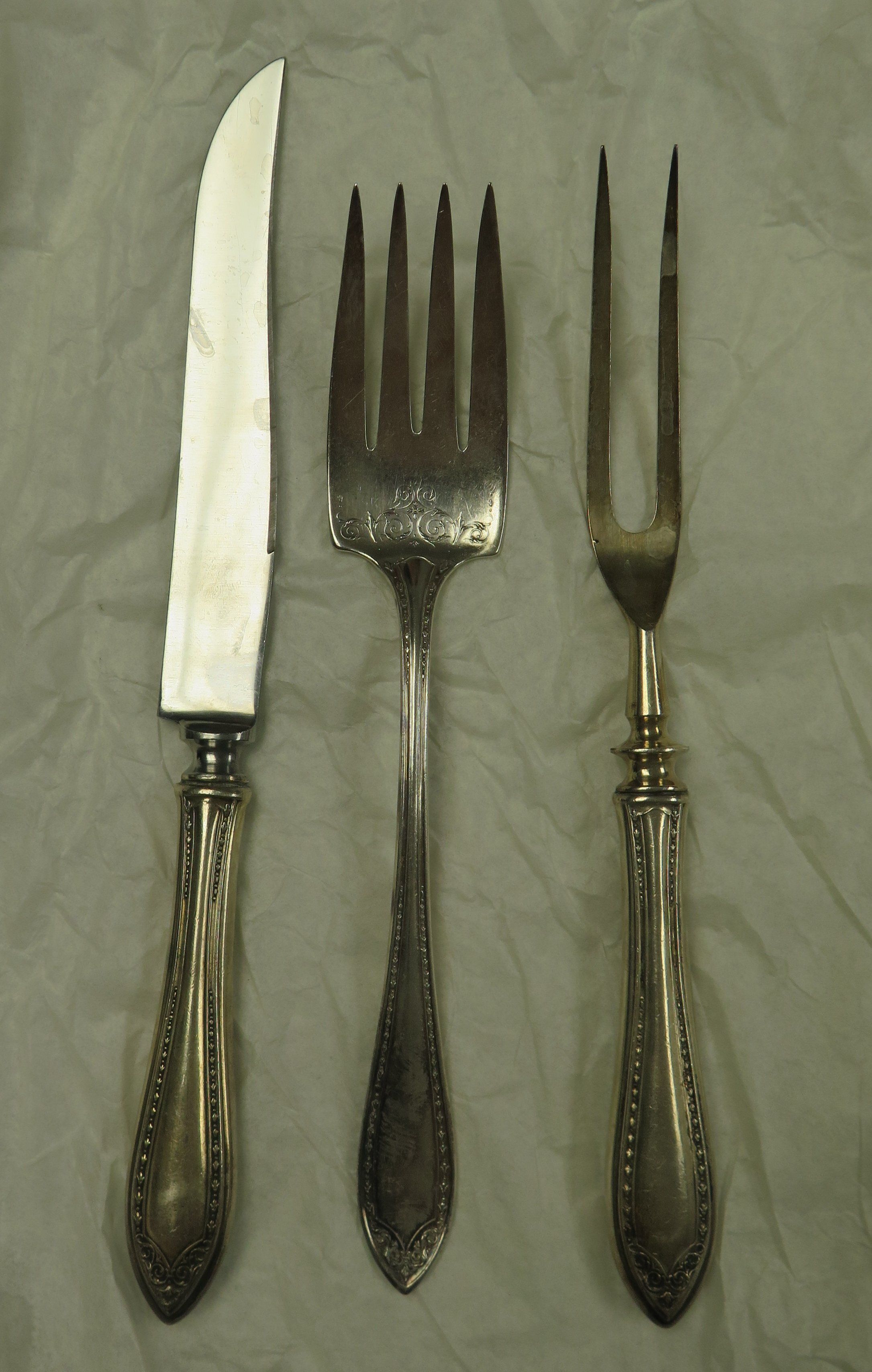 This is a metal flatware set including a meat fork, knife and fork. The utensils each measure 1.5" (w) x 10" (l).