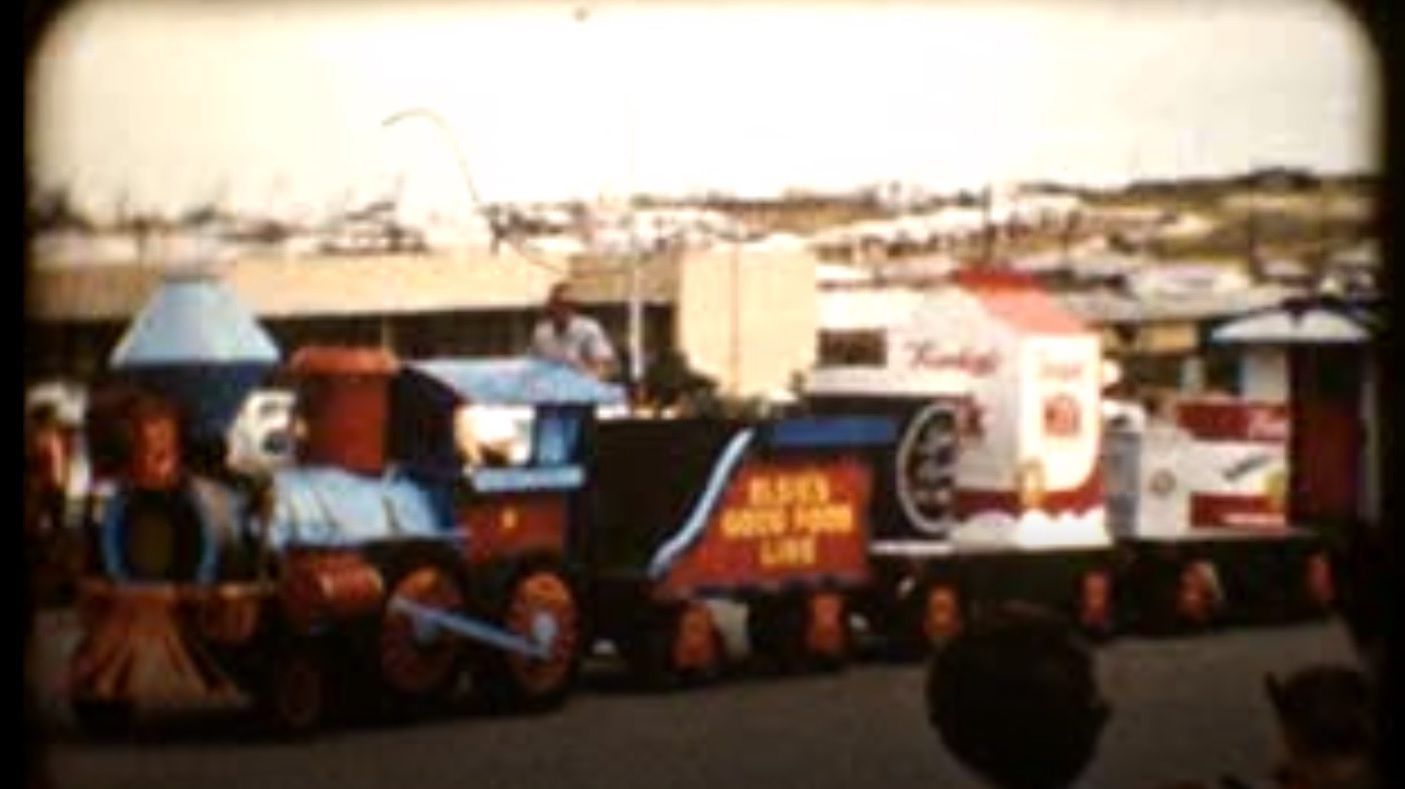 - A blue and red train float, the train reads "Else's (?) Good Food Line"