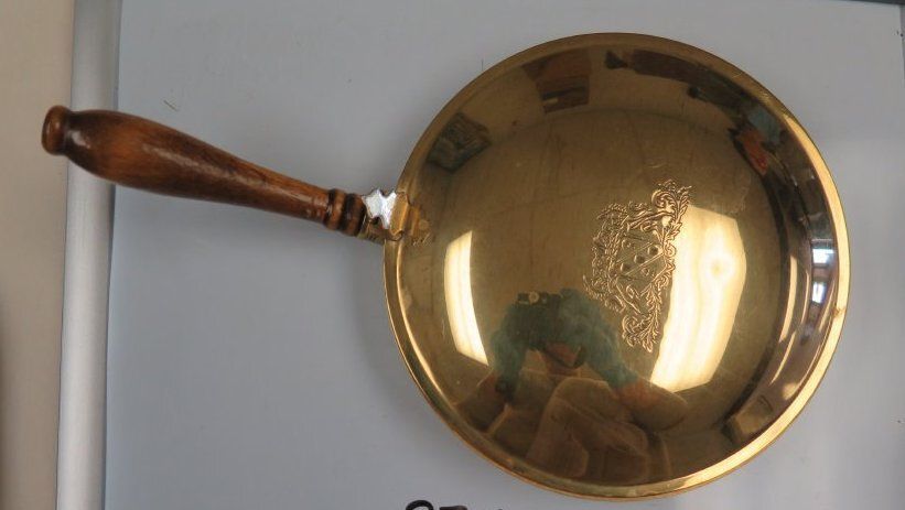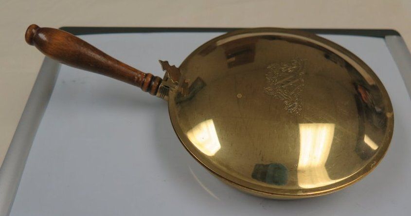 This is a brass silent butler with a wood handle. It measures 1.5"(h) x 6.5" (w) x 11" (l).