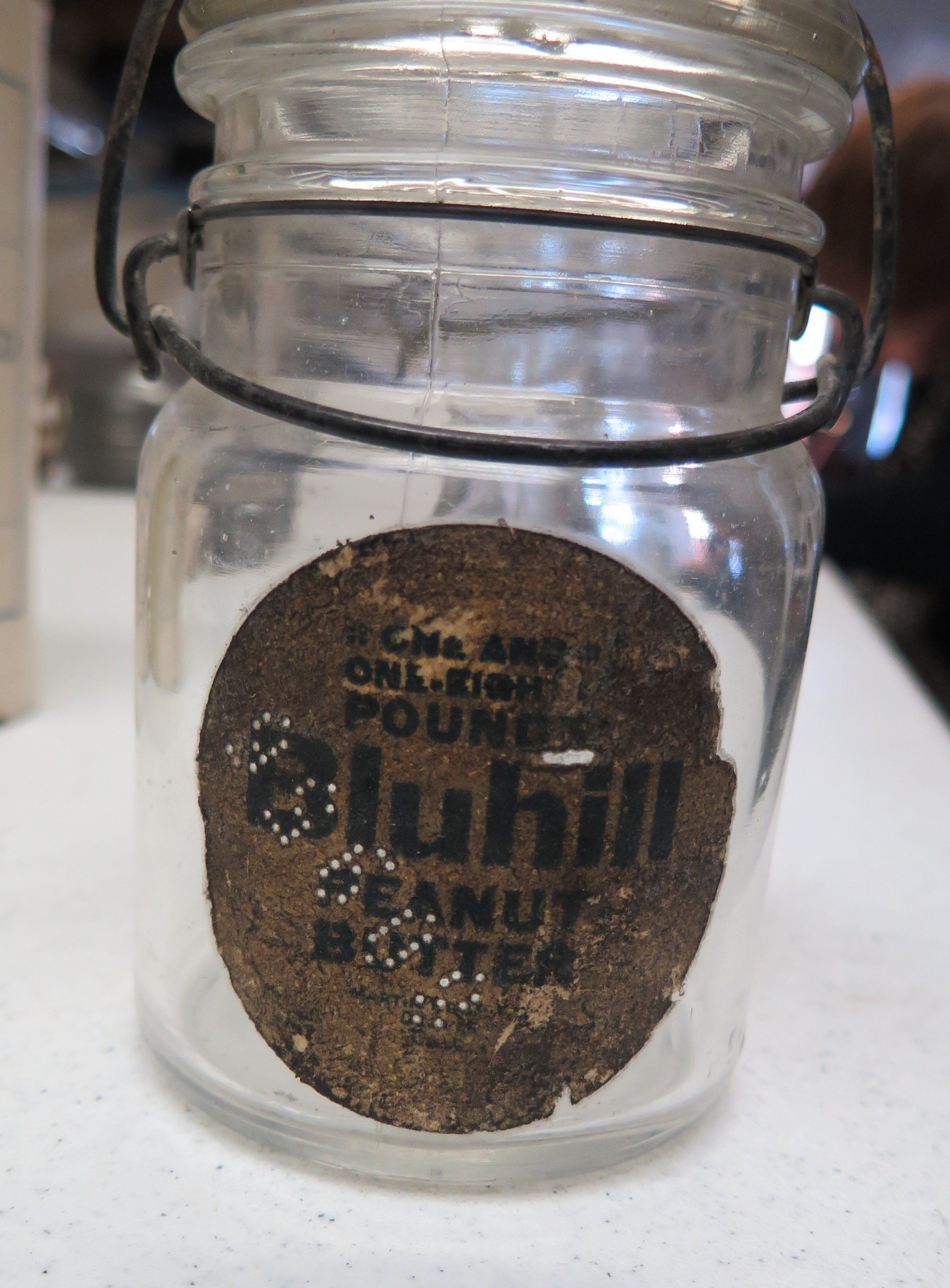 This is a clear glass jar, with a paper adhesive label. The jar has a lid with a bale-type closure 6"(H) x 3.5" jThe label reads: "Bluhill Peanut Butter "