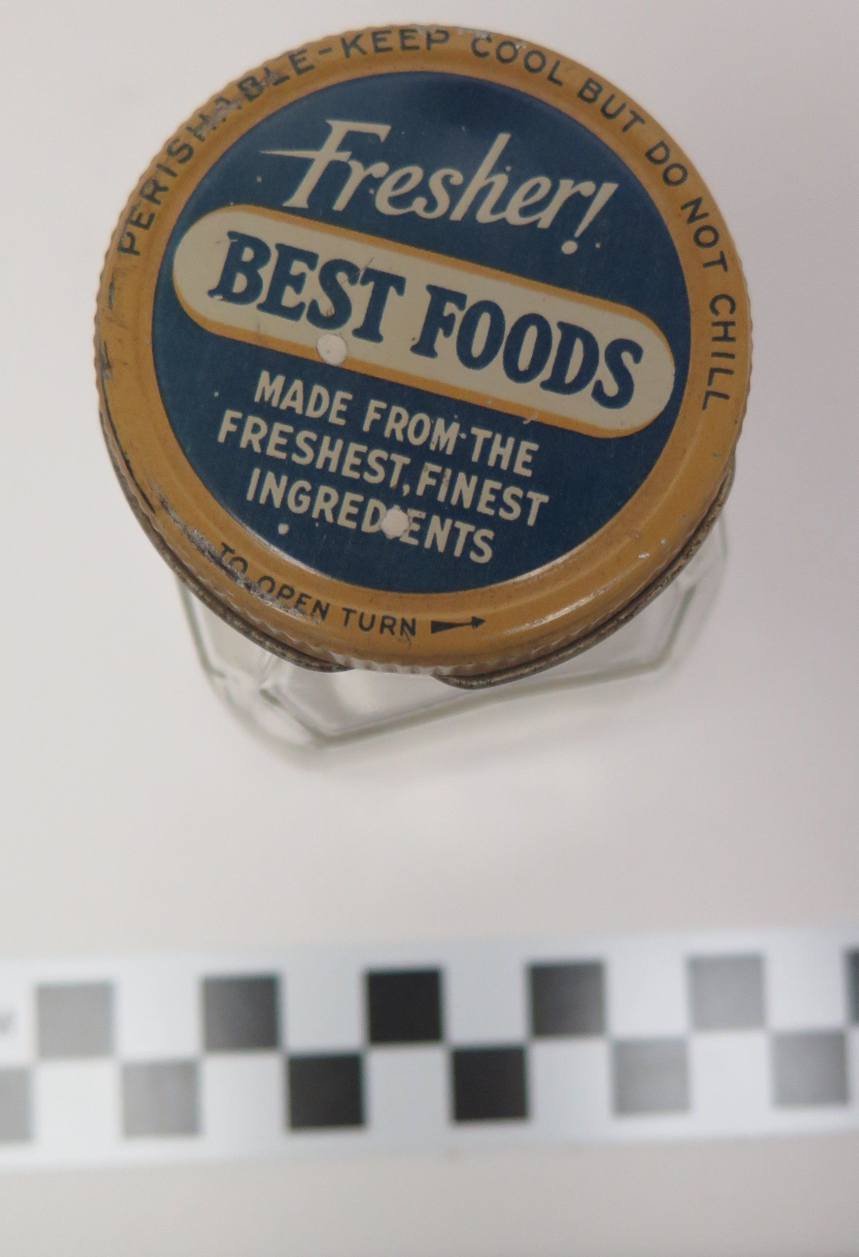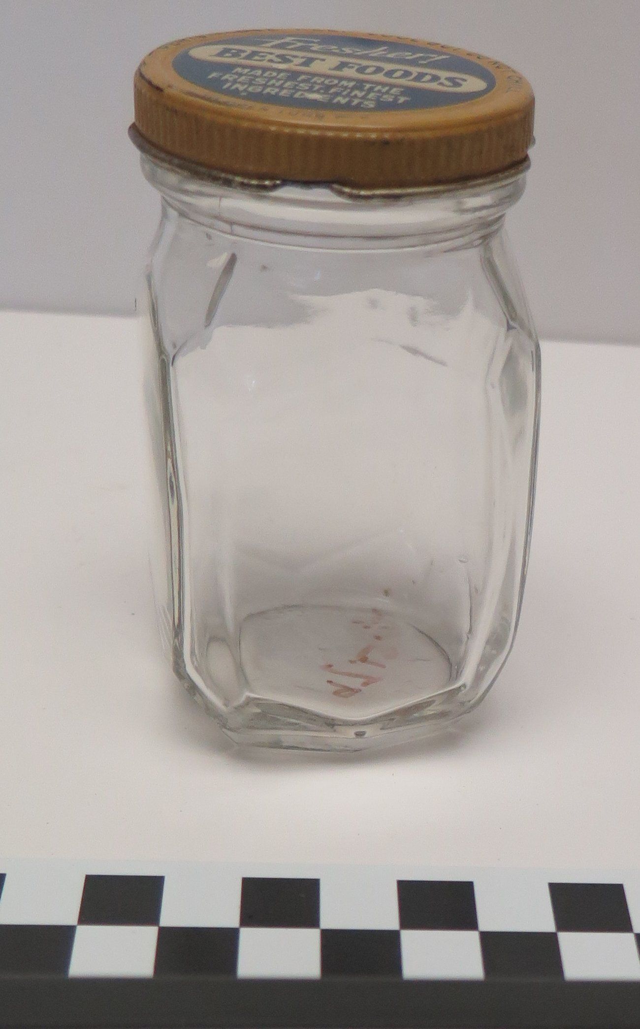 This is a clear glass jar with a screw on metal lid. This jar is square with chamfered edges. The lid is blue with a yellow rim and bears the following text in white and blue: "Fresher! Best Foods Made from the freshest finest ingredients". 3.375"(H) x 1.125"(W) x 1.125"(D)