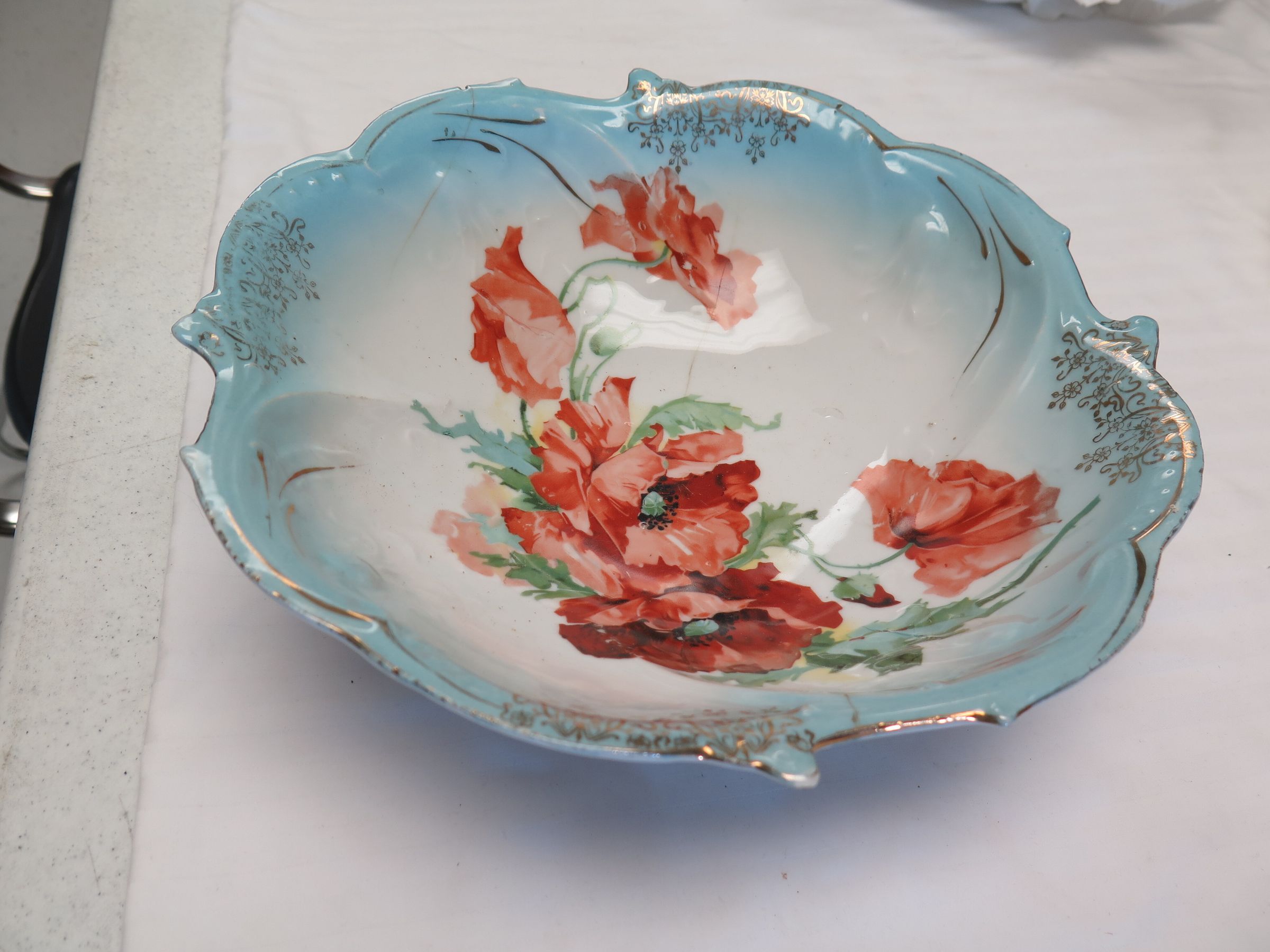 This is a white serving bowl with a blue border and the image of poppy flowers in the center. The bowl measures 3" (h) x 10.5" (dia).