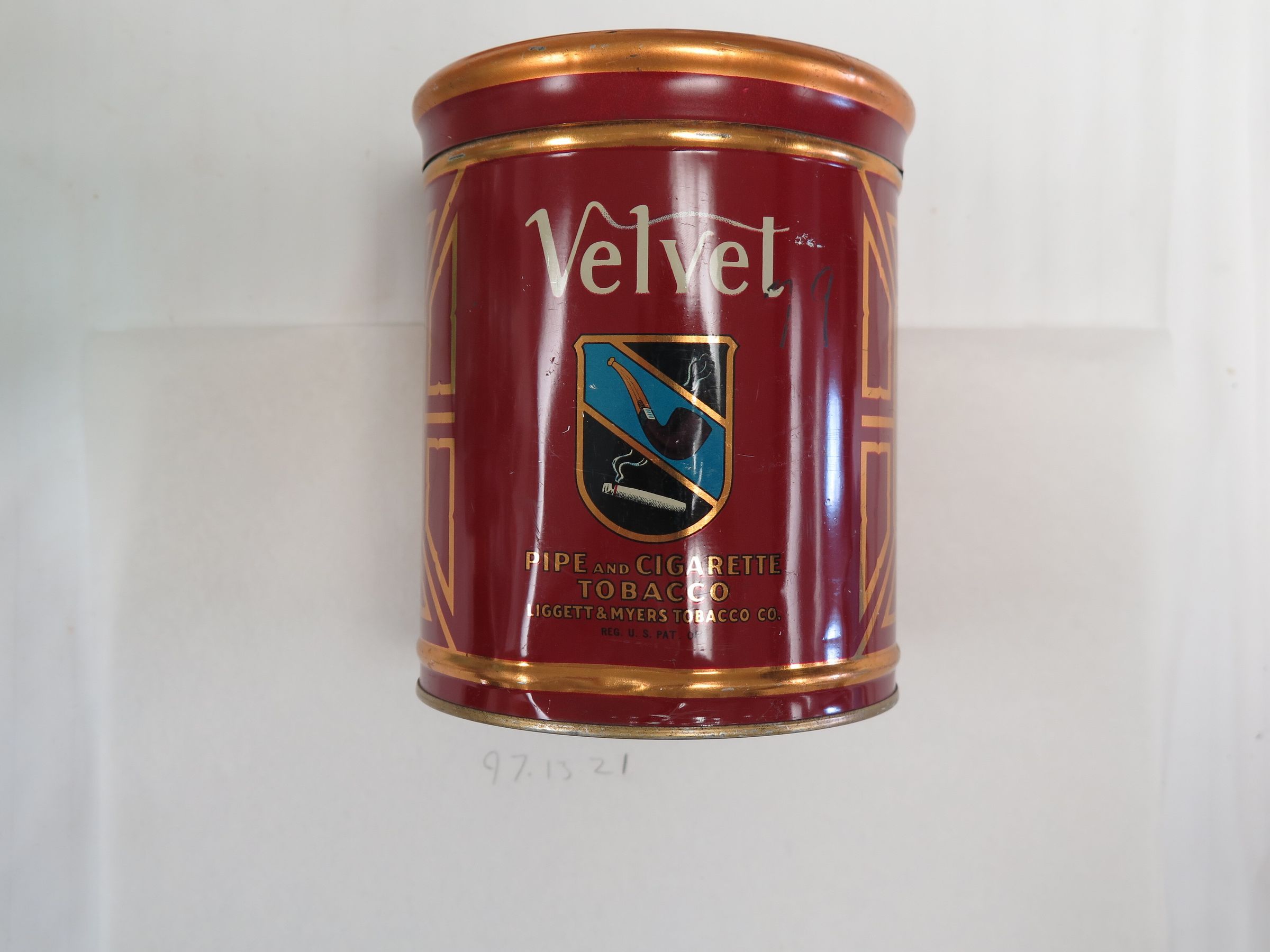 This is a red metal tin with a metal lid. The tin previously contained Velvet brand pipe and cigarette tobacco. The tin measures 5.75" (h) x 4.75" (dia).