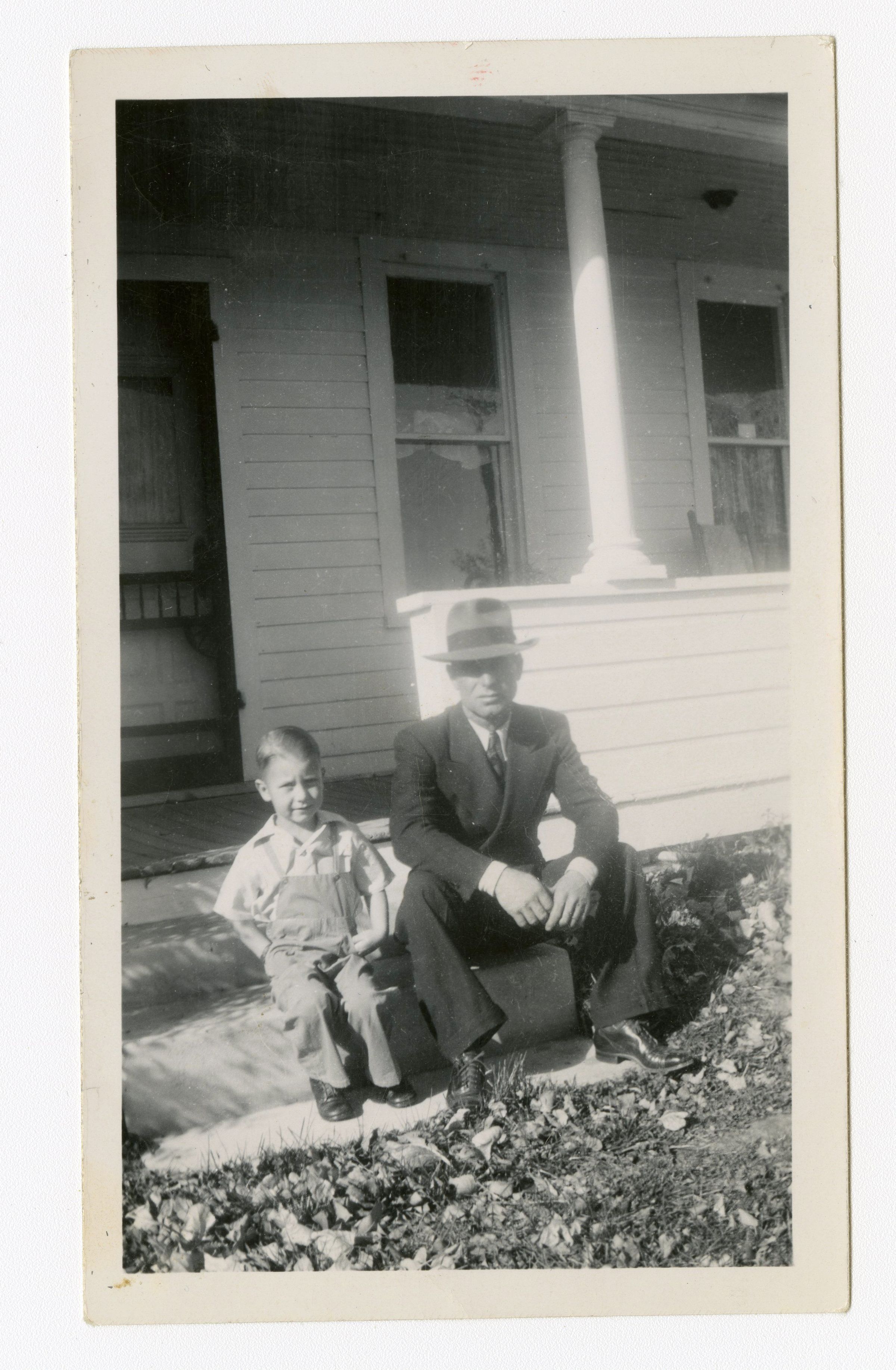 Black and white photograph of a man and a boy sitting outside of a house. The boy is wearing a white shirt and overalls. The man is wearing a dark suit. The man is Lester C Brunner and the boy is identified as Lester K Brunner. Photograph was taken at the Brunner Farmhouse.