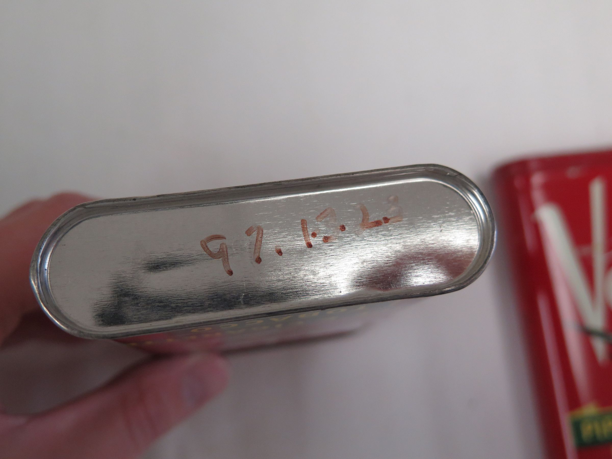 This is a set of 2 red metal tins of Velvet brand pipe and cigarette tobacco. The tins both have lids. Each tin measures 4.5" (h) x 3" (w) x 0.75" (d).