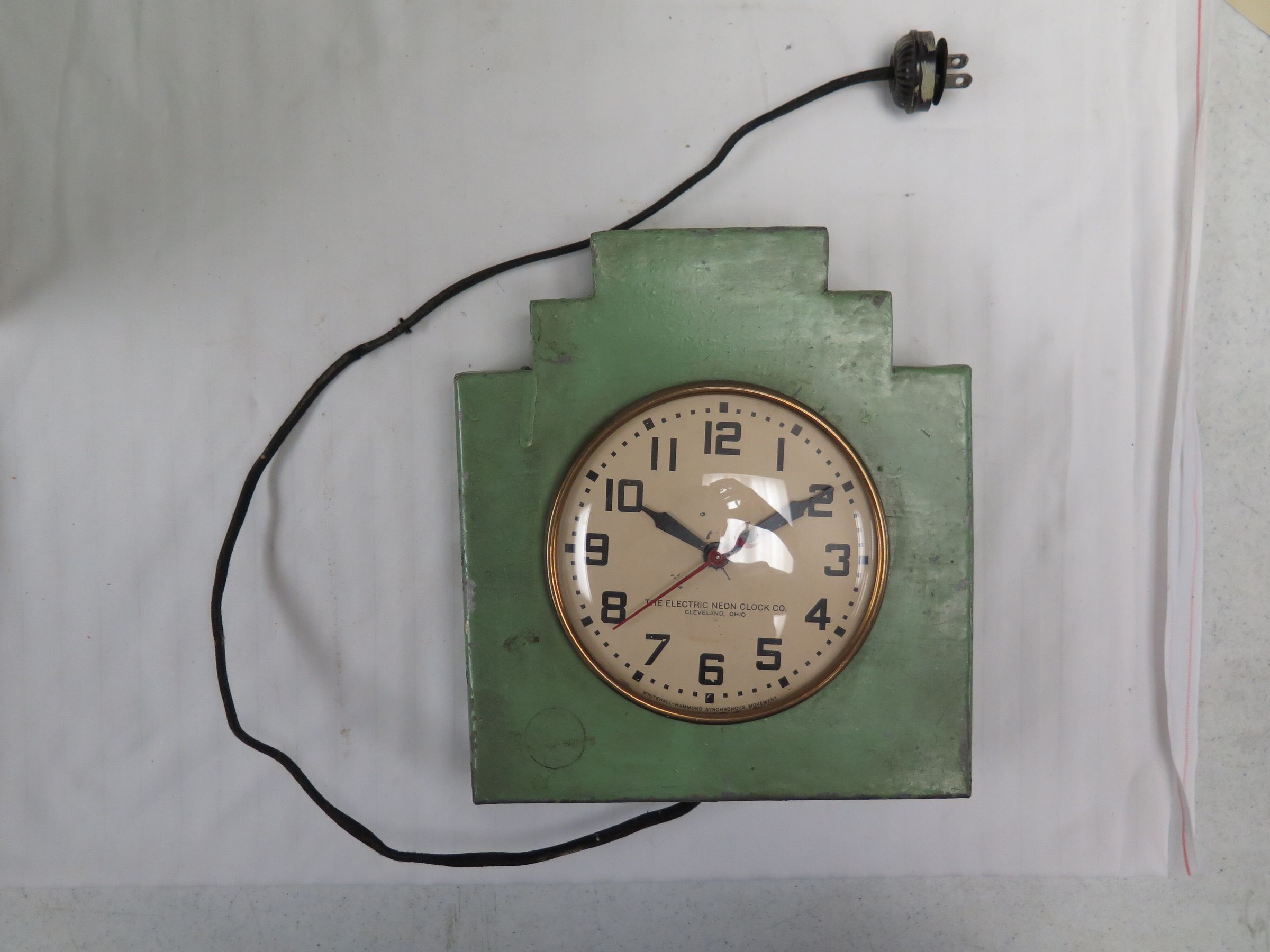 This is a green metal clock with a stair-like design on the top and a round clock face in the middle. The clock measures 9" (h) x 8" (w) x 2" (d).